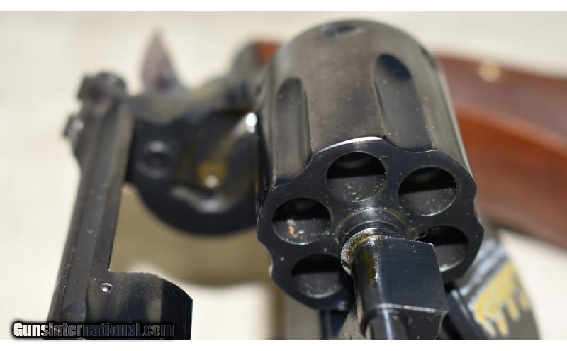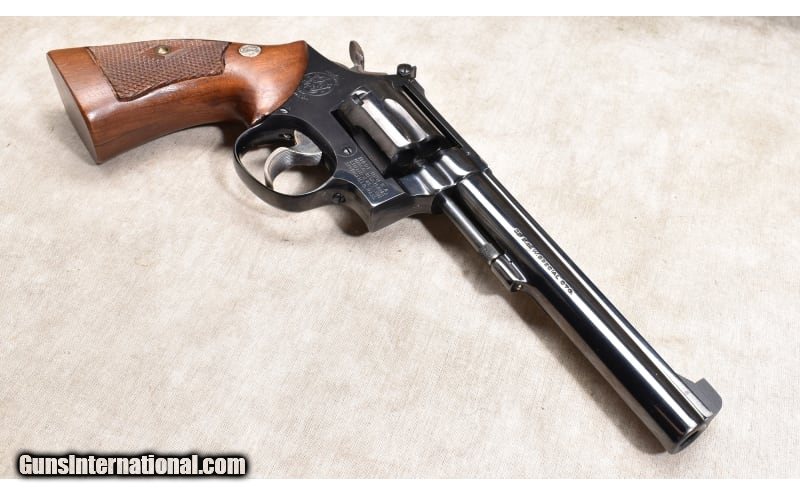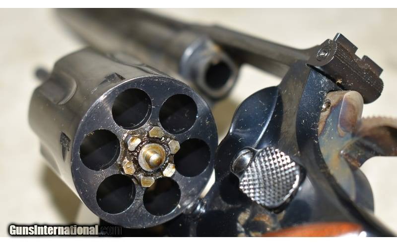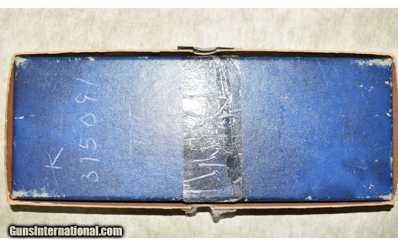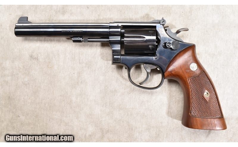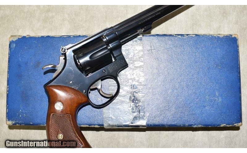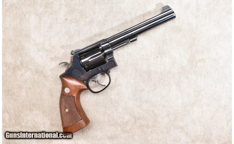 Description: Smith & Wesson made a name for themselves with the accuracy of the Masterpiece revolvers. They are known for accuracy and reliability. This one features heavy target grips, wide grooved trigger, wide target hammer, and target sights. It does not appear to have been fired, but it does have a faint turn line, and could pass for new. .38 S&W Special SOLD Chambers: 6 rounds Metal Condition: Excellent. Wood Condition: Excellent. Bore Condition: Shiny and bright with crisp rifling. Barrels: 6 inches Triggers: Factory double and single action trigger. Butt Pad: Oversize checkered walnut grips Weight: 38 Ounces Sights: Patridge and adjustable notch target sights Item Location: Rogers |