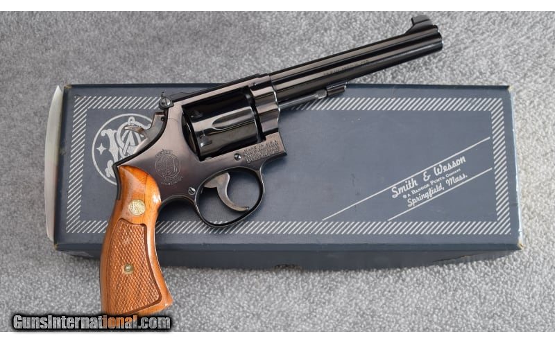 Description: This Smith & Wesson Model 14-3 is in excellent overall condition showing very little use. There is a small chip on bottom right edge of grips and a very light drag ring on cylinder. Gun has excellent blue and bore. Complete with original box with label, paperwork and cleaning kit! Beautiful gun! .38 S&W Special SOLD Metal Condition: Excellent Wood Condition: Excellent Bore Condition: Excellent Barrels: 6" Solid Rib Triggers: Factory - Double Action Butt Pad: Checkered Walnut Grips with S&W Medallion Weight: 38 oz Sights: Patridge Front - Adjustable Square Notch Rear Item Location: Wheeling |