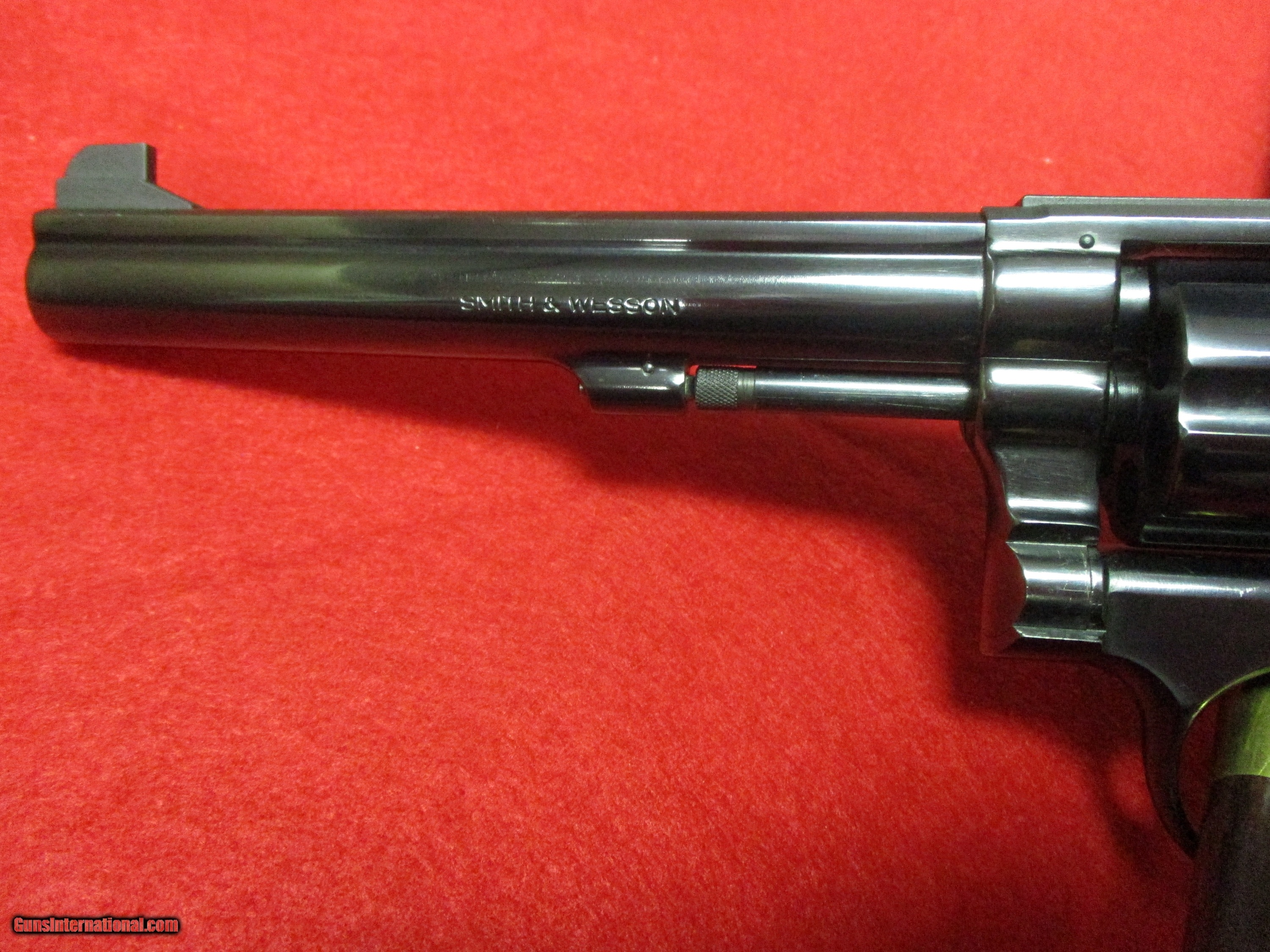 Description: The K-38 Target Masterpiece was introduced in 1946-7 and produced under that name until 1957. Afterward it was renamed the Model 14 and produced until 1982. It used the same square butt K frame as the M&P .38 (Pre-Model 10). Like the M&P, the Target Masterpiece’s ejector rod is unshrouded. It uses a 6-inch pinned and ribbed barrel with a 1/8” Patridge front sight on a plain ramp base. The rear sight is a Micrometer-click adjustable type. The front strap and backstrap have the standard 10-groove serrations. The 14 here has a .500-inch target hammer and a .500-inch serrated target trigger. The serial number indicates the year of production to be 1973, according to the Standard Catalogue of Smith & Wesson, 4th Edition. The Model 14 is most remembered for its role as the sidearm of LAPD Officers Malloy and Reed in the TV show Adam 12 for seasons 1 and 2. They were later issued the Model 15 for season 3 and onward which was true for the LAPD as well. The change to the 15 with its 4-inch barrel allowed police officers to draw their revolvers faster at the cost of a slight reduction in accuracy. The 14 as shown has a nearly unnoticeable amount of holster wear at the very tip of the barrel. The bore is in excellent condition and is spotless. It appears to have not been used a great deal, which is supported by the light turn ring around the cylinder. The cylinder lockup is very tight. The hammer and trigger do have a small amount of finish wear. If not used for target competition, the 14 would be suited to plinking or teaching a new shooter how to use a revolver. It would also be useful for home defense. The 38 Special round it is chambered for is well suited for all these tasks and is available in a wide variety of bullet types and loads. SOLD Manufacturer: Smith & Wesson Model: 14-3 Target Masterpiece Serial Number: 3K29877 Caliber Info: .38 Special Bore: Rifled Chambers: 6 Ejectors: Hand Ejector Condition: Used - Excellent Cond. Metal Condition: Excellent Wood Condition: Excellent Bore Condition: Pristine Barrels: 6 inches (152mm) Barrel Type: Ribbed Action: Double/Single-Action Triggers: .500-inch target trigger Stock: K-frame Magna Stock Rib: Serrated Finish: Blued Sights: 1/8" Patridge front, Micrometer-click rear Manufacture Date: 1971 |