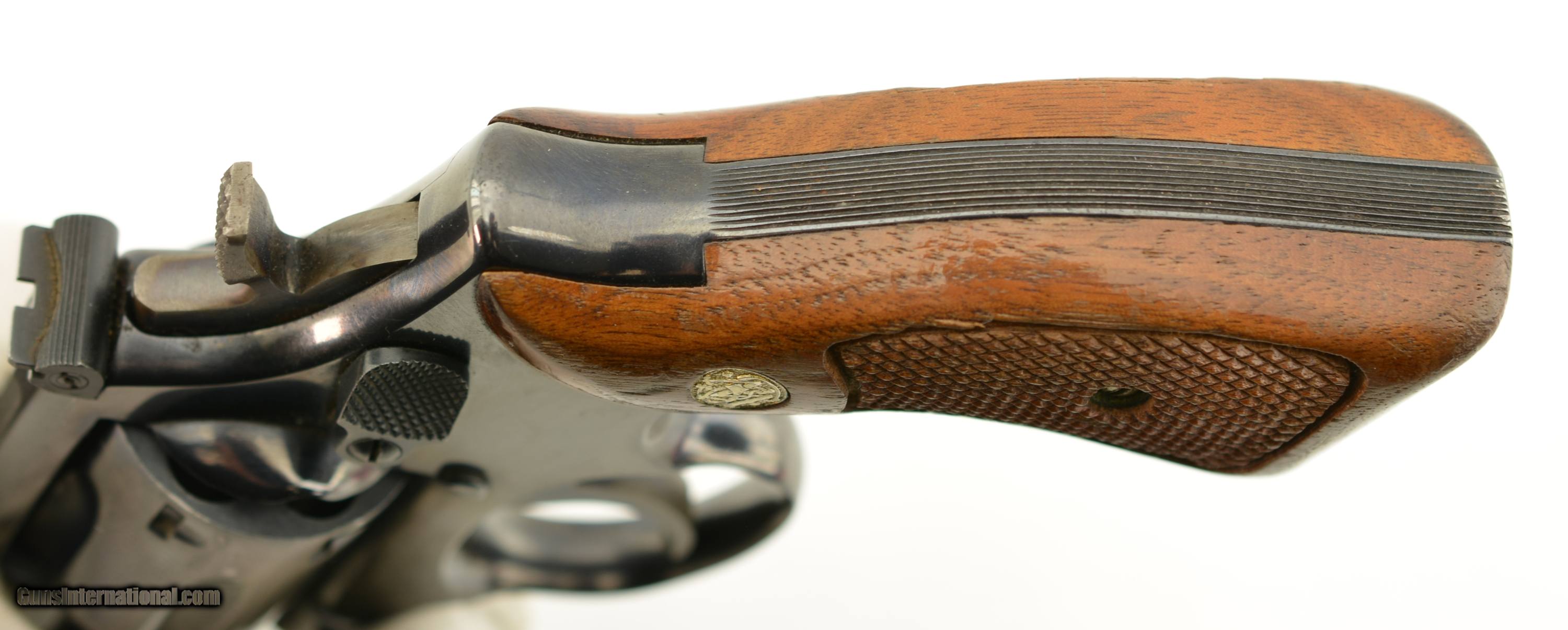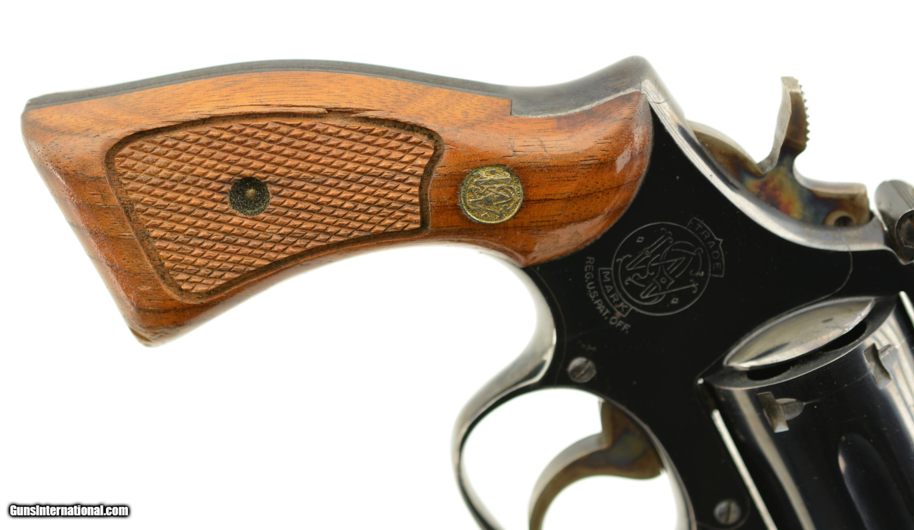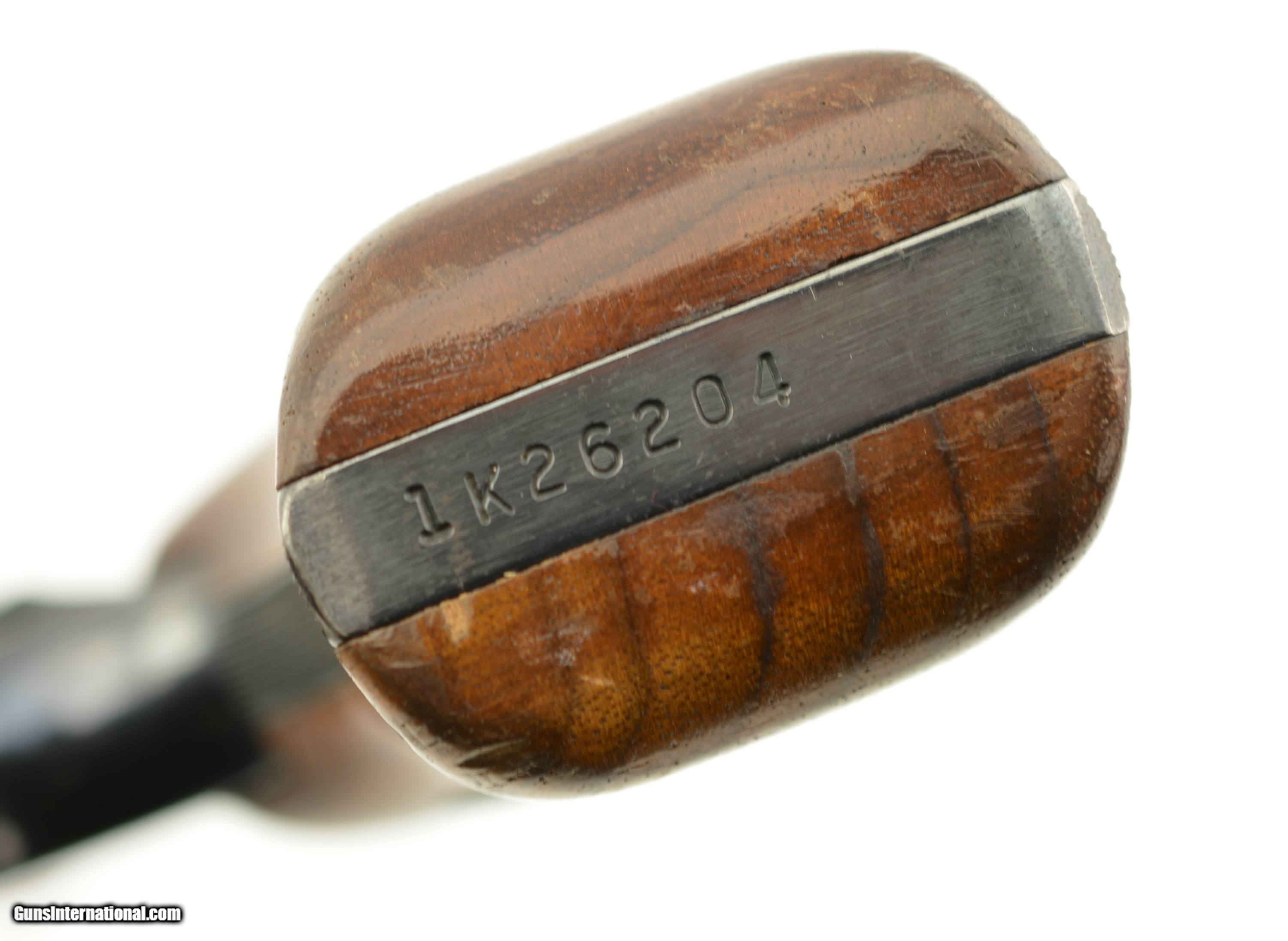 Description: Serial #1K26204, .38 Special, 2" barrel with a fine, bright bore that has a touch of freckling within the grooves at the breech. This is a handsome revolver that has retained 95-97% of the original blue finish with some scattered spots of gray fading, mostly on the cylinder and at the muzzle. Additionally, there is a light turn-ring, and the hammer and trigger retain nearly all of their original bright color case-hardening. The checkered S&W medallion grips are in very good-fine condition with some flattening of the points, as well as a few small spots of finish wear and minor surface scratches on either panel. The lock-up is tight, and the action functions flawlessly. This is a splendid K-frame snub-nose, and is in fine-near excellent condition overall. FFL SOLD Manufacturer: S&W Model: 15 Serial Number: 1K26204 Caliber Info: .38 Spl Gauge Info: .38 Spl |