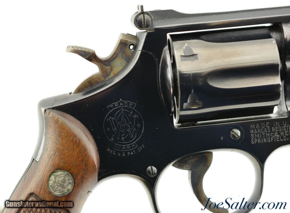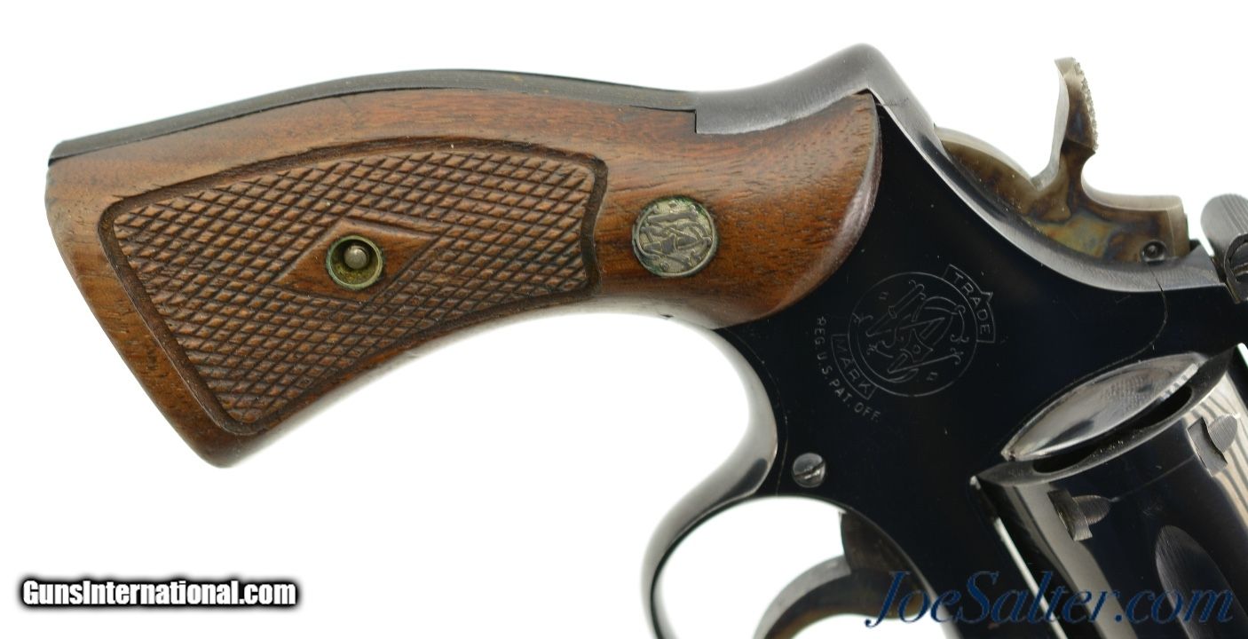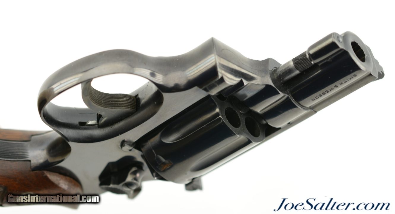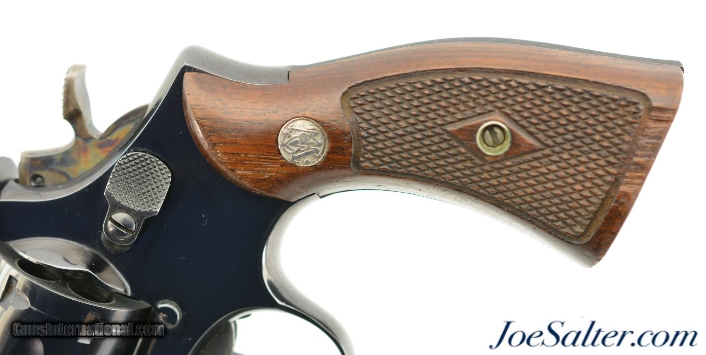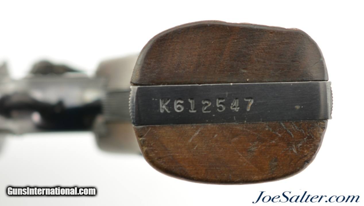 Description: Serial #K612547, .38 Special, 2 inch heavy pinned barrel with a bright, excellent bore. This is the Smith & Wesson Model 15-2, the K-38 Combat Masterpiece revolver manufactured between 1964-67 featuring a serrated trigger, a rare option as identified by Supica & Nahas in The Standard Catalog of Smith & Wesson. In excellent condition the barrel and frame retain about 95-97% of the original blue finish with some silvering on the high edges, a very slight turn ring and very mild use marks. The trigger and hammer show generous amounts of case color. The Diamond Center Checkered Walnut, Square Butt grips are numbered to a different gun but remain in near excellent condition with some flattening of the points and some missing chips to the bottom of the left stock. Overall an excellent K-38 combat Masterpiece. FFL or C&R SOLD Curio/Relic: Yes |