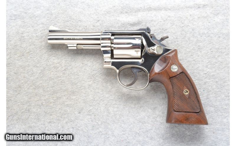 Description: This Smith & Wesson Model 15-3 is a nickel plated 6 shot K-frame double action revolver in .38 Special Cal. It has a 4 inch barrel. A raised blade front sight and an adjustable notch rear sight. The grip is a diamond checkered walnut with silver S& .38 Special SOLD Caliber Info: .38 Special Chambers: 6 shot fluted high gloss nickel plated. Metal Condition: Excellent. A couple of very minor surface marks. Wood Condition: Excellent. Barrels: 4 inch high gloss nickel plated. Triggers: Single Action / Double Action. Grooved. Sights: Raised blade front. Adjustable notch rear. Item Location: Noblesville, IN |