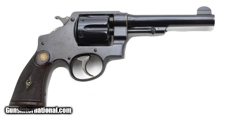 Description: Smith & Wesson 1917 .45ACP caliber revolver. U.S. Army issue. Model 1917. Bore has strong rifling and has frost in the grooves. Gun has approximately 90% blue (grip straps are patina, the rest of the gun has very good blue). Action works perfectly. Grips are very good, no cracks or chips.