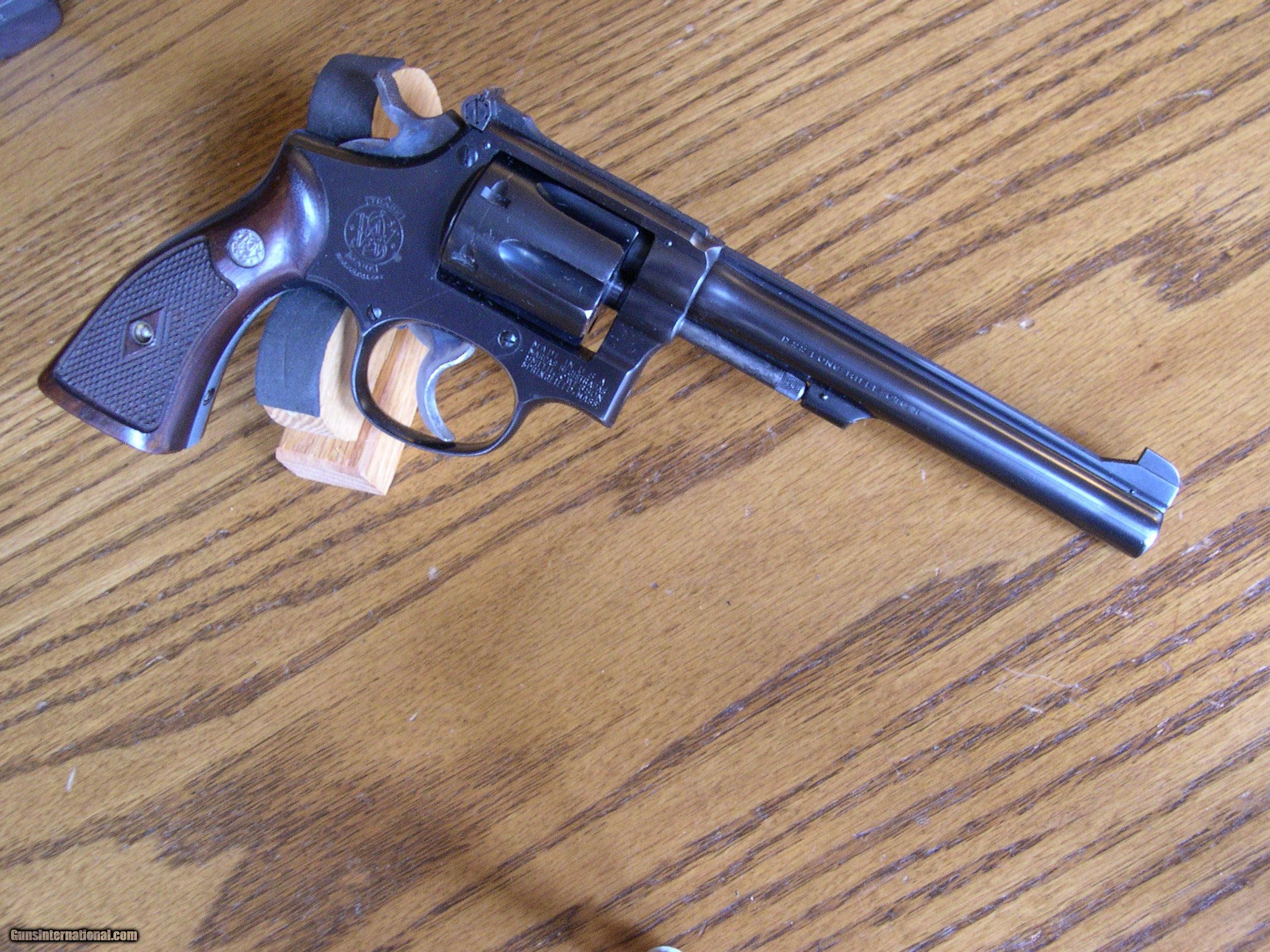 Description: With five screw frame and 98% orig satin blue,made in 1953 perfect grips with matching #, 6"bbl, EXC bore, gun has been used very little, case colors are 98%, SER# k 182XXX, last year for 5 screw frame 22 calibers, comes with blue box with same # writte on label, not sure it is original box, has tape in several spots on box!! Very light cylinder turn ring!! A great collectable!! SOLD |