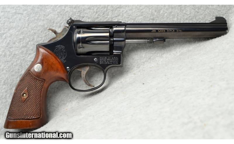 Description: A fantastic vintage Smith & Wesson, prefect for competition, plinking, or small game hunting. .22 Long Rifle SOLD Chambers: .22 Long Rifle Metal Condition: "Excellent, the gun has some light marks from use. Wood Condition: "Excellent, the wood has some small handling marks. Bore Condition: "Excellent, bore is bright and shiny. Barrels: 6 inch Weight: 2 lb 8 oz Sights: "Adjustable Rear, fixed front sight. Item Location: Cheektowaga, NY |