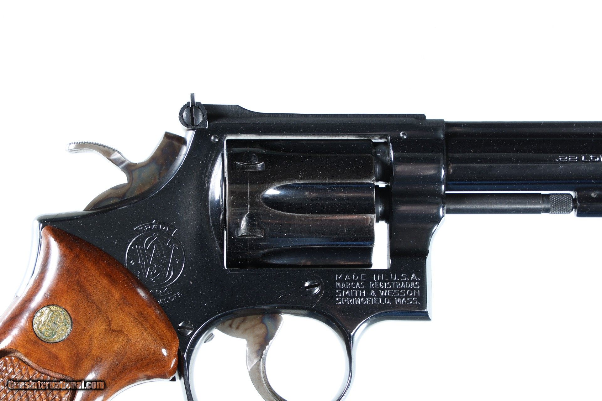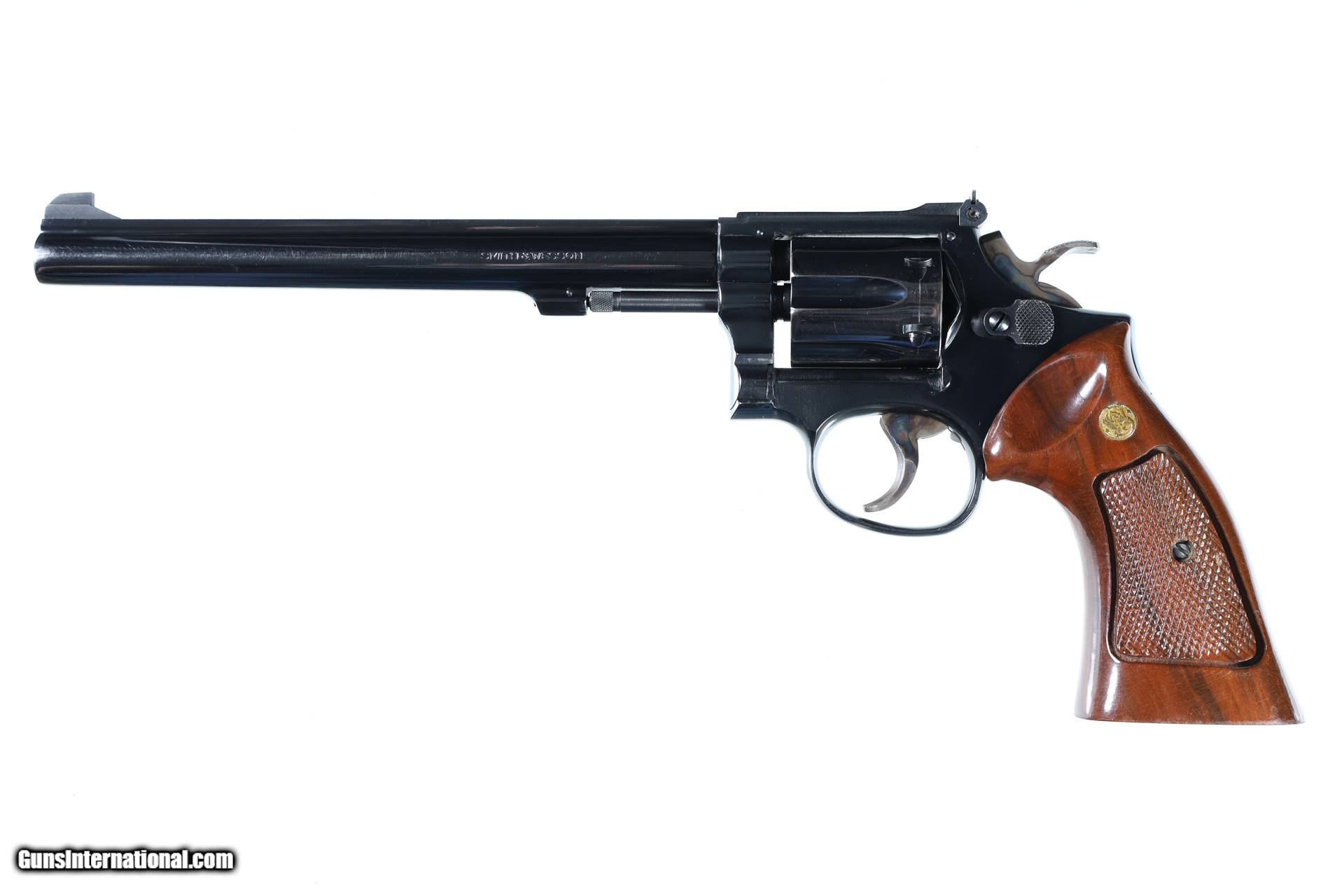 Description: Near excellent overall condition. Mfd 1978 The Smith & Wesson Model 17-4 Revolver is an exceptionally accurate six-shot, double-action .22 caliber revolver highlighted by an extended barrel. This medium-sized K-frame construction is composed of a diamond checkered walnut grip with a glossed finish and Smith & Wesson medallions embedded on each side, contoured thumb rest on the left-side, a color case hardened finish to the hammer and serrated trigger, and a blued frame, cylinder, and barrel. This revolver is zeroed with a micrometer click adjustable rear sight and a fixed front sight ramp. The right-side of the barrel is marked ".22 Long Rifle C.T.G.", while the right-side of the frame is marked "Made in U.S.A. - Marcas Registradas - Smith & Wesson - Springfield, Mass." beneath the cylinder. The Smith & Wesson trademark and logo are located to the rear of the cylinder on the right-side. • Free Shipping, No Credit Card Fees. • Most Alt-Coins Accepted! XRP Perferred. • Per Direct transfer from your Wallet to Ours. • Lay-a-way available for this firearm. • 1/3 Down, a 1/3 in 30 Days 1/3 in 60 Days. SOLD Manufacturer: Smith & Wesson Model: 17-4 Serial Number: 31K0681 Barrel Length: 8-3/8 |