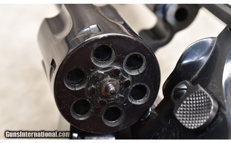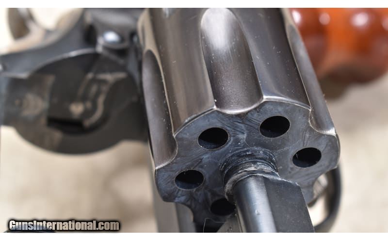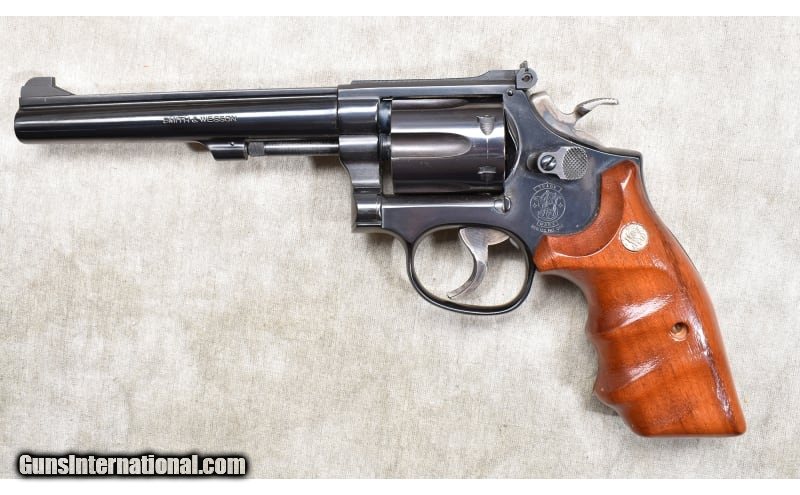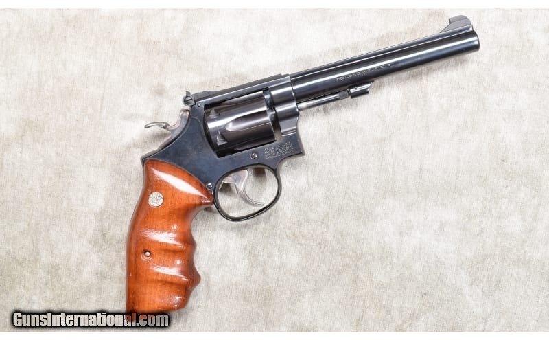 Description: Nice target revolver featuring wide hammer spur, wide trigger, nice blue, and little wear. .22 Long Rifle SOLD Chambers: 6 rounds Metal Condition: Very good. There is a faint turn line. Wood Condition: Very good. Bore Condition: Shiny and right with good rifling. Barrels: 6-inch Triggers: Factory double and single action trigger. Butt Pad: Hardwood finger groove grips with S&W medallions. Sights: Post and adjustable notch open sights. Item Location: Rogers |