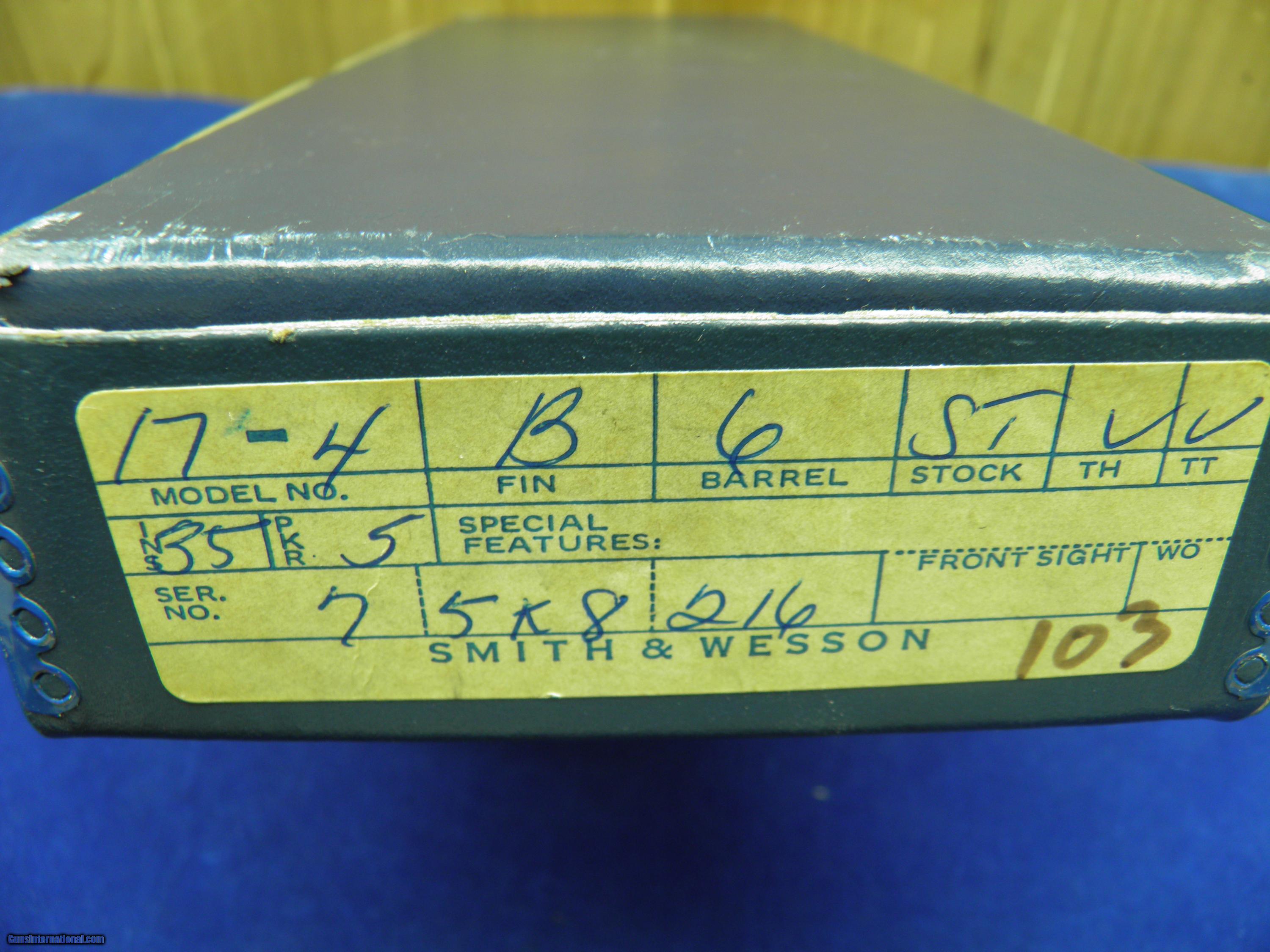Description: SMITH WESSON MODEL 17-4 , 22LR, 6" BARREL, K TARGET FRAME, TARGET HAMMER AND TRIGGER, MICRO CLICK ADJUSTABLE REAR SIGHT, PARTARIDE FRONT, CHECKERED WALNUT GRIPS WITH S&W MEDALLIONS, BEAUTIFUL BLUEING. "CONDITION" HIGHLY COLLECTABLE 99.5%++ INCLUDES ALL PAPER WORK, TOOLS AND FACTORY BOX! SOLD |