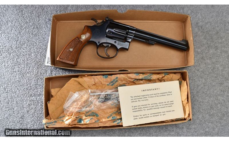Description: This Smith & Wesson model 17-3 shows very little use, with only a very light drag ring on the cylinder. Comes with original box and paperwork. .22 Long Rifle SOLD Metal Condition: Excellent Wood Condition: Excellent Bore Condition: Excellent Barrels: 5 7/8" Ribbed Triggers: Wide Target Trigger - Wide Target Hammer Stock Dimensions: Checkered Wood With Smith & Wesson Medallion Grips Weight: 38 oz. Sights: Patridge Front Sight - Adjustable Square Notch Rear Sight Item Location: Wheeling |