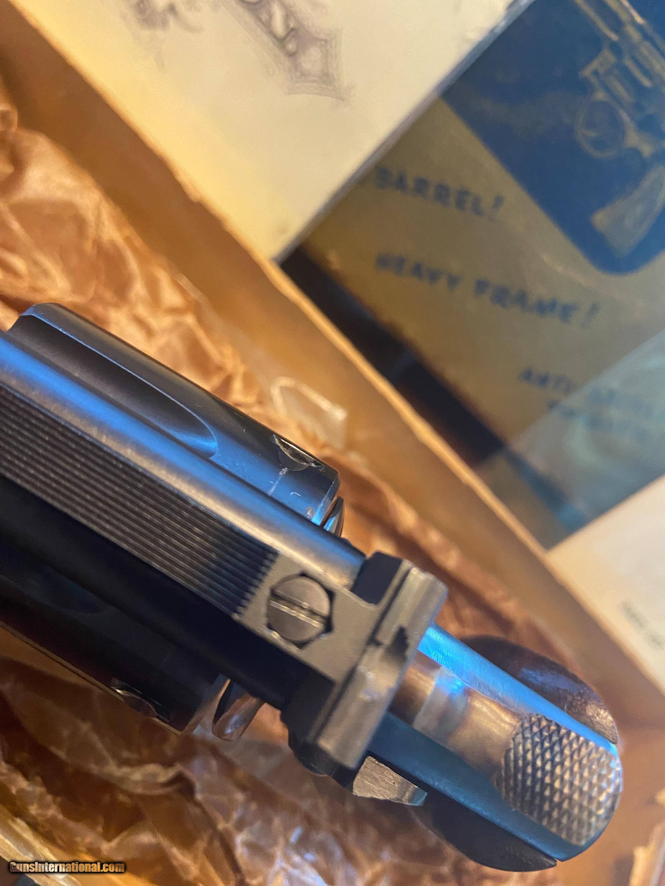 Description: FABULOUS PRE-17 K22 -- 5 SCREW -- PINNED 6" BARREL -- FANTASTIC ORIGINAL CONDITION INCLUDING VIBRANT BLUE AND COLOR -- VERY LIGHT DRAG MARK ON CYLINDER -- UNFIRED -- FACTORY TOOLS , PAPERWORK AND LETTER -- BOX IS IN EXCELLENT CONDITION SANS A TAPE MAR FROM STORAGE -- CORNERS CRISP AND UNDAMAGED --- COLLECTOR QUALITY!!!!!!!!!!!!!!!! SOLD Handgun Caliber: .22 Long Manufacturer: SMITH & WESSON Model: K22 MASTERPIECE Barrel Length: 6 Condition: EXCELLENT AS NEW Metal Condition: EXCELLENT AS NEW Wood Condition: EXCELLENT AS NEW Finish: BLUE / CASE COLOR Sights: TARGET |