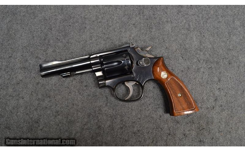 Description: This revolver is a Smith & Wesson Model 18-3 chambered in .22 LR. It has a fixed front Baughman sight and adjustable notch rear sight, 4 inch pinned barrel, recessed cylinders, case-hardened target hammer and trigger, blued metal, and original factory checkered square butt magna grips with S&W medallions. It is in overall great condition with some loss of bluing at left and right sides of muzzle end. It comes with the original factory box, including oil paper and Parts List, Instructions for Use, Maintenance and Specifications sheet and tools (includes screwdriver, looped brush rod and two brushes). It also comes with a leather holster. .22 Long Rifle SOLD Chambers: 6 Rounds Metal Condition: "Bluing in generally good condition, some wear at muzzle end Wood Condition: "Original factory wood checkered grips good condition, does show a couple of mars on bottom of wood grips Bore Condition: Bright and shiny crisp rifling Barrels: 4 inch barrel Triggers: Case hardened hammer and target trigger Stock Dimensions: 9½ inches overall length Weight: 2 lbs 2 oz Sights: "Fixed front Baughman sight, adjustable rear sight Item Location: Wichita, KS |