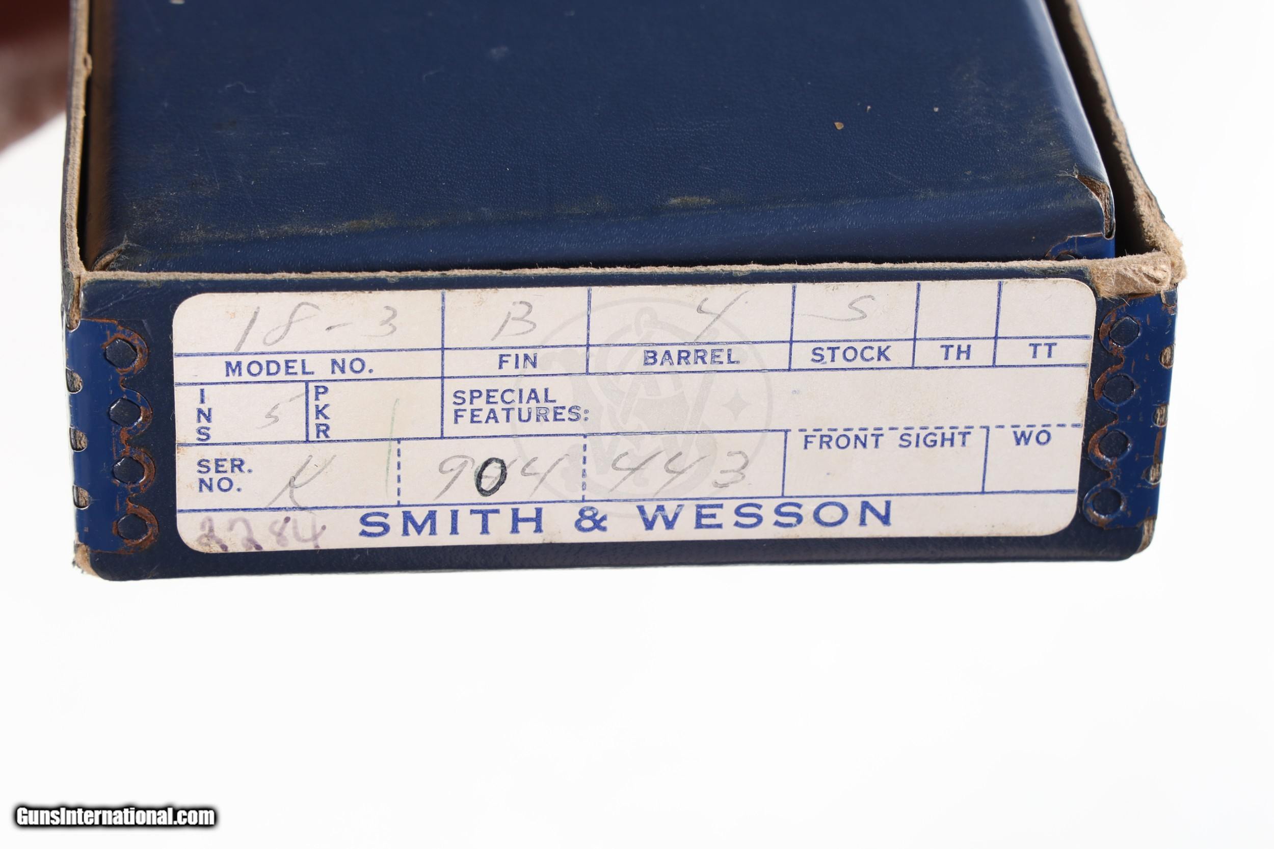 Description: Excellent plus overall condition with factory box renumbered to gun. Manufactured in 1969. • Free Shipping, No Credit Card Fees. • Lay-a-way available for this firearm. • 1/3 Down, a 1/3 in 30 Days 1/3 in 60 Days. SOLD Curio/Relic: Yes Manufacturer: Smith & Wesson Model: 18-3 Serial Number: K904443 Barrel Length: 4 |