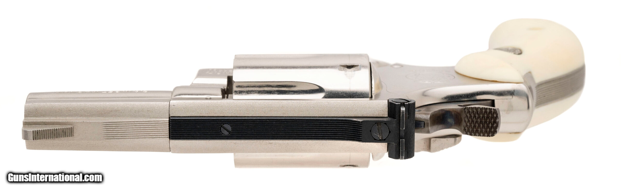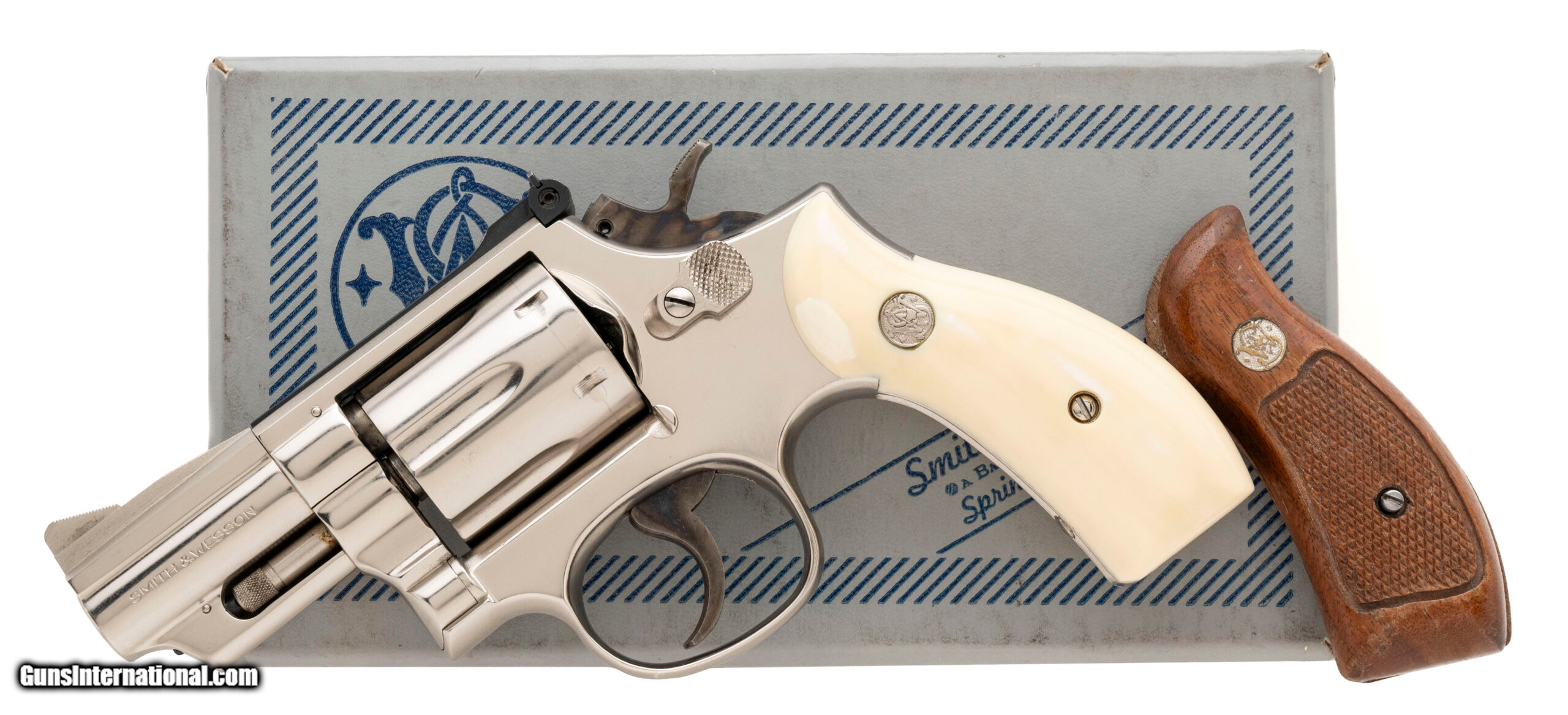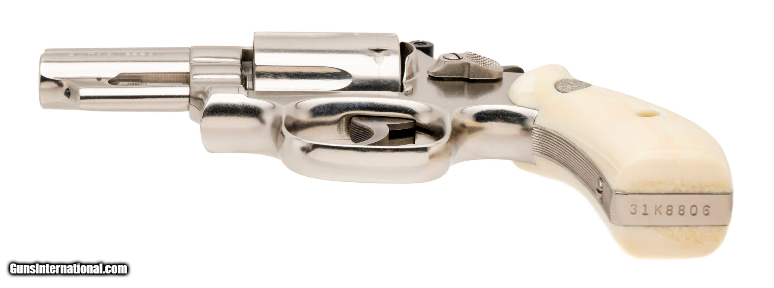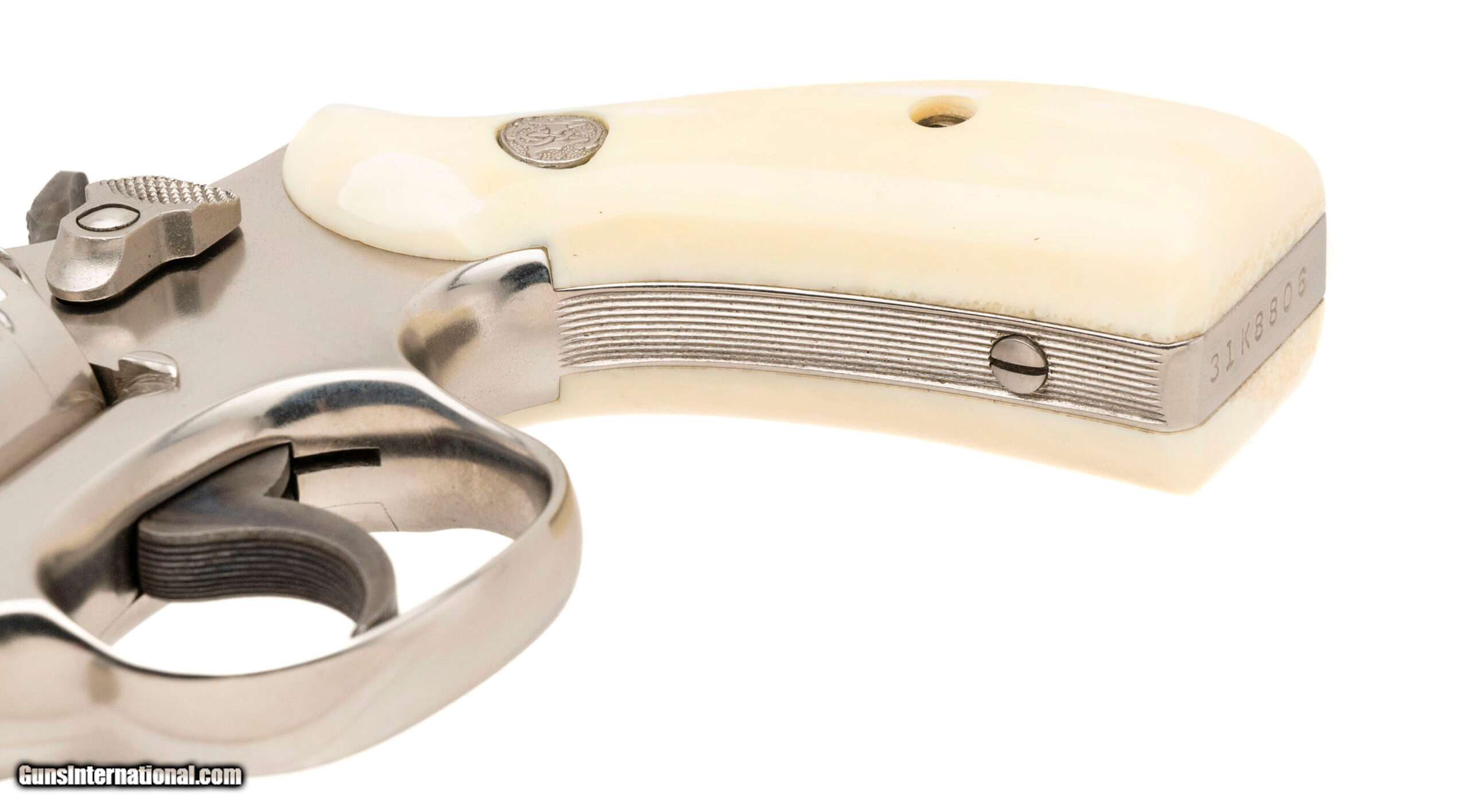 Description: "SN: 31K8806. Late 70's vintage. .357 Magnum with a 2.5"" pinned barrel. Bore is bright with strong rifling. Double action Nickel snubnose revolver with beautiful ivory grips. Finish is in very good condition. Comes with box and original grips. Overall excellent condition. SOLD |