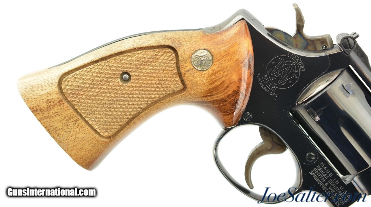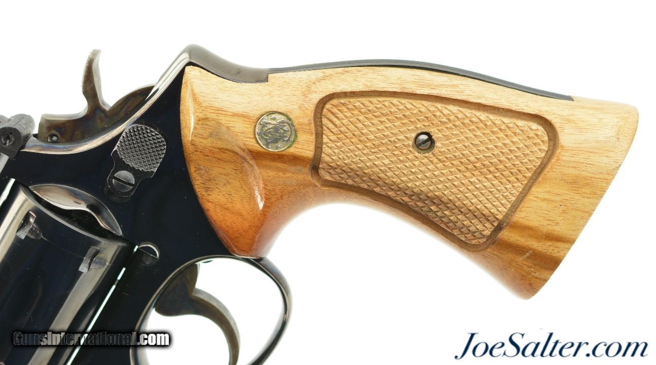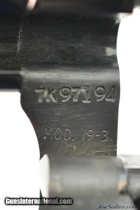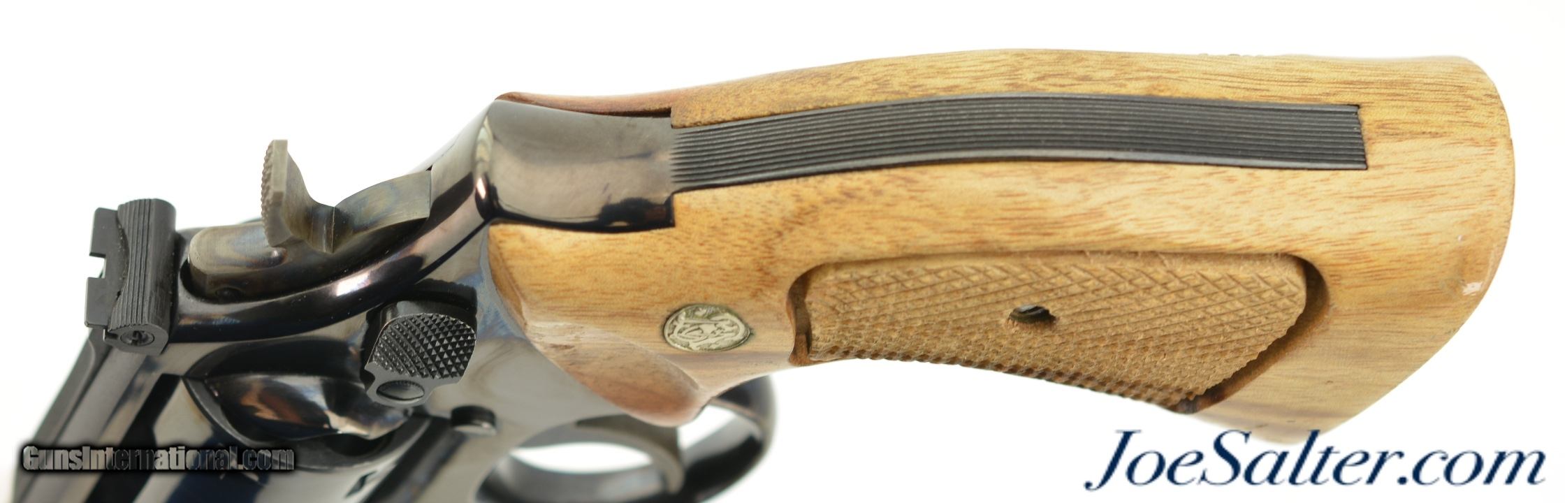 Description: Serial #7K97194, .357 Magnum/.38 Special, 6 inch round ribbed barrel with a bright, excellent bore. This is the Model 19-3 which looks to have been manufactured in 1975. The Combat Magnum model features blonde checkered wood grips and target sights. In excellent condition it retains virtually all, 97-99% of the original blue finish with very faint handling marks, slight wear at the muzzle and slight turn ring. The hammer and trigger show much of the original vibrant case color. The S&W logo target grips rate near excellent with very light storage and handling marks. It comes in a non-matching blue plastic S&W case with the Modern Style S&W revolver manual. An excellent example of the S&W Model 19-3. FFL SOLD |
