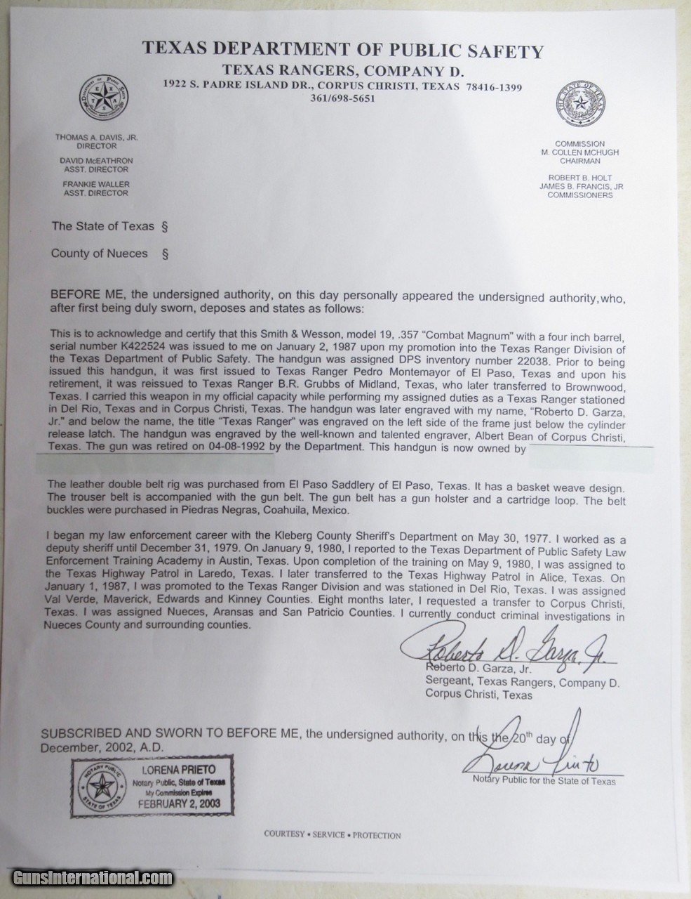 Description: Smith & Wesson Model 19 Revolver; Serial No. K42254; .357 “Combat Magnum” Caliber; 4” Barrel; Issued January 2, 1987 to Texas Ranger Roberto D. Garza, Jr. – Sergeant, TX Rangers, Company D. – Corpus Christi (Nueces County, TX); Signed Letter of Included; See All Photos for Condition; No Texts; Call (254)541-5765 or Email Only; PERSONAL PROPERTY of Harold Wieser; NOTICE: We Do Not Do Any Consignments - All Items Listed are Owned by Us - NO SALES to New Jersey or New York City - Antiques Only to Massachusetts and California; NOTE: All Modern Firearms Must Go to FFL Dealer who will Accept From Individual with Texas Driver License; Price: $2,975 + $45 S&H Via USPS Priority Mail; Payment Address: Harold Wieser - 1466 U.S. Hwy 77 - Rosebud, TX 76570; SEND PAYMENTS VIA USPS PRIORITY MAIL; BEWARE of SCAMS!!! - DO NOT SEND MONEY or CORRESPONDENTS ELECTRONICALLY UNLESS YOU HAVE SPOKEN to HAROLD WIESER FIRST! (254)541-5765 SOLD Manufacturer: Smith & Wesson Model: 19 Serial Number: K42254 |