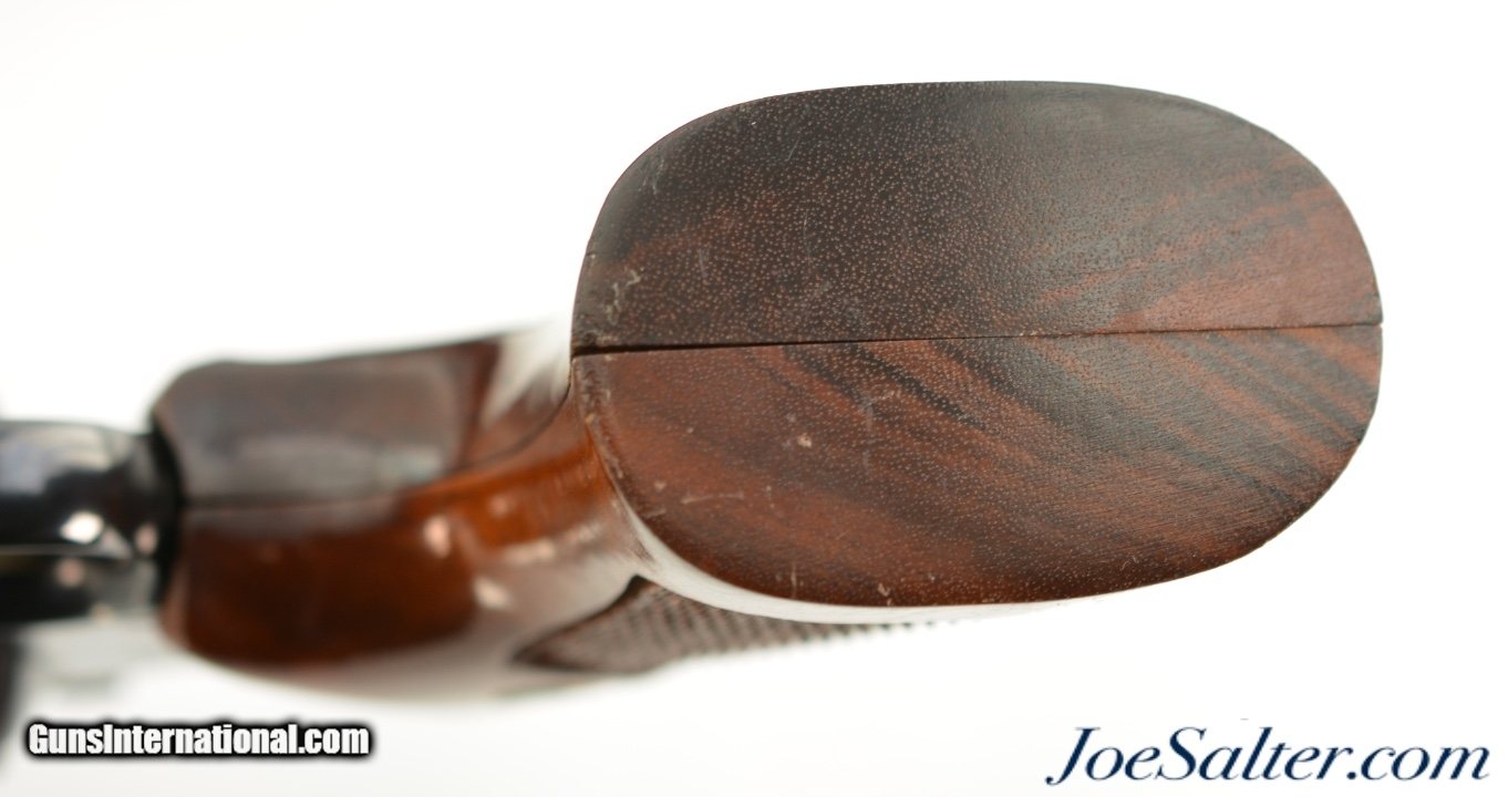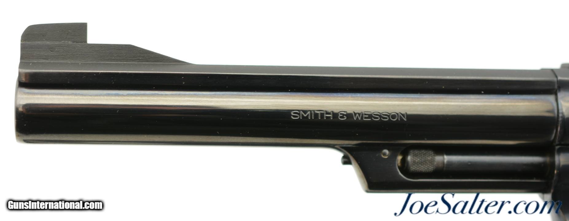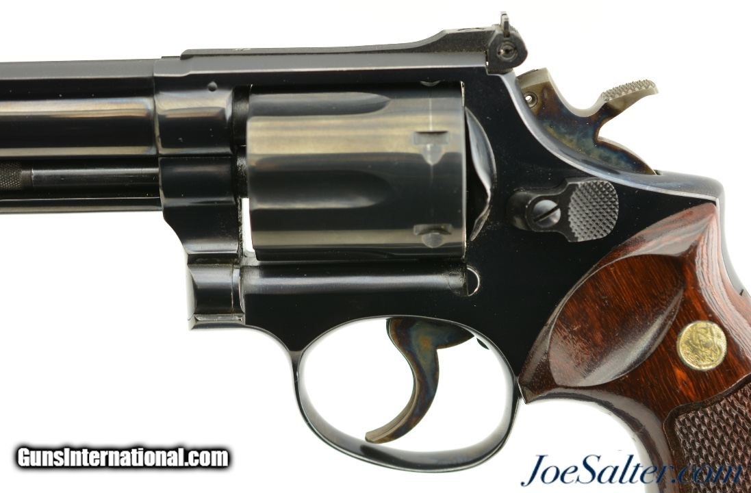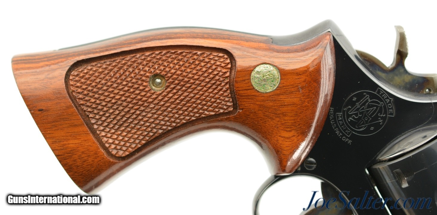 Description: Serial #7K57629, .357 Magnum, 6 inch barrel with a bright, excellent bore. This is the Smith & Wesson Model 19-3 Combat Magnum revolver manufactured in 1975. In excellent condition the barrel, frame and cylinder retain virtually all, 98-99% of the original blue finish with only a faint drag line on the cylinder. The service hammer and trigger retain vibrant case-hardened colors. The checkered Goncalo Alves grips with S&W medallions and extractor cutout rate excellent and are numbered to the gun with only very minor handling marks. The revolver has a Patridge front sight and factory black blade micro adjustable rear sight. It come in the original two piece blue Bangor Punta box numbered to the gun. An excellent example of these very well built mid-1970's revolvers. FFL or C&R; Don't forget about Free 100% Guaranteed shipping & Insurance for orders over $500 and no CC fees. ; SOLD |