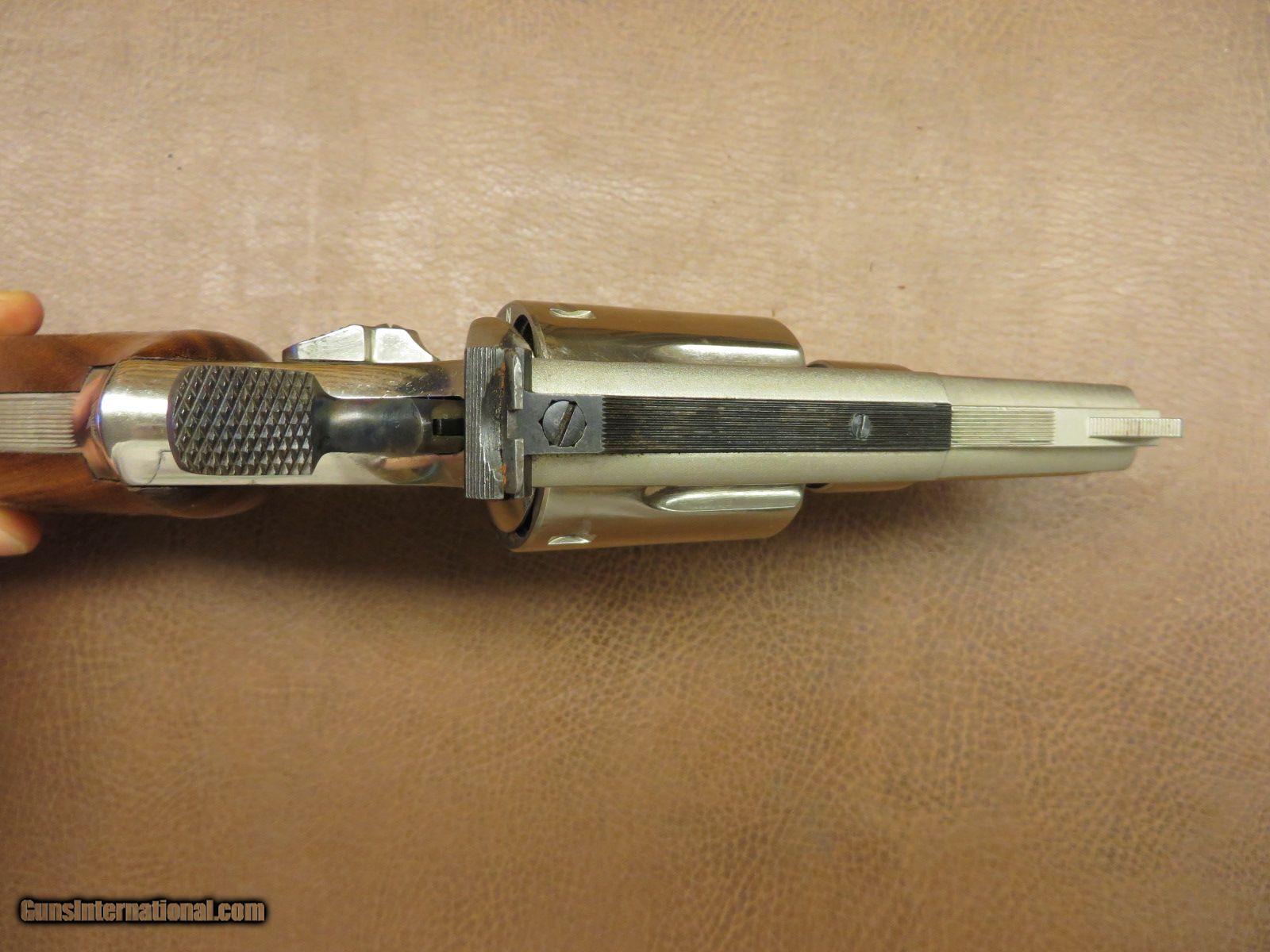 Description: .357 Magnum has 2 1/2 inch pinned barrel with adjustable sights. Target hammer and target trigger. Recessed cylinder. Bright nickel finish with checkered walnut grips. Serial number 5K52xxx. All 98-99% condition looks unfired and comes in original box with papers, cleaning kit, and screwdriver. SOLD |