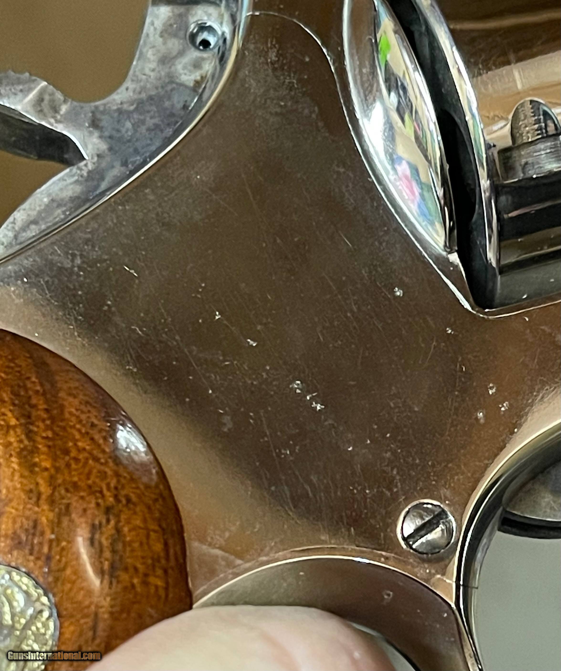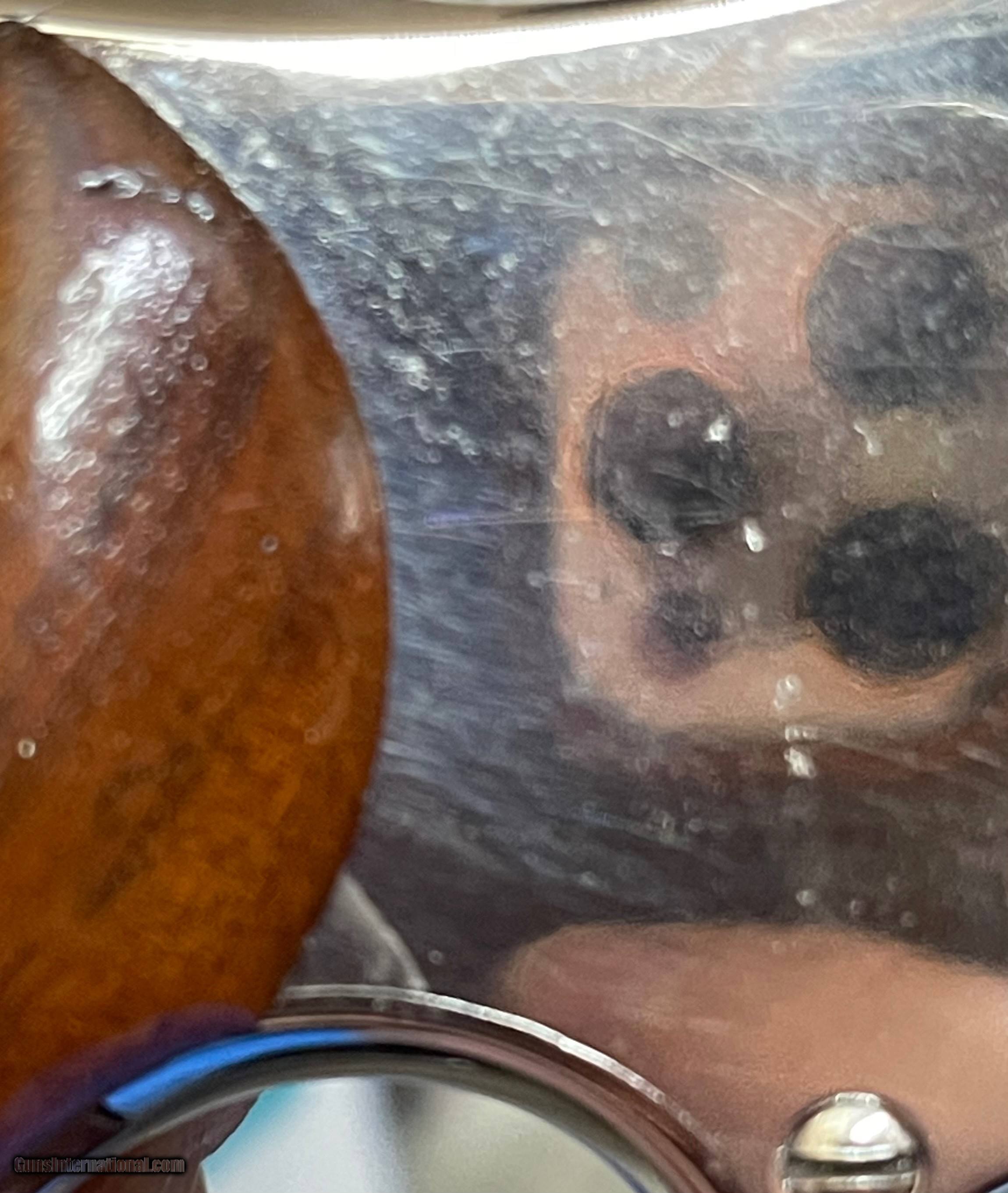 Description: Another great snub 19. This gun features short barrel, nickel finish, target adjustable sights, and wood service grips. Nickel has some pecks on the right side of the frame (see photo). Some light scratches on the cylinder from holster wear. No box. Please email with questions. Shipping and insurance included (west coast add $75). SOLD Manufacturer: Smith and Wesson Model: 19-5 Barrel Length: 2 1/2 Condition: Used Metal Condition: Very good Wood Condition: Excellent Bore Condition: Excellent Action: Da, sa Finish: Nickel Sights: Target Item Location: 37075 |