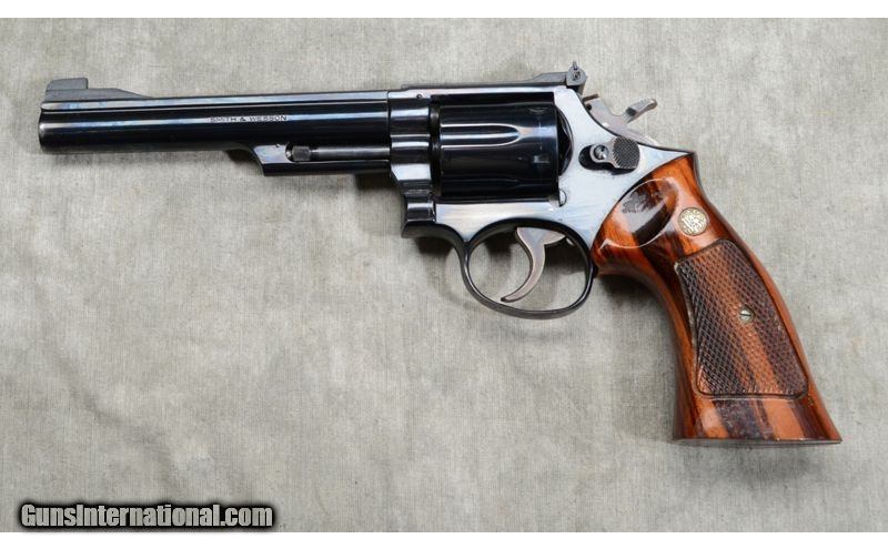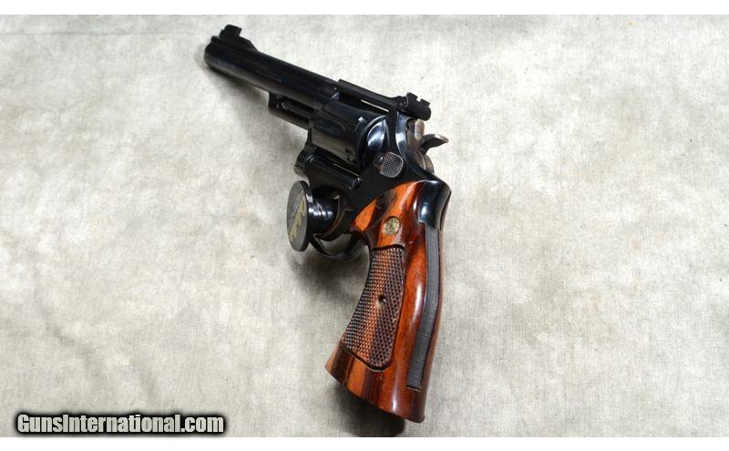 Description: Wonderful range and defense revolver as well as for light hunting. It has been used a bit but is very well-maintained. .357 Magnum SOLD Chambers: 6 Metal Condition: Very good to excellent.Light turn line, a small amount of bluing wear around the muzzle. Wood Condition: Excellent. Bore Condition: Shiny and bright. Barrels: 5-7/8 inches. Triggers: Factory single/double action trigger, grooved. Butt Pad: Checkered hardwood with S&W medallions. Very contrasty grain. Weight: 40 Oz. Sights: Post and adjustable notch. Item Location: Rogers |