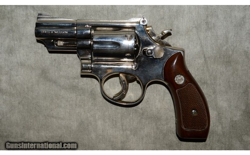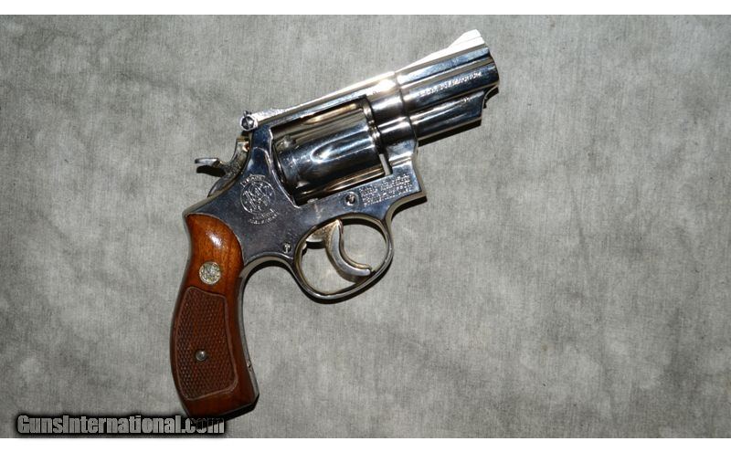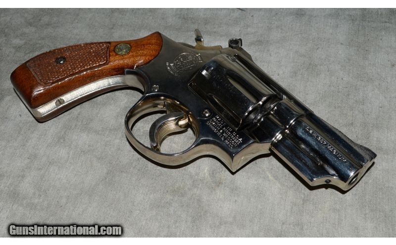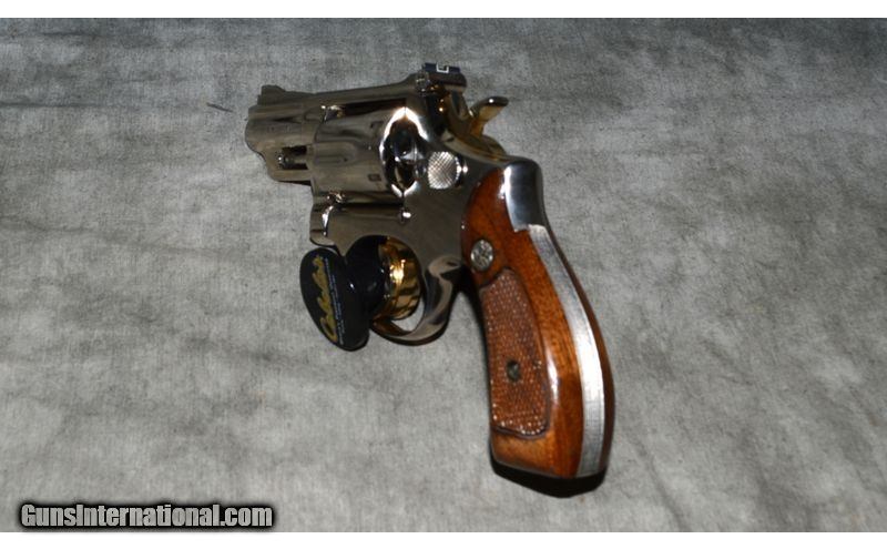 Description: Nice looking bright chrome revolver with serialized grips, double action trigger and set up with target type sights and trigger shoe. .357 Mag SOLD Chambers: 6 Metal Condition: Excellent. Light turn line. Wood Condition: Excellent. Bore Condition: Shiny and bright. Barrels: 2-1/2 Inch Triggers: Factory trigger with grooved target shoe. Butt Pad: Checkered hardwood with S&W medallions. Scales serialized to the frame. Weight: 32 oz. Sights: Serrated ramp and adjustable notch rear sight. Item Location: Rogers |