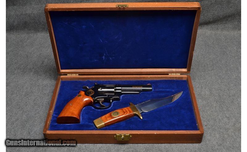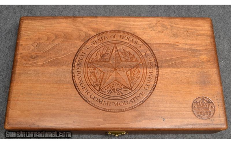 Description: This 6 shot revolver is a Smith & Wesson 19-3 Texas Ranger Commemorative Comission, chambered in .357 magnum. It has a 4" blued steel barrel, finished walnut grips, and a bronze Texas Ranger inlay. The 19-3 is in very good condition with only sight signs of wear. Never fired. Comes with wooden commemorative box and knife. .357 Magnum SOLD Chambers: 6 shot revolver. Metal Condition: Very good condition, slight signs of wear on Texas Ranger inlay. Wood Condition: Very good very little signs of use.` Barrels: 4" blued steel barrel. Triggers: Single stage trigger. Sights: Adjustable rear window sight, fixed blade front sight. Item Location: Noblesville, IN |