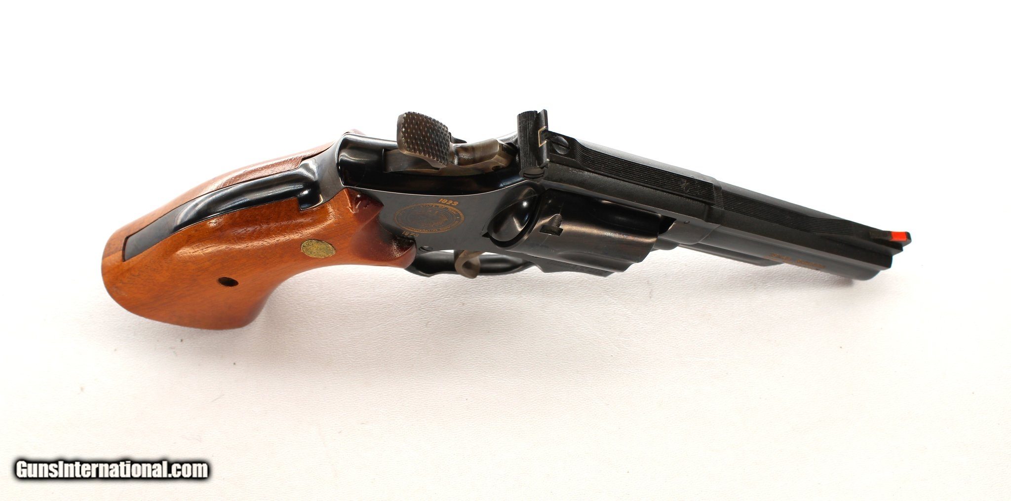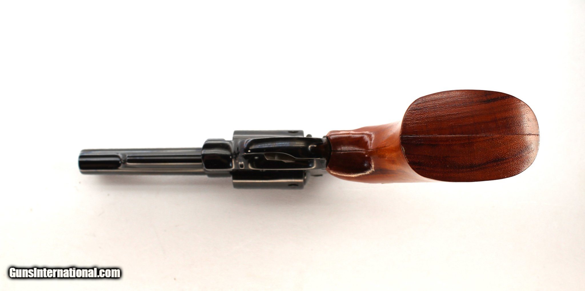 Description: Guns Listing ID: 1324740 SER #TR7727, 357 Magnum, 4” pinned heavy barrel with an excellent bore. This lovely commemorative is in verry good condition and includes the accessory Bowie knife in a factory presentation case. The metal surfaces of the revolver retain about 98% plus original blue, the gold fill on the Texas Ranger seal and barrel markings remain in excellent condition. The .400” smooth semi-target trigger and .500” target hammer retain bold case-hardened colors. The smooth factory walnut target grips feature gold Texas Star medallions, ejector rod cutout, the right side has a small relief cut to view the Texas Ranger seal, and they remain in excellent condition. The revolver features a red insert ramp front sight, white outline micro adjustable rear sight, and the right side forward two thirds of the triggerguard is thinned. This gun includes its companion 5 5/8” clip point Bowie knife that is correctly numbered to the gun, has brass furniture, laminated wood handle, 10 3/16” overall length, and remains in excellent unsharpened condition. It also includes the wood presentation case featuring blue French cut felt lined interior, and rates very good to excellent showing scattered handling and storage marks. It includes a key for the lock. An excellent commemorative for your collection. SOLD Manufacturer: SMITH & WESSON Model: 19-3 TEXAS RANGERS COMMEMORATIVE DISPLAY CASE & KNIFE Caliber Info: .357 MAG Condition: Used - Non-Certified Barrels: 4 BARREL Finish: BLUE AND BLACK |