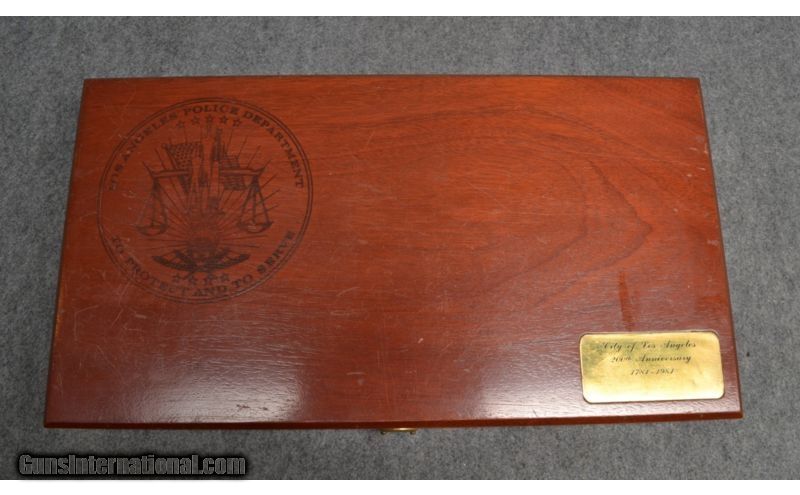 Description: This six shot revolver is a Smith & Wesson 19-4 City of Los Angeles Police 200th Anniversary edition, chambered in .357 magnum. It has factory iron sights, a 6" blued steel barrel, and a City of Los Angeles Police badge engraved on the right hand side. This 19-4 is in very good condition with little signs of use or wear. Never been fired. Comes with 200th anniversary commemorative wooden box. SOLD Caliber Info: .357 magnum. Chambers: 6 shot revolver. Metal Condition: Very good with little to no sign of use. Wood Condition: Very good with little to no sign of use. Bore Condition: Shiny and bright. Never fired. Barrels: 6" blued steel barrel. Triggers: Single stage trigger. Stock: Finished walnut grips. Weight: 42oz. Sights: Adjustable rear window sight, fixed front blade sight. Extras: Comes with 200th Anniversary commemorative wood box. Item Location: Wichita, KS |