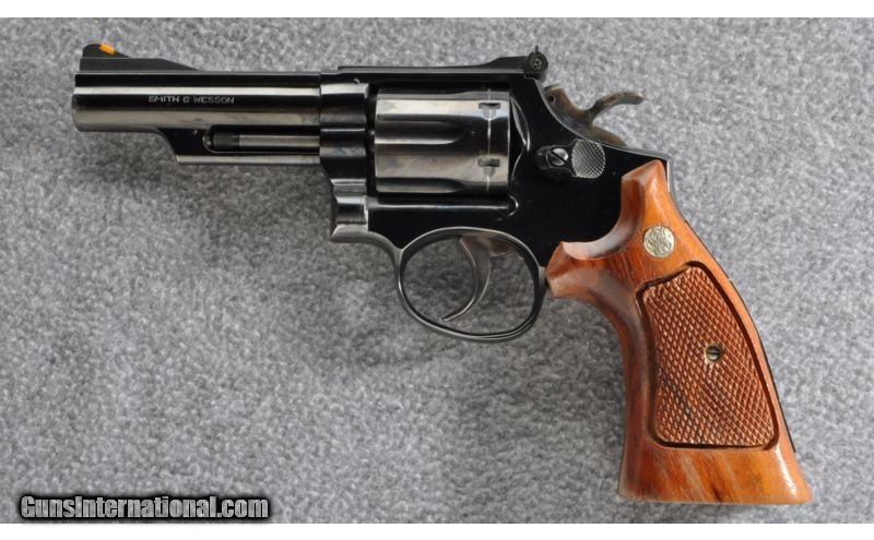 Description: SOLD Caliber Info: .357 Smith & Wesson Magnum, .38 S&W Special Chambers: 6 round cylinder Metal Condition: Shows holster wear and cylinder drag mark. Screw heads are lightly marred Wood Condition: Grip panels show use and the right one is cracked through the medallion to the top edge Bore Condition: Bore is good with sharp rifling Barrels: 4 Triggers: Single/Double Action Stock: Checkered Target grips with speed loader cutout plus S&W medallions Weight: 38 oz Sights: Red ramp front, Micro adjustable leaf rear Extras: A set of Pachmayr grips are included Item Location: Grand Junction, CO |