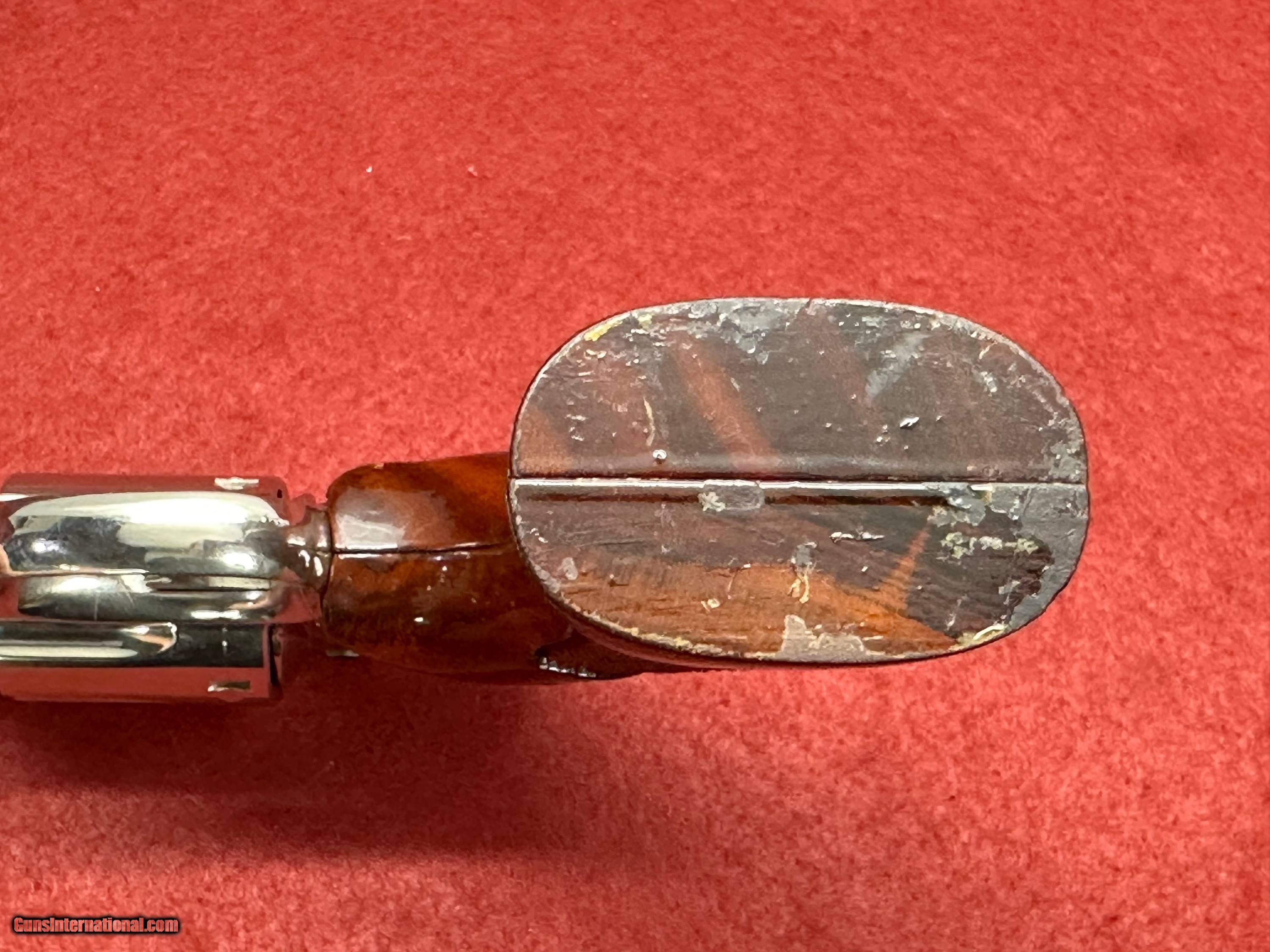Description: This 1975 Smith & Wesson retains a beautifull luster on it's nickel finish. the grips look to have had some finish added to them that is pealing in places. Bore is perfect. Includes all shipping and Credit card Fees Maine residents add 5.5% sales tax SOLD Handgun Caliber: .357 Magnum Manufacturer: Smith & Wesson Model: 19-3 Serial Number: 7K98864 Barrel Length: 4 Condition: Very good- Excellent Metal Condition: Excellent Wood Condition: Very Good Bore Condition: Excellent Action: Single / Double Manufacture Date: 1975 Item Location: Buxton Maine |
