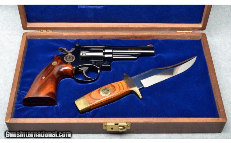 Description: Texas Rangers 1823-1973 Commemorative Commission issue from Smith & Wesson. Gun and knife have matchng serial numbers. Gun isn't absolutely perfect, but the set does have the original packaging in great shape! SOLD Manufacturer: 1973 Caliber Info: .357 Mag. Chambers: 6 rounds - recessed cylinder Metal Condition: Gun very good - slight turn ring on cylinder. Knife is excellent with slight tarnish on brass hilt and pommel. Wood Condition: Very good. Small flake of finish missing from bottom of grip. Bore Condition: Bright with sharp rifling Barrels: 4" - pinned Triggers: Double Action Sights: Red insert front with adjustable square-notch white outline rear sight Extras: With original wood presentation case, blue cardboard S&W boxes for gun & knife, leather knife sheath, paperwork, inner packing material, and outer packaging! Item Location: Cheektowaga, NY |