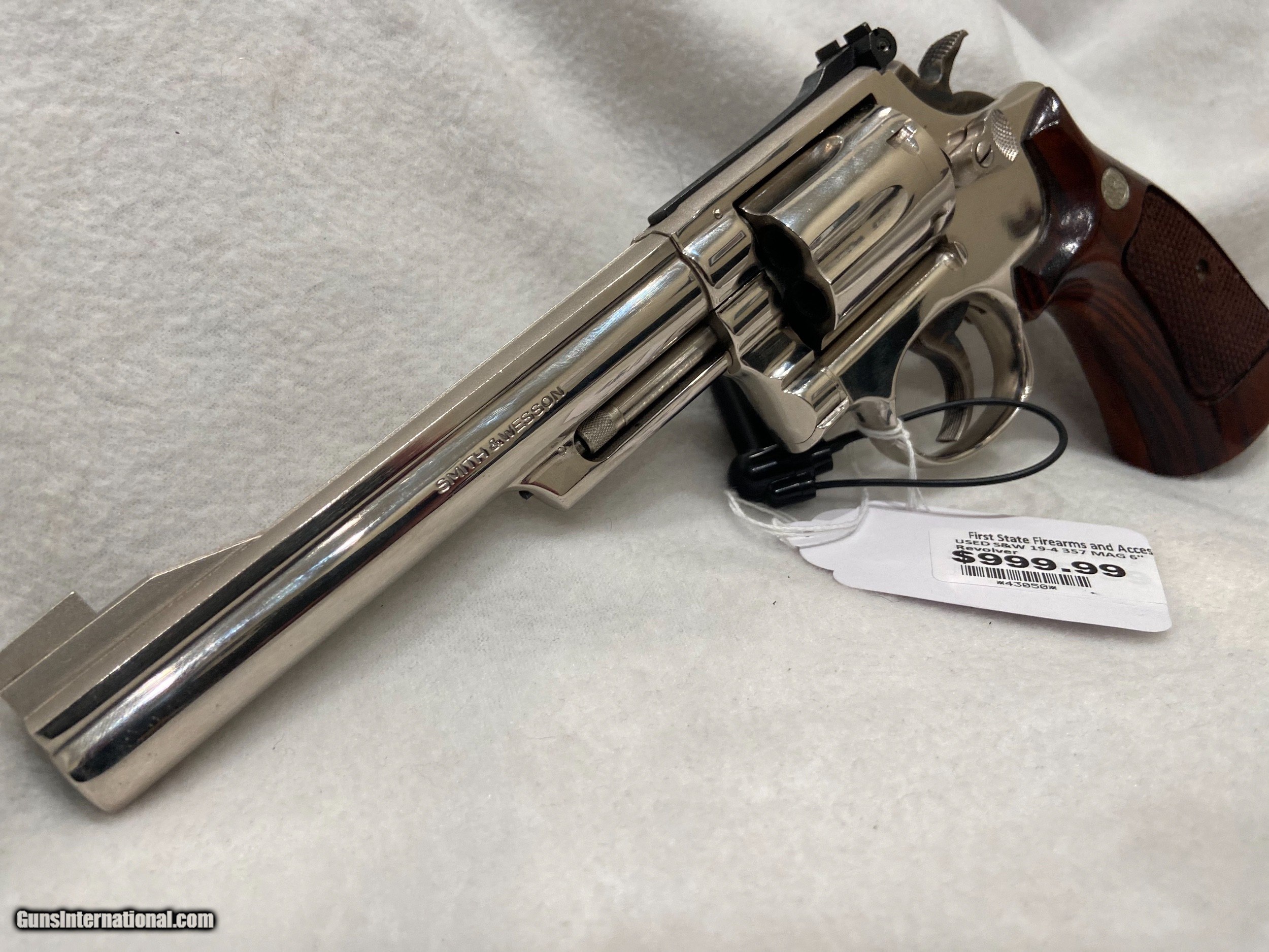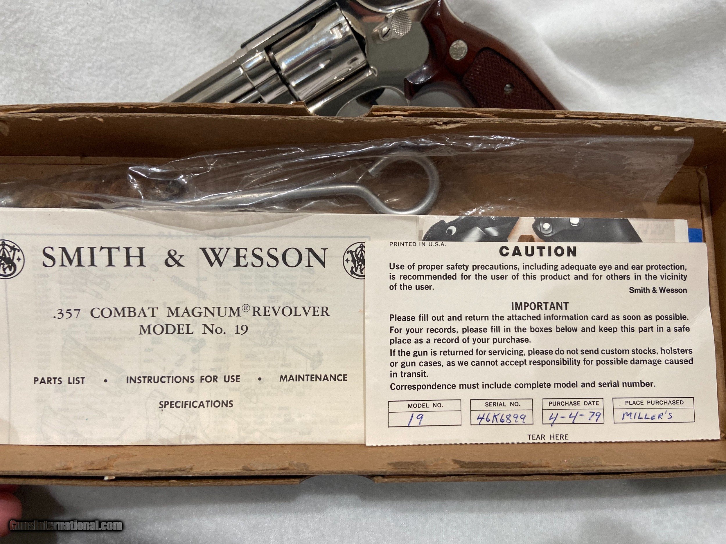 Description: This is a very nice Smith & Wesson 19-4 made in 1979. The gun comes from original owner. It is a nickel finish and 6" barrel. This gun was shot very little. It is in 98% condition and has all original paper work. Buyer pays shipping $40.00. Only to legal states and No CA sales. Only FSFA aka The Gun Shop SOLD Handgun Caliber: .357 Magnum Manufacturer: Smith & Wesson Model: 19-4 Barrel Length: 6” Condition: 98% |