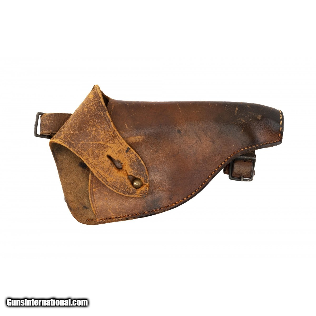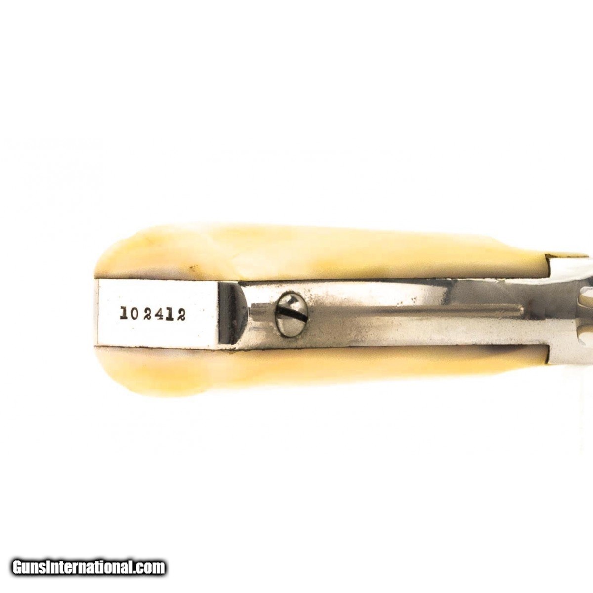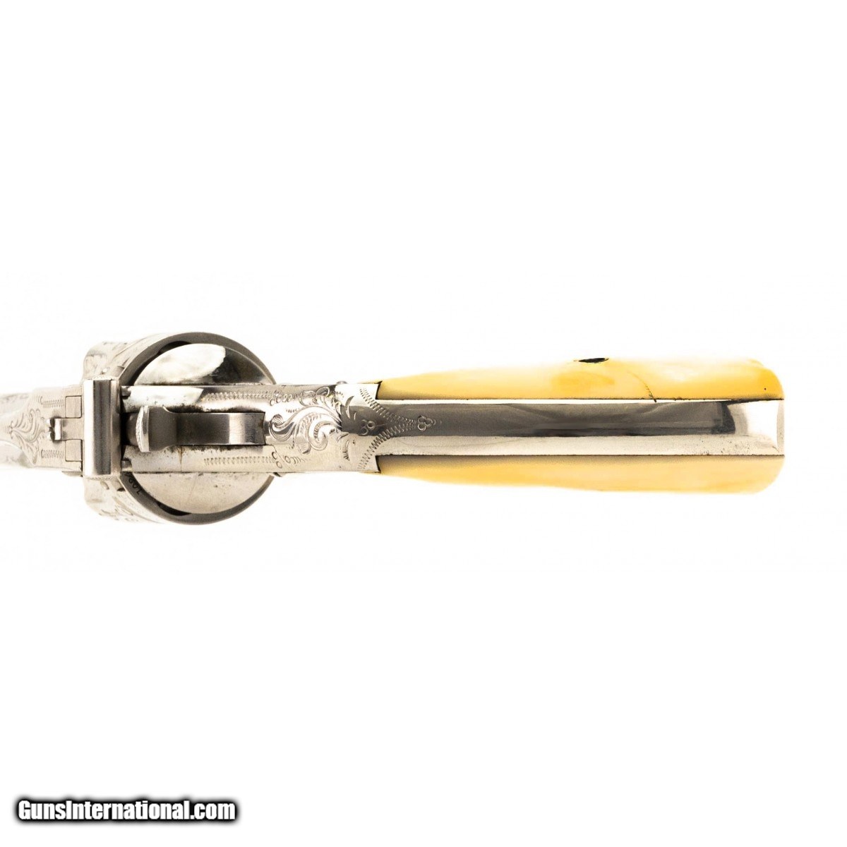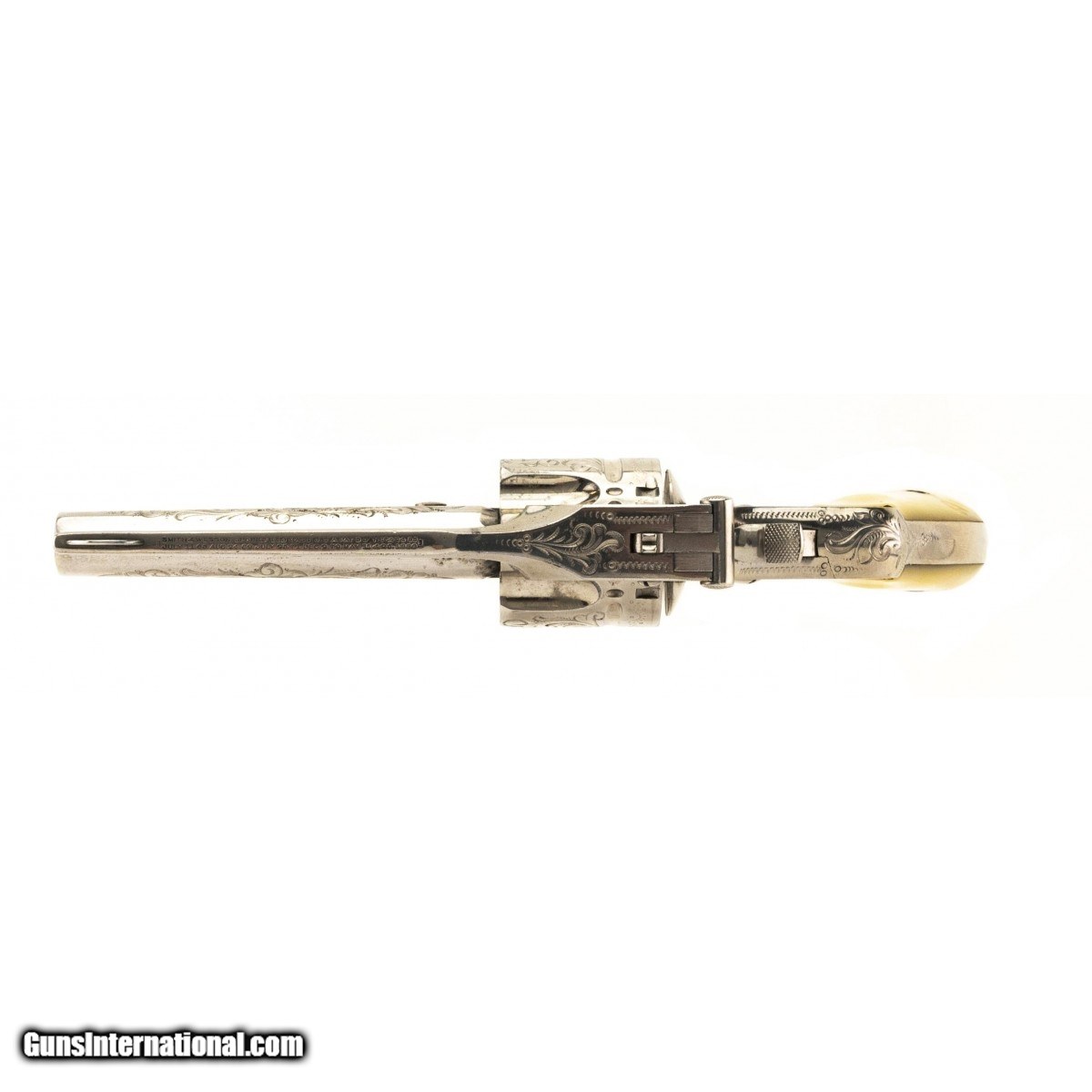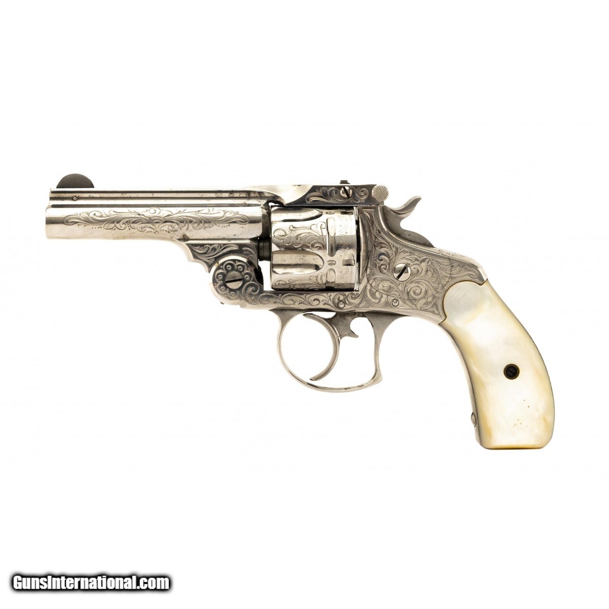 Description: " This S&W 38 Double Action Second Model revolver features factory engraving, nickel plating, and mother of pearl grips. The 3.25"" round with rib 38 S&W centerfire barrel has an excellent bore with bright, strong rifling. The cylinder has the expected grooves encircling it along with the two sets of stop notches. The barrel has the late production 1865, 1869, 1871, 1879, and 1880 patent dates. This fine revolver retains approx. 98% of its nickel finish. The factory scroll-dot engraving covers both sides, the top of the latch assembly, and the frame top behind the hammer. The mother of pearl grips are excellent with no cracks or chips. The double action functions correctly. A soft leather pocket holster and a brown leather holster for belt attachment or shoulder straps are included. They are in good condition. This super factory engraved revolver is fit for the finest collection. SOLD Antique: Yes |