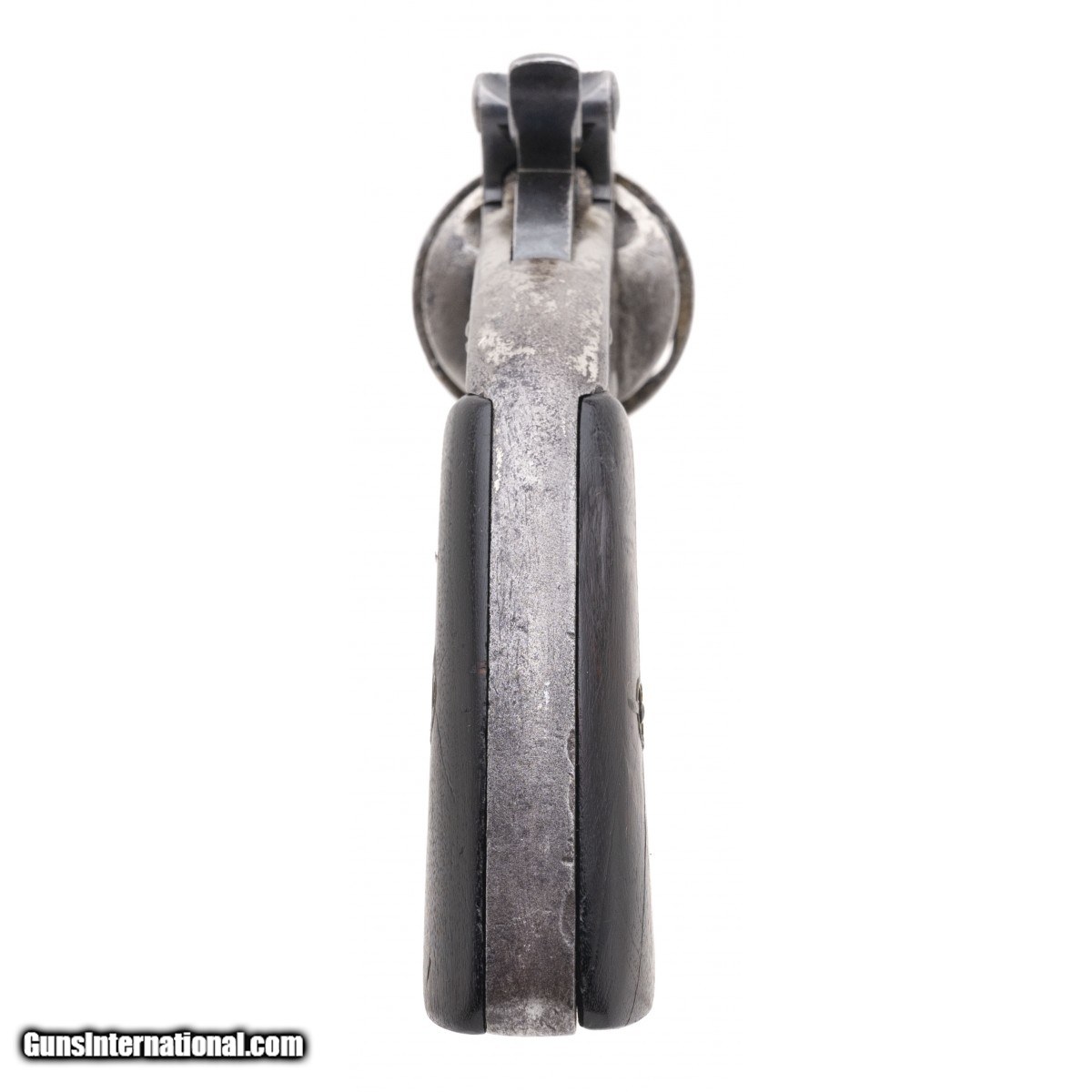 Description: " Serial No. 8099, circa 1876-1877, .45 S&W, 7"" round barrel. Gun has a dark grey patina throughout the metal, bore shows pitting and frosting in the lands and grooves. Rifling remains strong. Grips are good with repaired cracks on both sides. Factory and patent marks are present and legible. Action indexes and functions correctly. Consignment SOLD Antique: Yes |