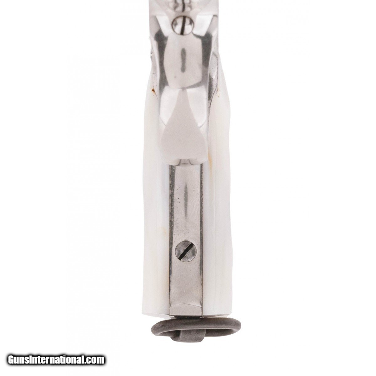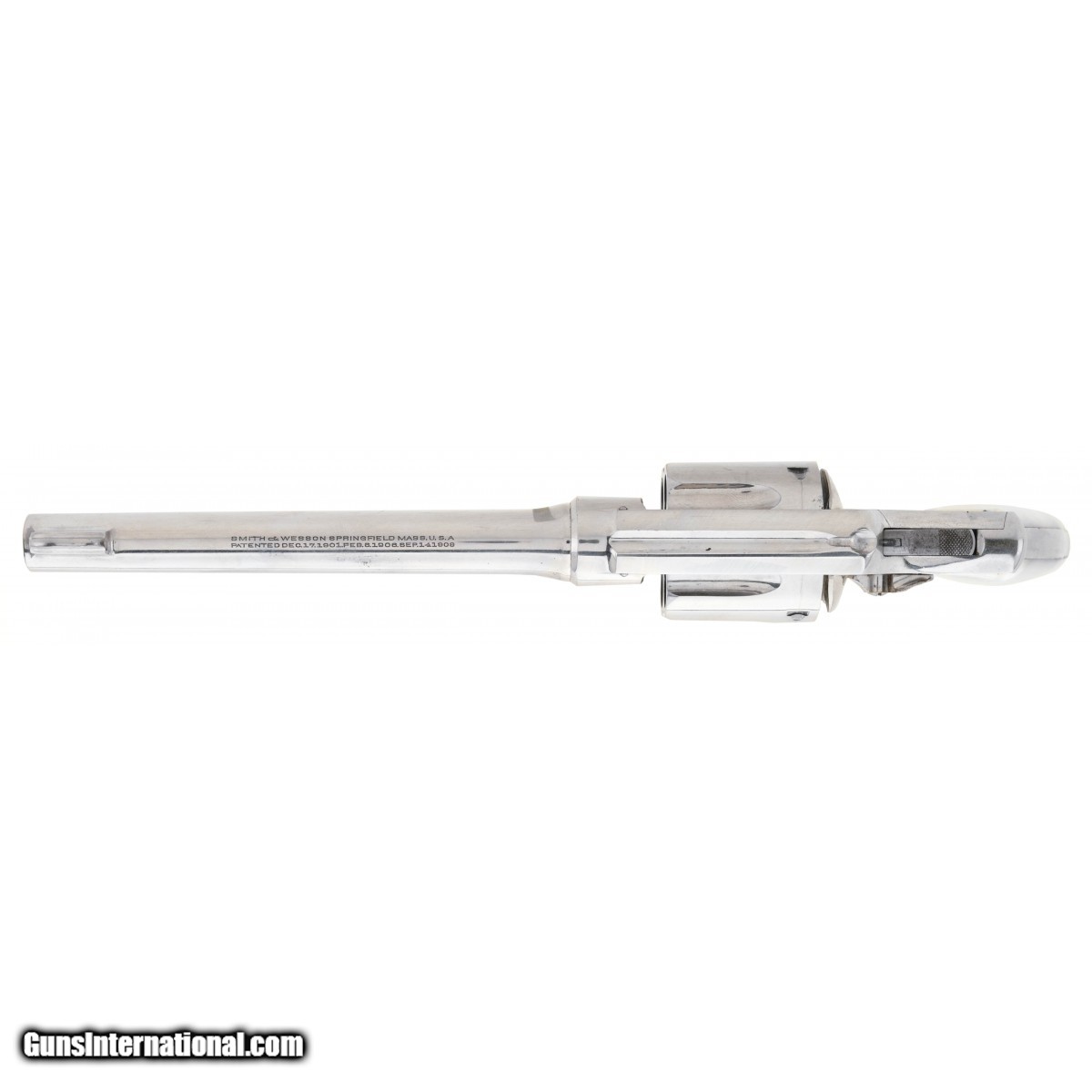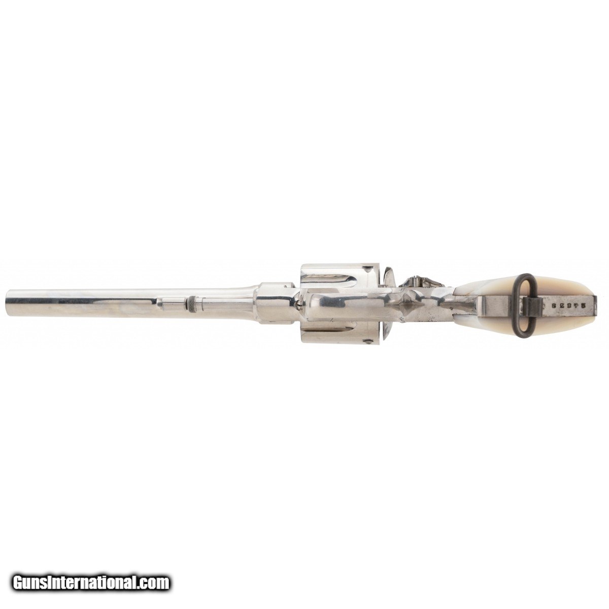 SN: 24839. Nickel 2nd model hand ejector with 6.5"" pinned barrel. Has excellent pearl grips and lanyard loop. The hammer and trigger have retained most of its case colors. Overall very good condition.