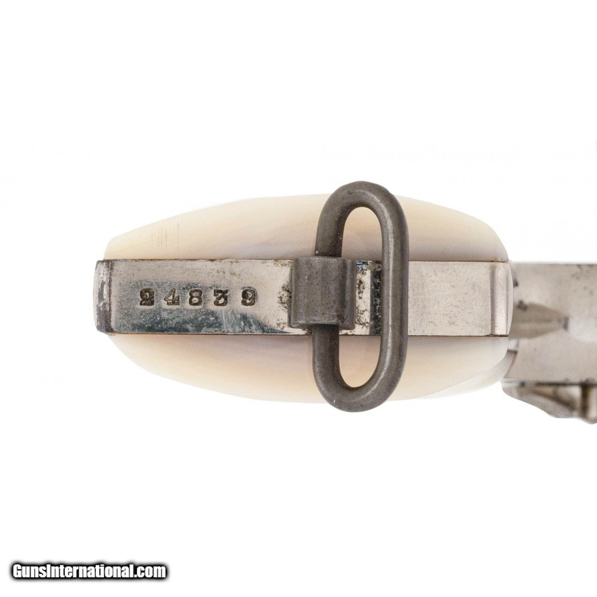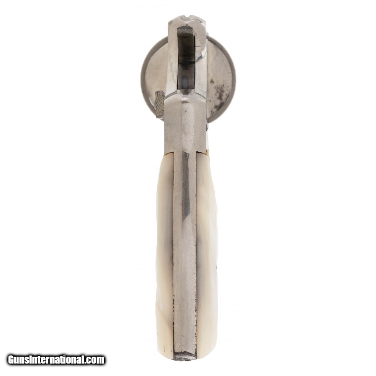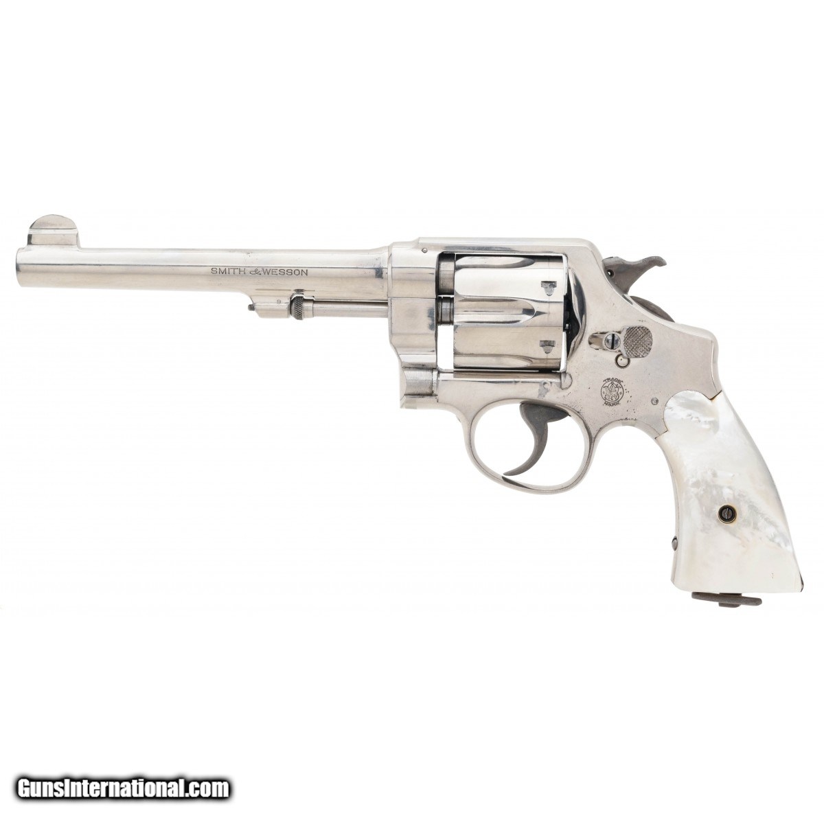 SN: 24839. Nickel 2nd model hand ejector with 6.5"" pinned barrel. Has excellent pearl grips and lanyard loop. The hammer and trigger have retained most of its case colors. Overall very good condition.