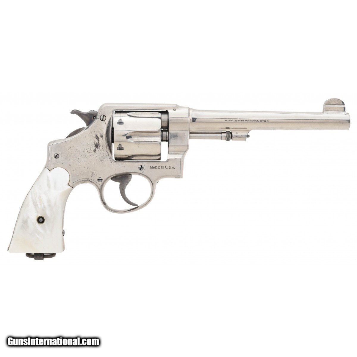 Description: " SN: 24839. Nickel 2nd model hand ejector with 6.5"" pinned barrel. Has excellent pearl grips and lanyard loop. The hammer and trigger have retained most of its case colors. Overall very good condition. SOLD |