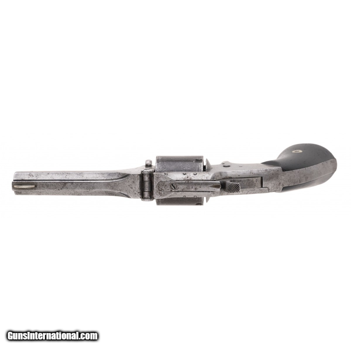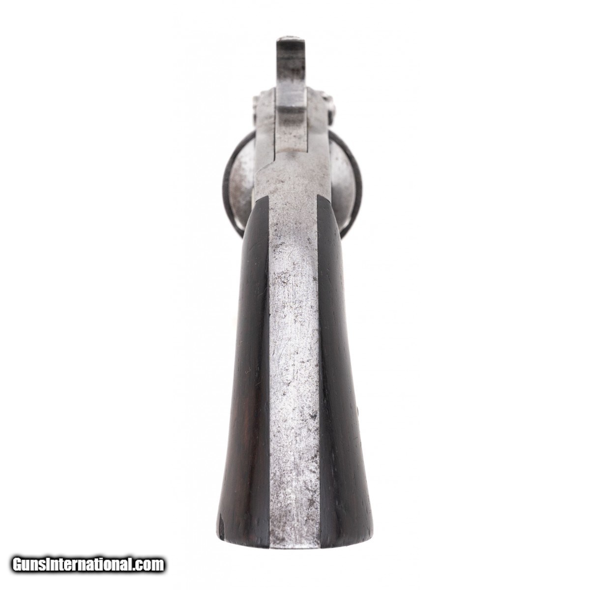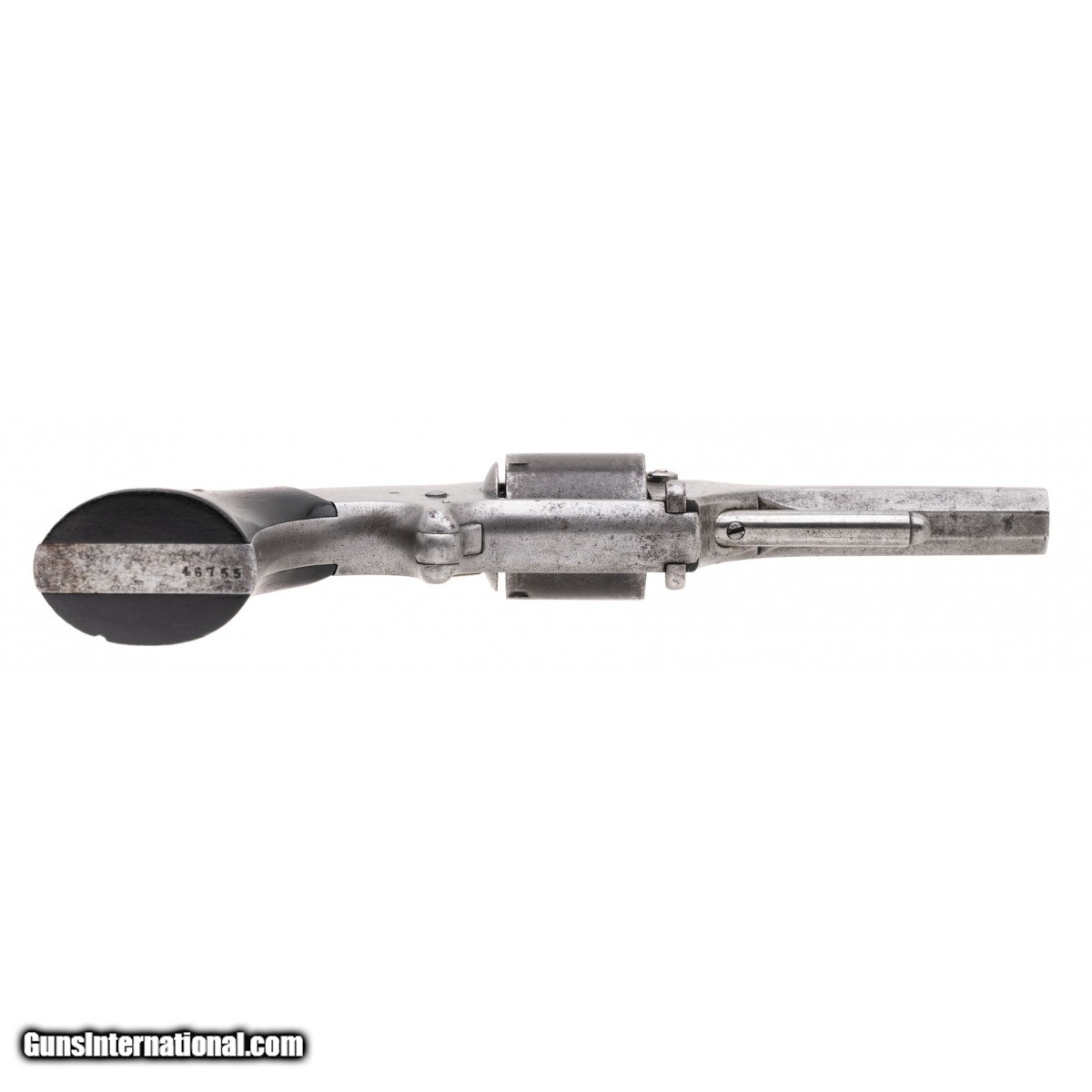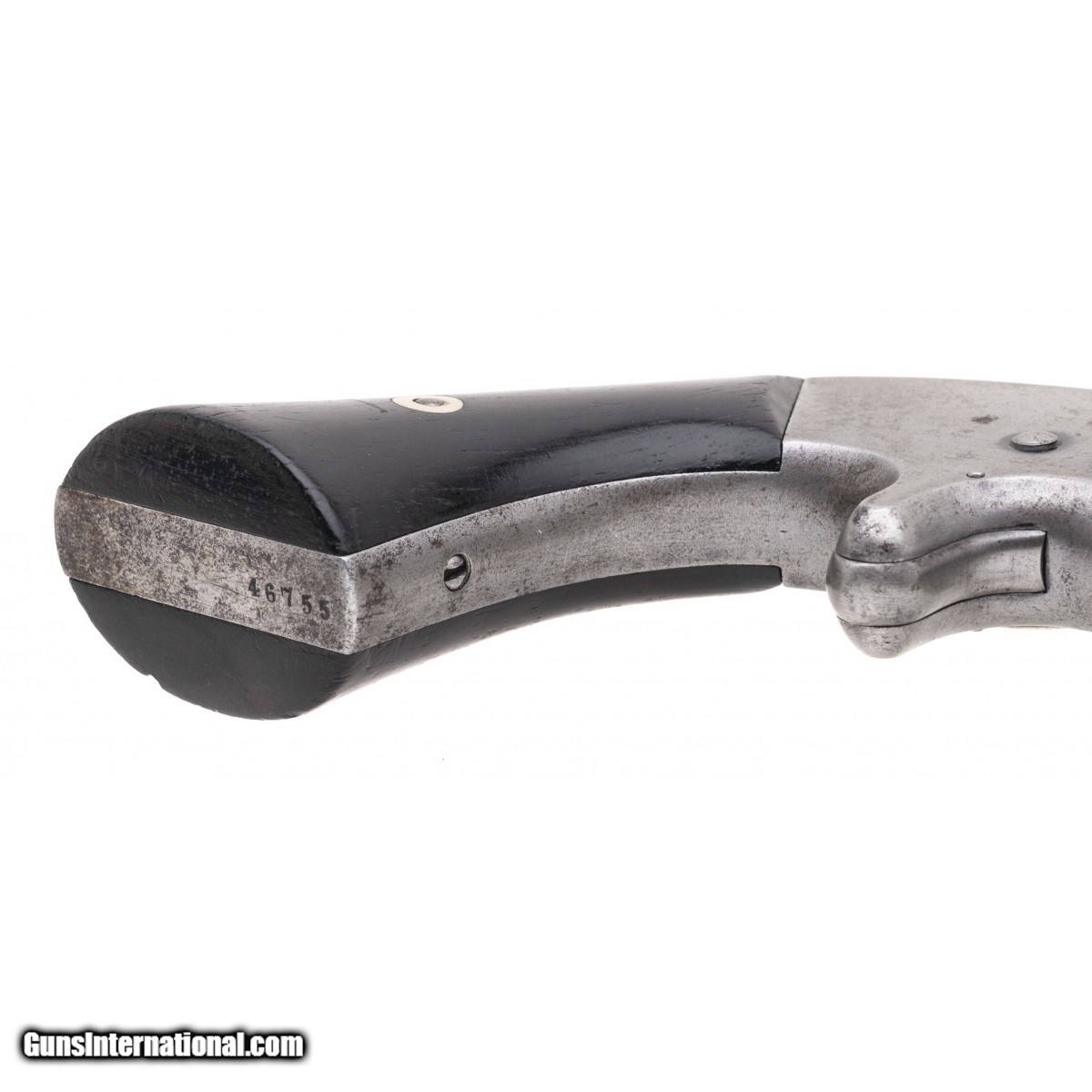 Description: " Serial No. 46755, circa, 1866-1868, .32RF, 3.5"" octagonal barrel. Metal is a light grey patina with scattered surface oxidation visible. Bore is good with frosting noted in the grooves, rifling remains strong. Two piece rosewood grips are very good with light surface scratches and handling wear visible. Action indexes correctly with a tight lock up. What makes this revolver unique is the experimental hinge and side plate cover "" Smith & Wesson Springfield, MASS"". CONSIGNMENT SOLD Antique: Yes |