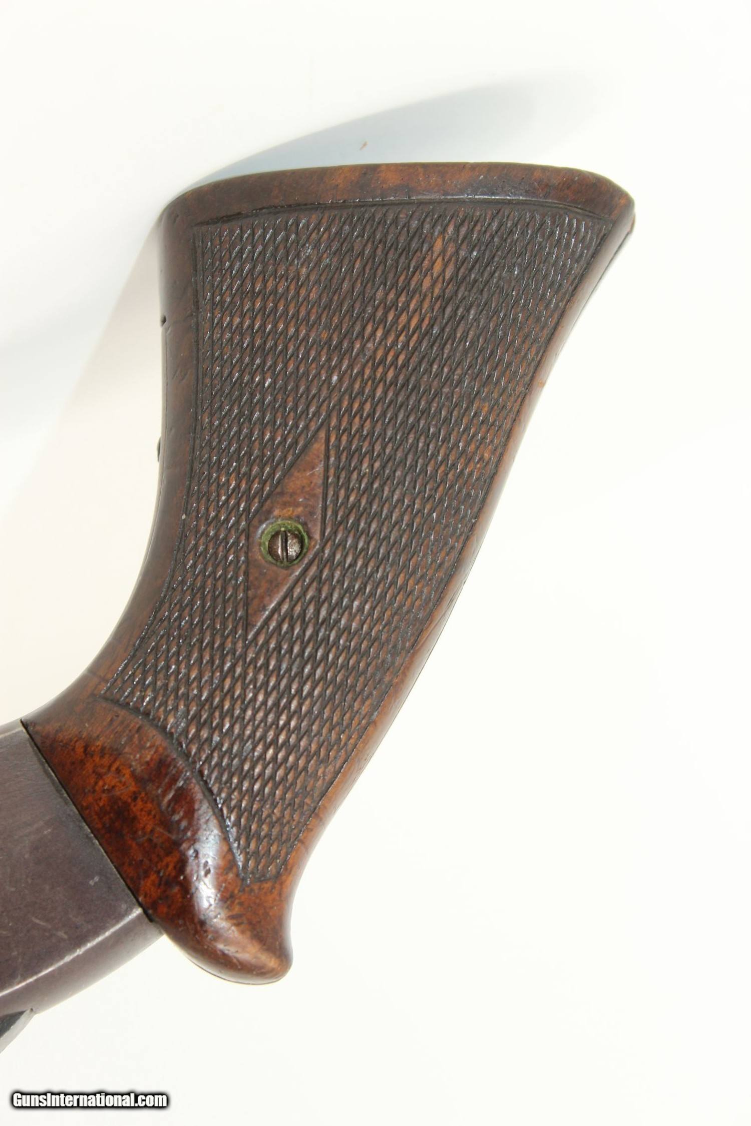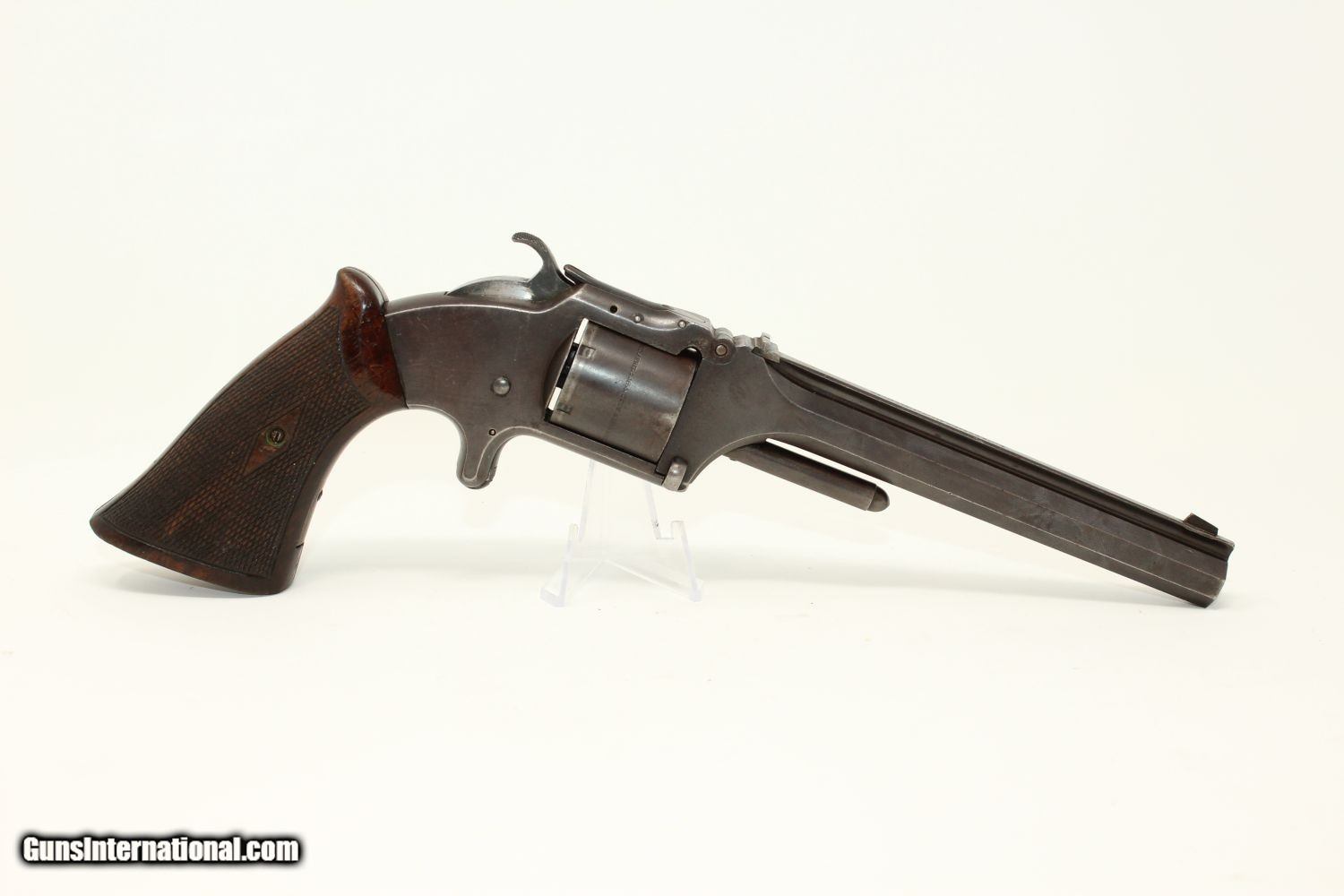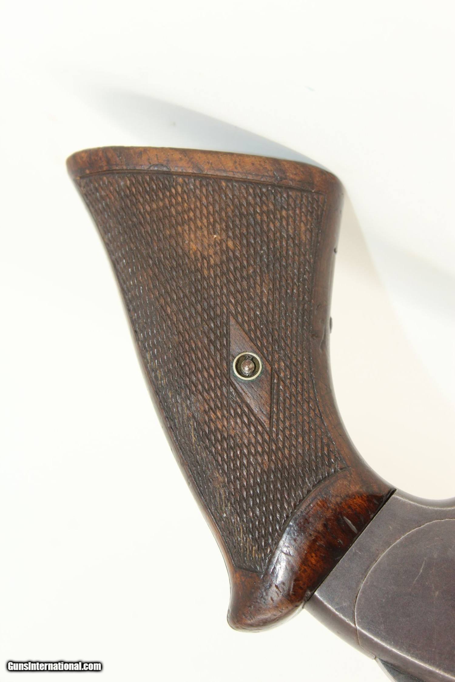 Description: 1860s Antique SMITH & WESSON No. 2 “OLD ARMY” Revolver .32 Rimfire Target Early S&W’s Flagship Sidearm! Here we present an antique Smith & Wesson Model No. 2 Old Army Revolver, made circa 1870 in Springfield, Massachusetts. Smith & Wesson purchased the rights to the Rollin White patent for the bored through cylinder, which would forever change the development of revolving firearms. Beginning in 1857 they produced the Number 1, a 7-shot .22 rimfire pocket pistol, which was quite successful. This was fine for the commercial market, but S&W knew they could scale up their design for a pistol that could be worn on the belt in a holster. They began shipping their Number 2 “Army” Revolver, a 6-shot .32 caliber, just 2 months after the beginning of the American Civil War. Soldiers and officers on both sides of the conflict made private purchases of the revolvers for self-defense. Guns under serial number 35,731 (produced by May 1. 1865) were likely used in the Civil War. Smith & Wesson continued to leverage their patent well beyond the war and they remained very popular with the public and on the frontiers. This one has been optimized for target shooting! Checkered walnut grips with a bump have been installed for higher purchase. Blockier target style front and rear sights aid in sight visibility. Looks like this was all done long ago. The overall condition is very good. The action is strong and tight. Great, clean, well-rifled bore. Crisp action. There is one pin absent from the cylinder stop but that does not impede function or affect lockup. The grips are seated securely with the checking still sharp. A really neat, old customized S&W No. 2! Own the original! This is a legitimate antique and not a reproduction. Barrel is 6 inches. Caliber: .32 Rimfire Overall condition as seen in photos. Very Fast. Very Safe. FREE SHIPPING WORLDWIDE. Delivered directly to your door by express mail! Guaranteed AUTHENTIC & Includes CERTIFICATE OF AUTHENTICITY. ancestryguns $1200 #190583 SOLD Antique: Yes |