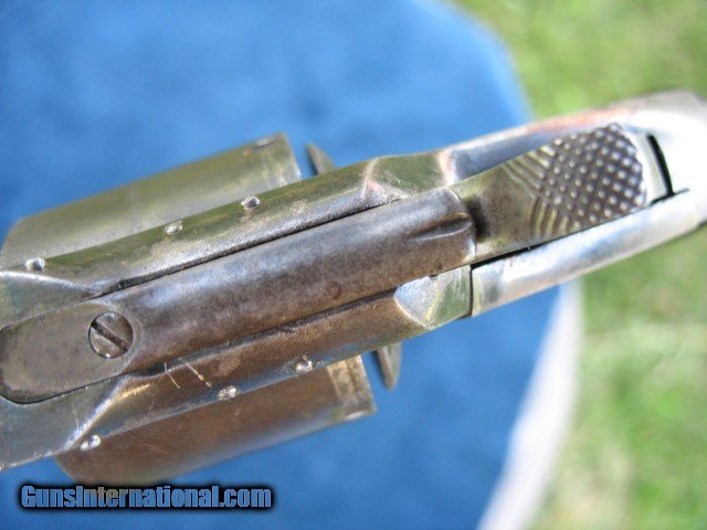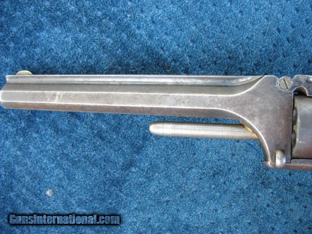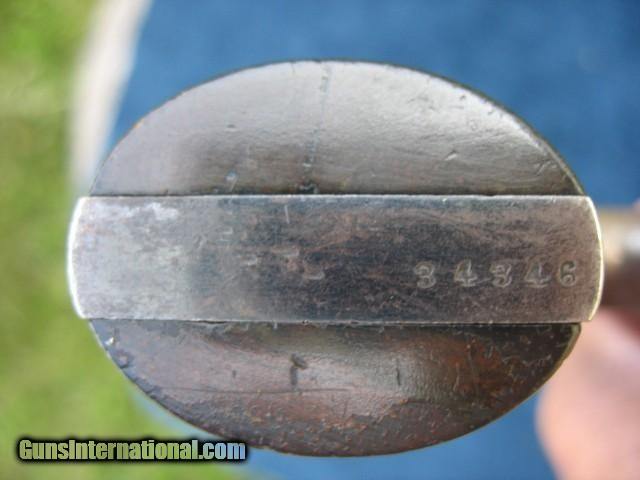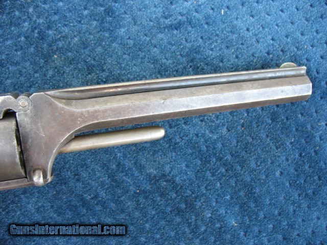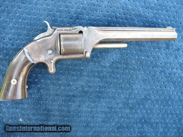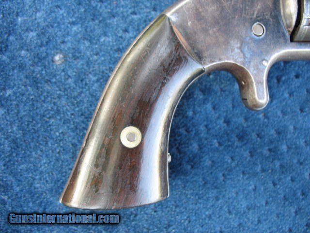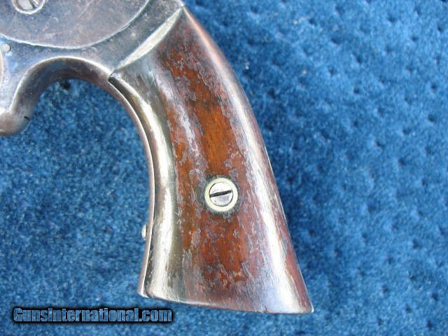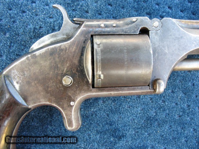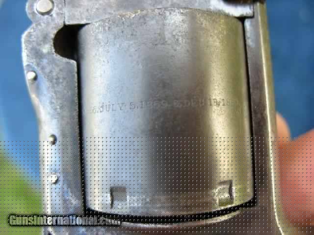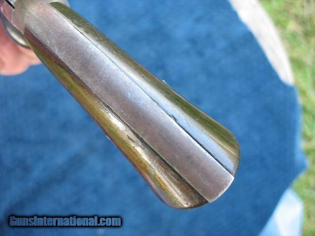 Description: SOLD...Antique Smith & Wesson #2 Old Army. Here is a decent Smith & Wesson #2 Army with S/N 34346 and was MFG. in early 1865. It has the standard 6” barrel and in the .32 Rim Firer caliber of course. As the photos show, this ole Smith still has generous traces of blue on the frame sides and some on the top. Some blue on the butt at the S/N and traces on the barrel down in the rib. Matching assembly numbers on the cylinder, barrel and frame under the grips. The grips are very nice with matching number stamped inside the right grip. Grips have no cracks or chips and still retain about 50% original varnish. They fit perfectly. The markings are excellent. The balance of the gun shows a medium brown patina with some light and minor pitting on the forward area on the cylinder from black powder flash. Gun shows no attempts of any cleaning. The action is in very good working order but a little sticky when you pull back the hammer?? It indexes perfectly and locks up with the normal cylinder play. No front to rear movement on the cylinder. The barrel is rock solid at the hinge and the latch. NO barrel wobble on this one.. Most you will find have that problem but this one is still tight. It has a good hammer that has NOT been broken or repaired. The side plate screw head is slightly larger that standard and is also the hammer stud that screws into the frame as you can see.. I removed the side plate and everything inside looks good so I have no idea why it was replaced. The under barrel ejector rod is a good looking replacement that appears to be glued in?? { see photo } .. Just a decent ole Smith that will display nicely. About as cheap as you are going to find and worth the price I am asking in parts.!! $30 insured shipping.. Call 765-728-8049 with any questions or more photos. SOLD Antique: Yes |