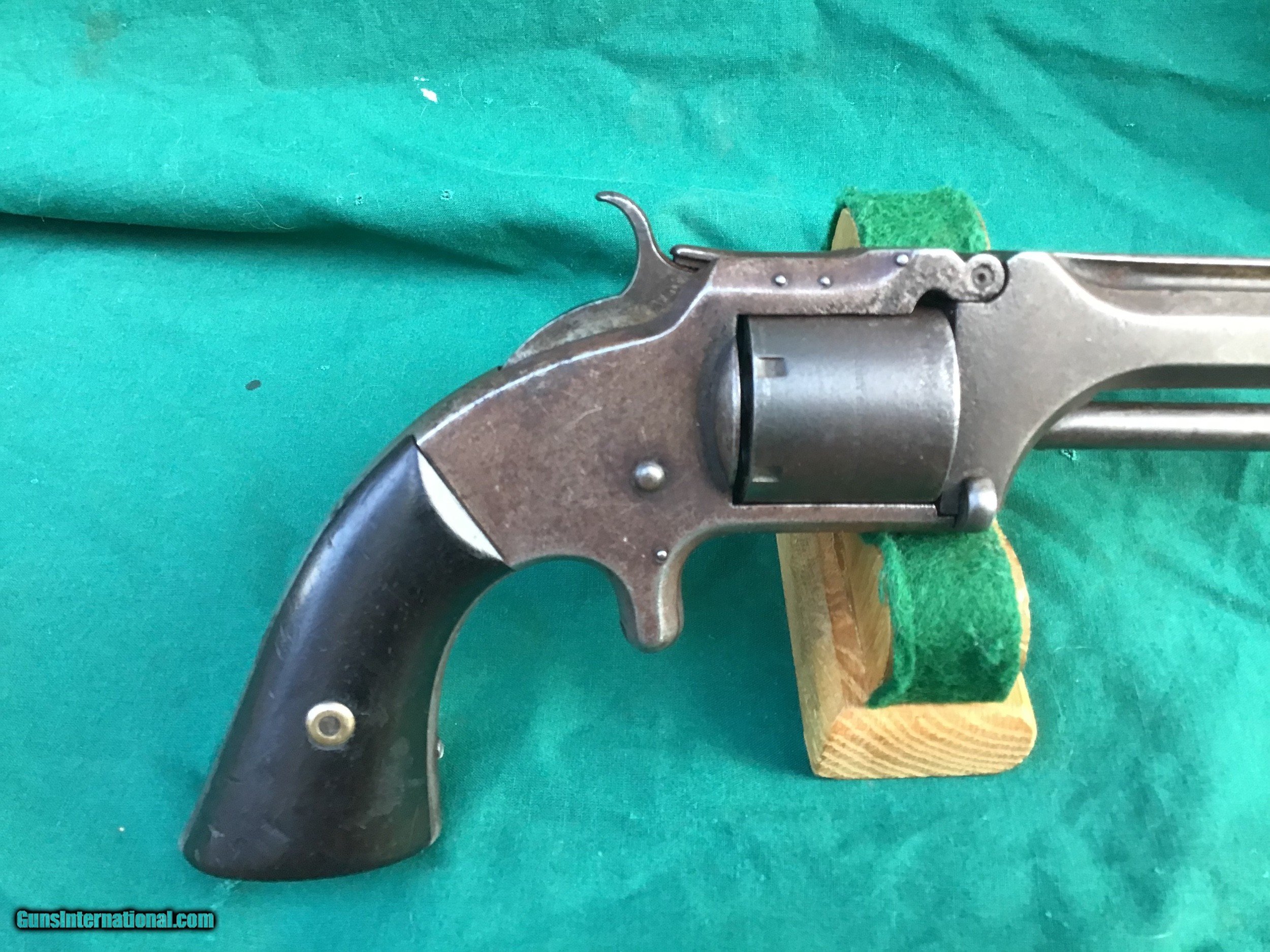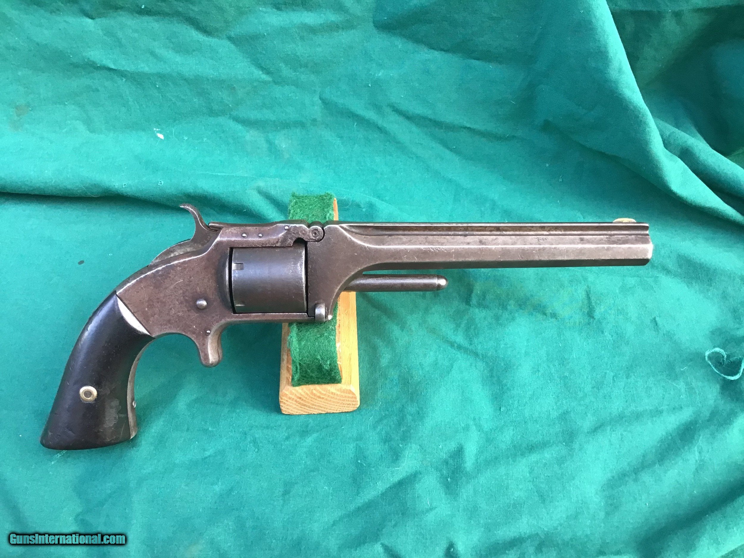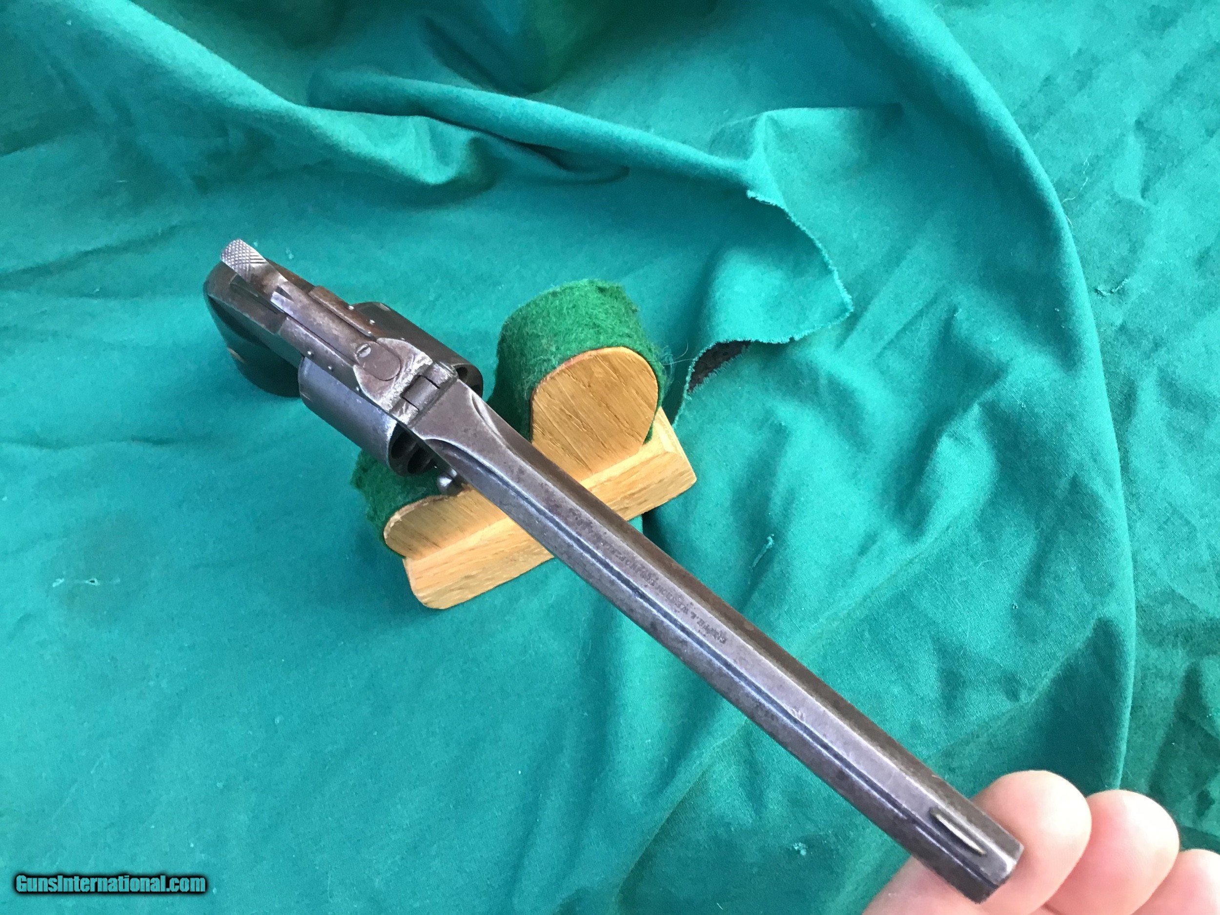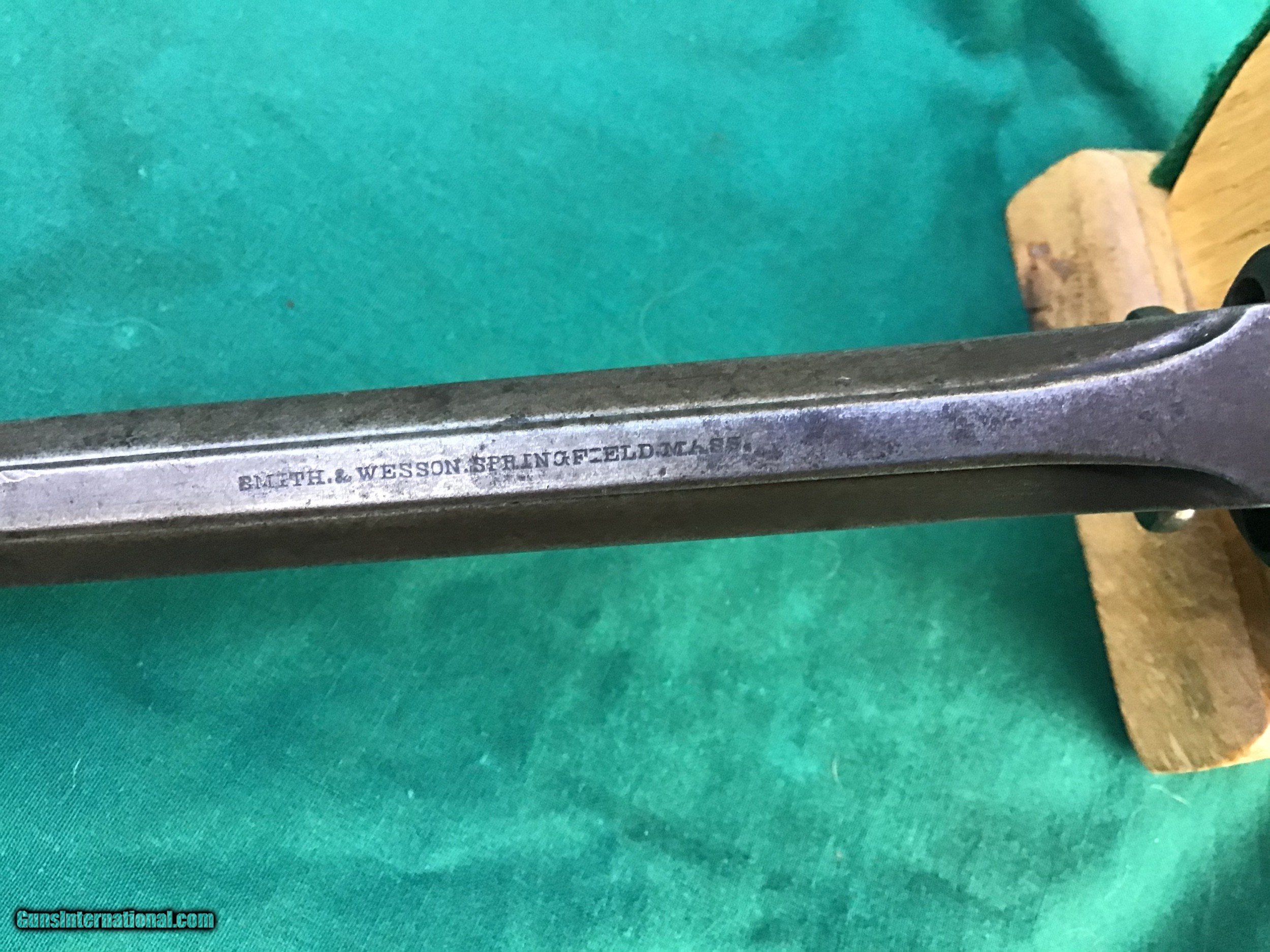 Description: Civil War Smith & Wesson No. 2 Old Army, 32 rimfire with 6” barrel. All matching, cylinder, barrel, grips, and back strap. Grips are in good condition. Action functions nicely and timing is very good. Cylinder locks up nicely. Overall finish is a nice brown / gray patina with some blue in protected areas. Very nice markings. Serial number 14,177. Hinge screw is a replacement. Barrel is wobbly and loose. See pics. Hinge area needs to be tightened. Antique and sold as a collectors item only. Not warranted safe to shoot. Please feel free to ask questions. SOLD Antique: Yes |
