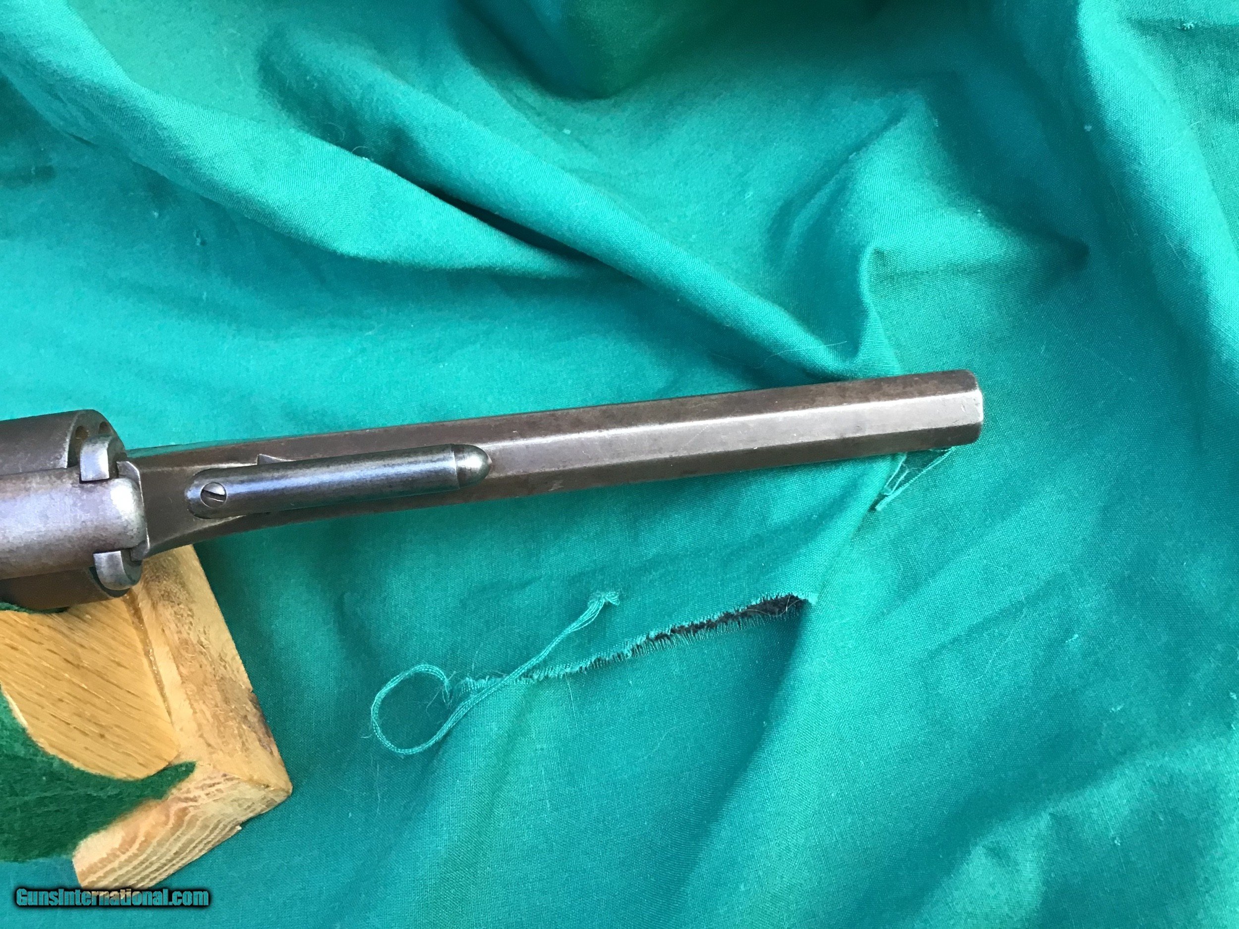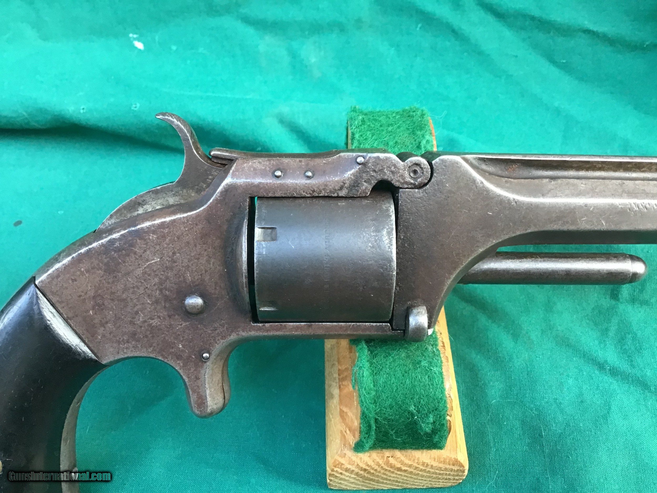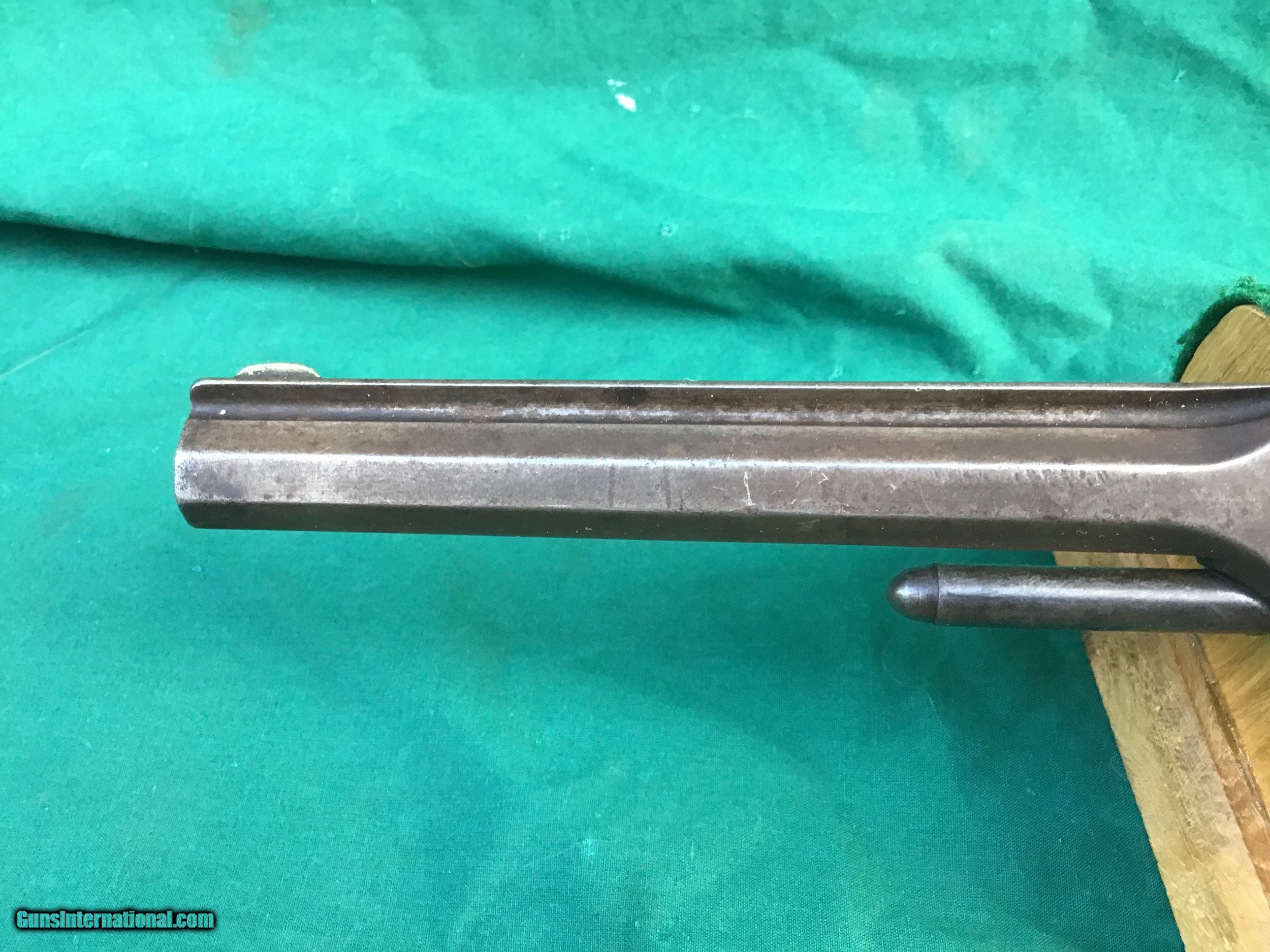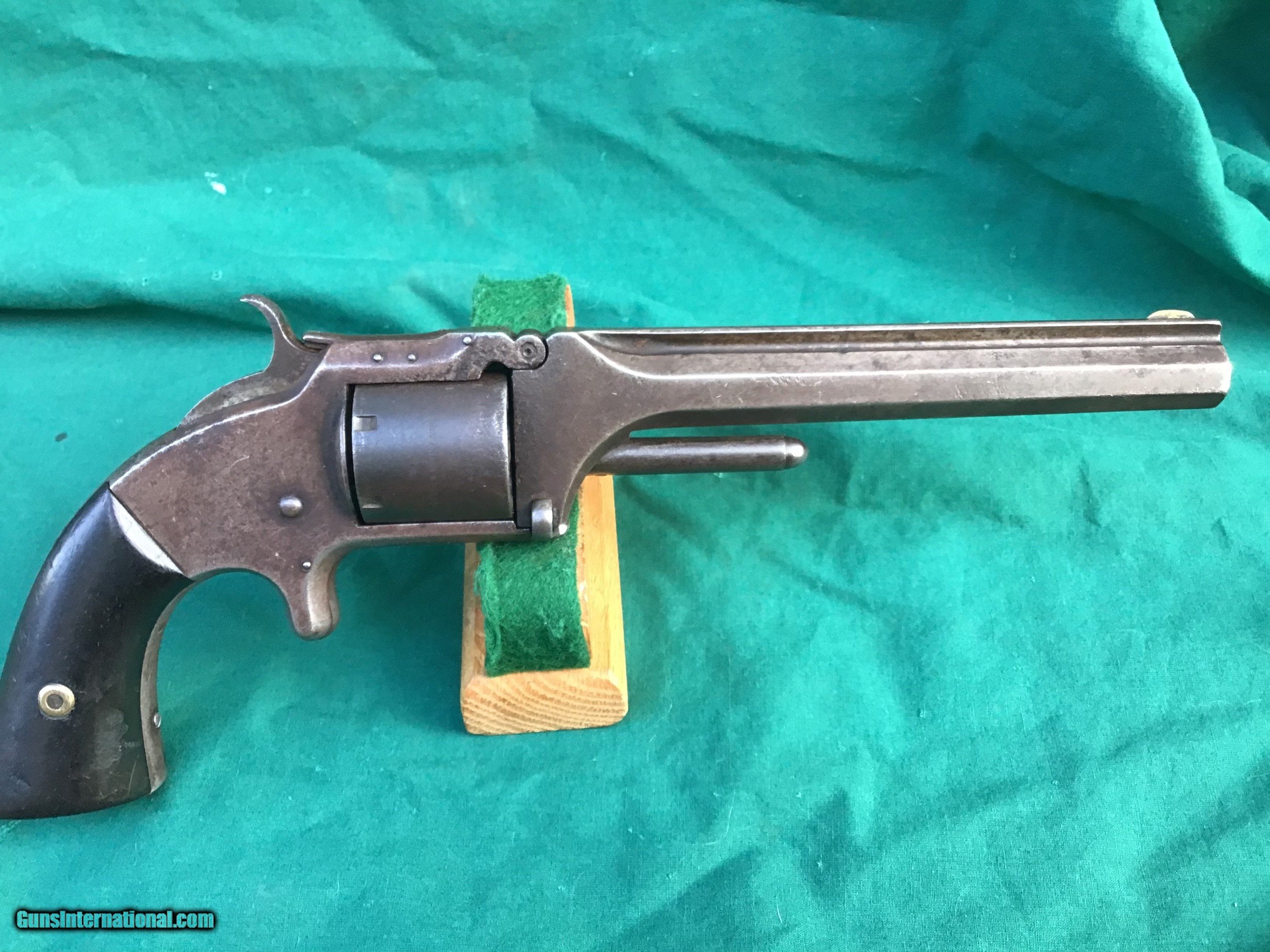 Description: Civil War Smith & Wesson No. 2 Old Army, 32 rimfire with 6” barrel. All matching, cylinder, barrel, grips, and back strap. Grips are in good condition. Action functions nicely and timing is very good. Cylinder locks up nicely. Overall finish is a nice brown / gray patina with some blue in protected areas. Very nice markings. Serial number 14,177. Hinge screw is a replacement. Barrel is wobbly and loose. See pics. Hinge area needs to be tightened. Antique and sold as a collectors item only. Not warranted safe to shoot. Please feel free to ask questions. SOLD Antique: Yes |