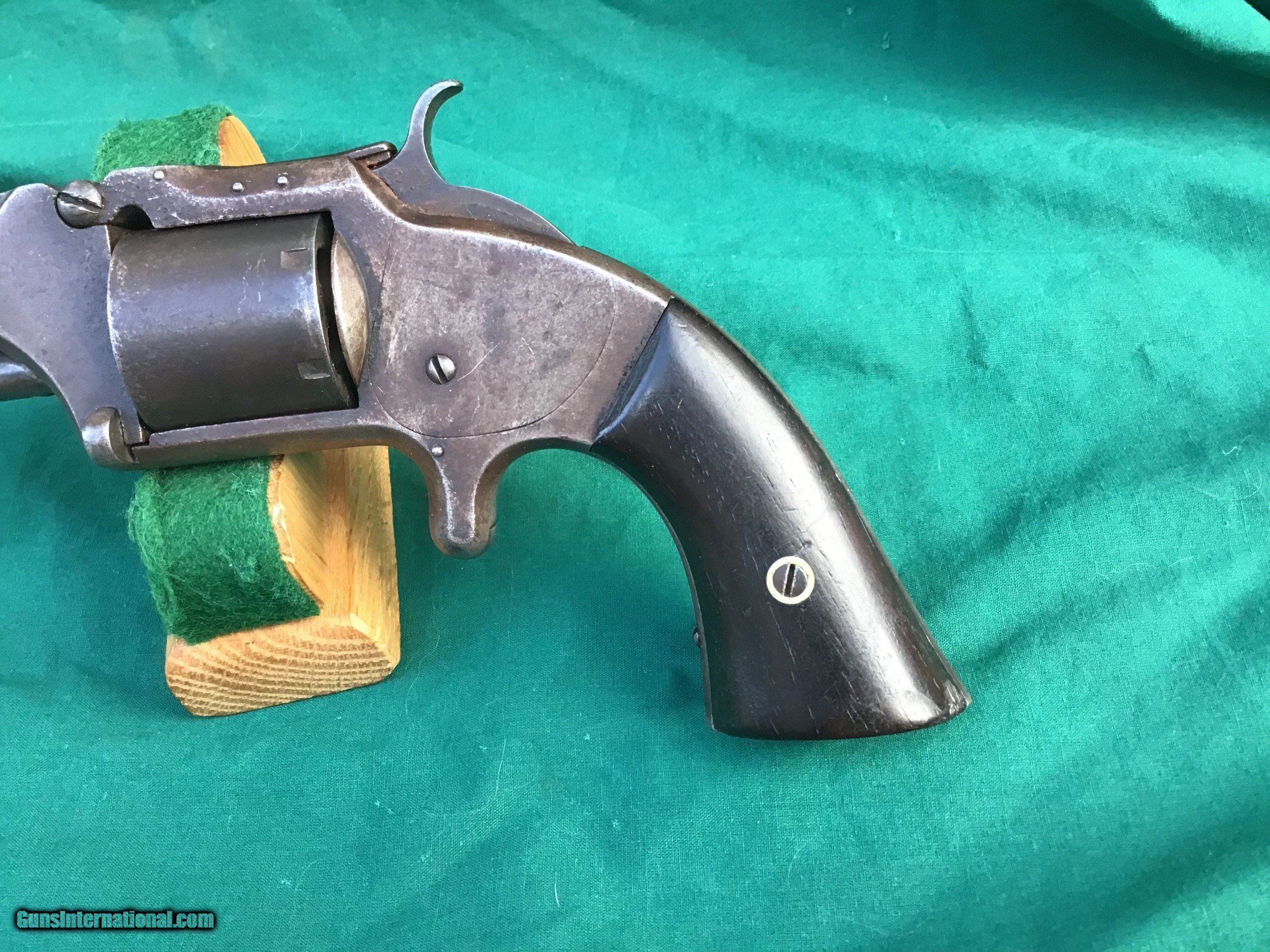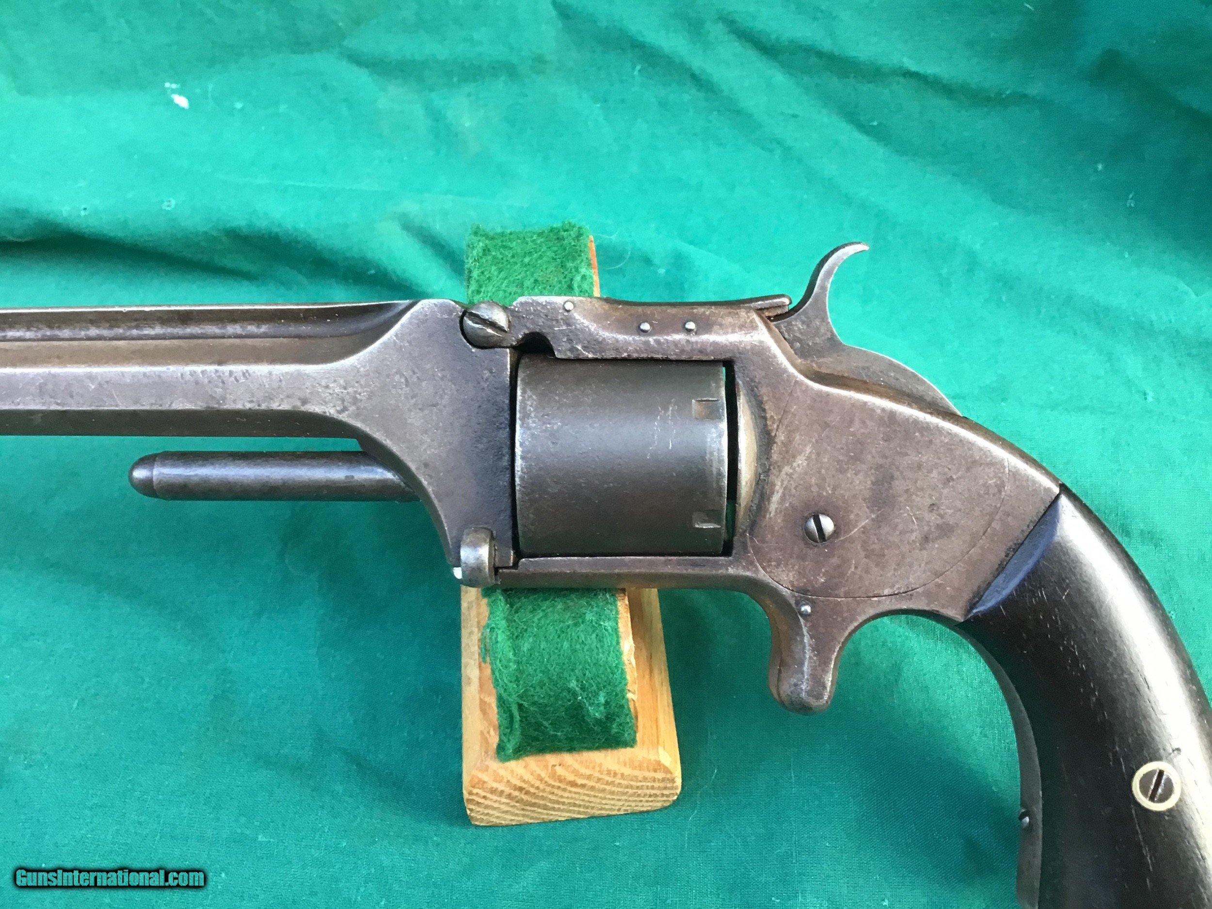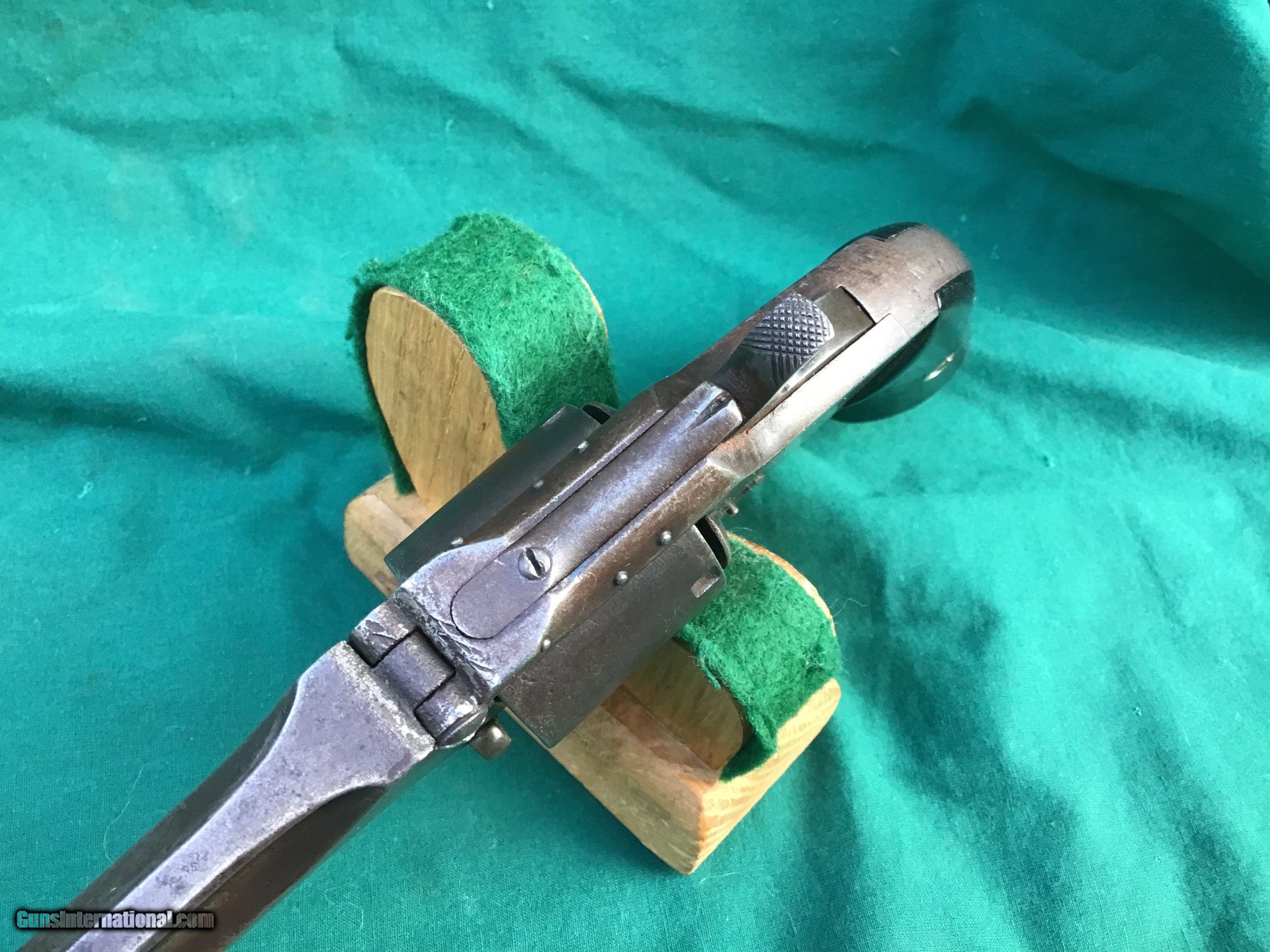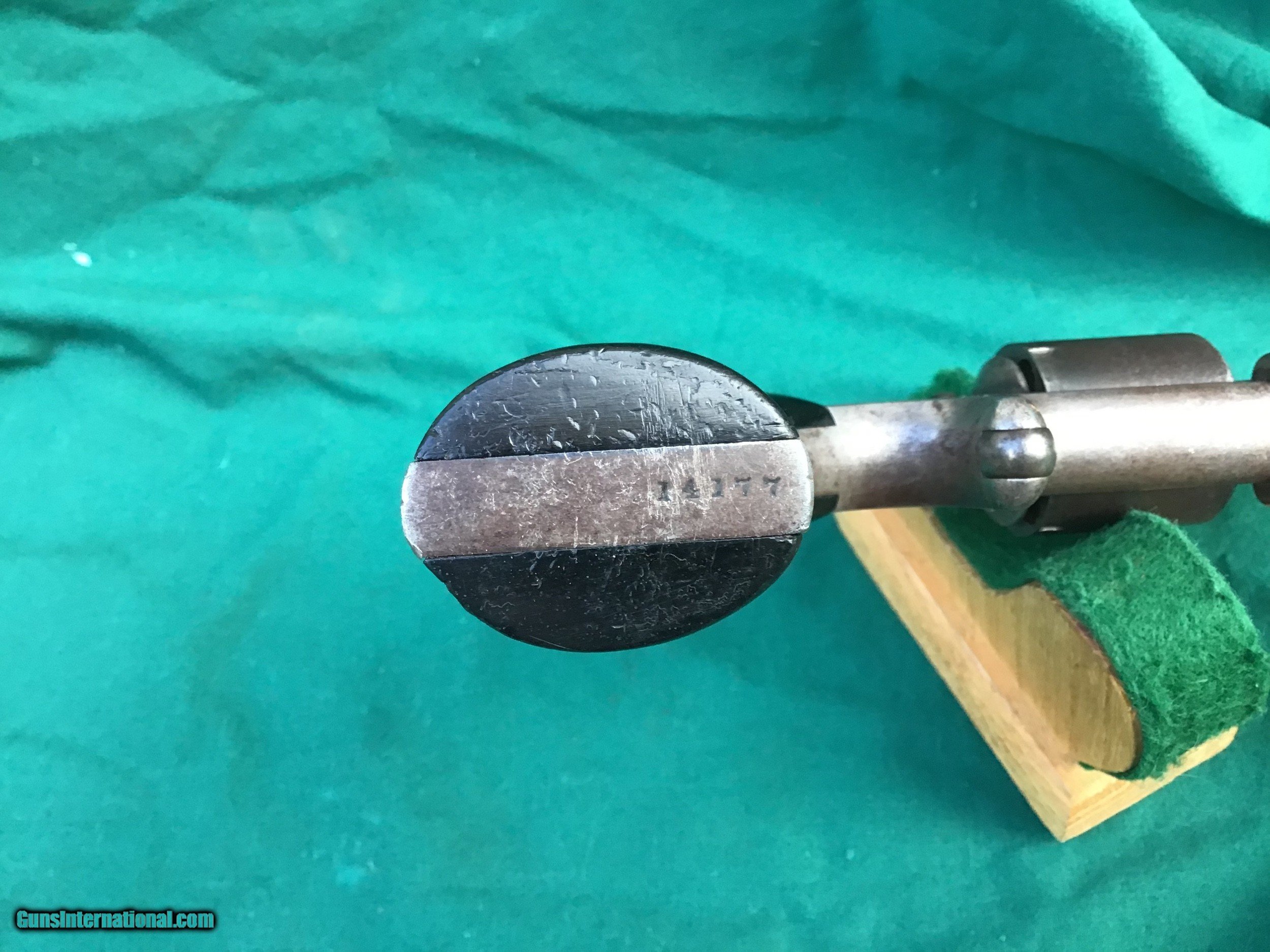 Description: Civil War Smith & Wesson No. 2 Old Army, 32 rimfire with 6” barrel. All matching, cylinder, barrel, grips, and back strap. Grips are in good condition. Action functions nicely and timing is very good. Cylinder locks up nicely. Overall finish is a nice brown / gray patina with some blue in protected areas. Very nice markings. Serial number 14,177. Hinge screw is a replacement. Barrel is wobbly and loose. See pics. Hinge area needs to be tightened. Antique and sold as a collectors item only. Not warranted safe to shoot. Please feel free to ask questions. SOLD Antique: Yes |