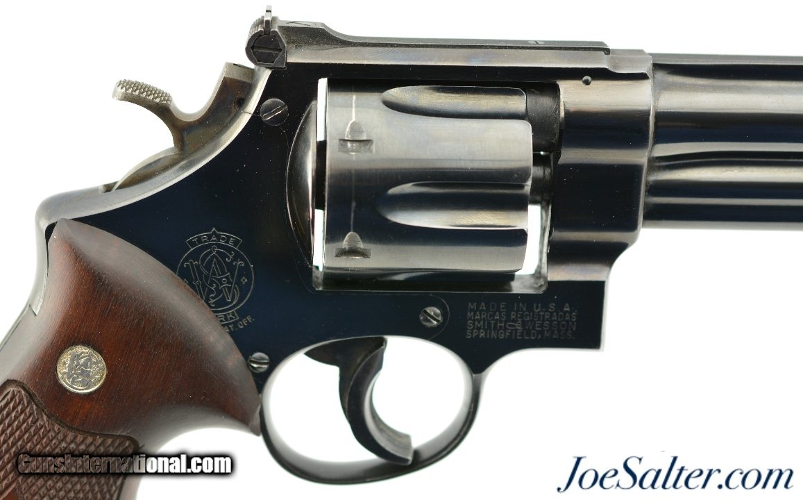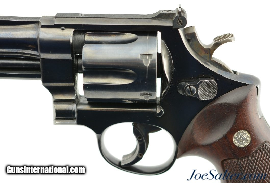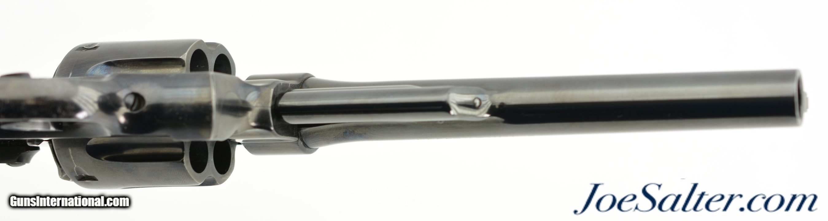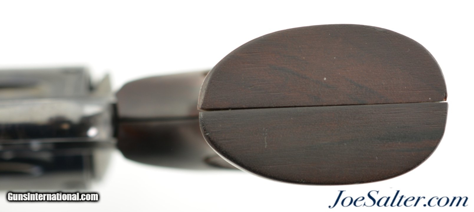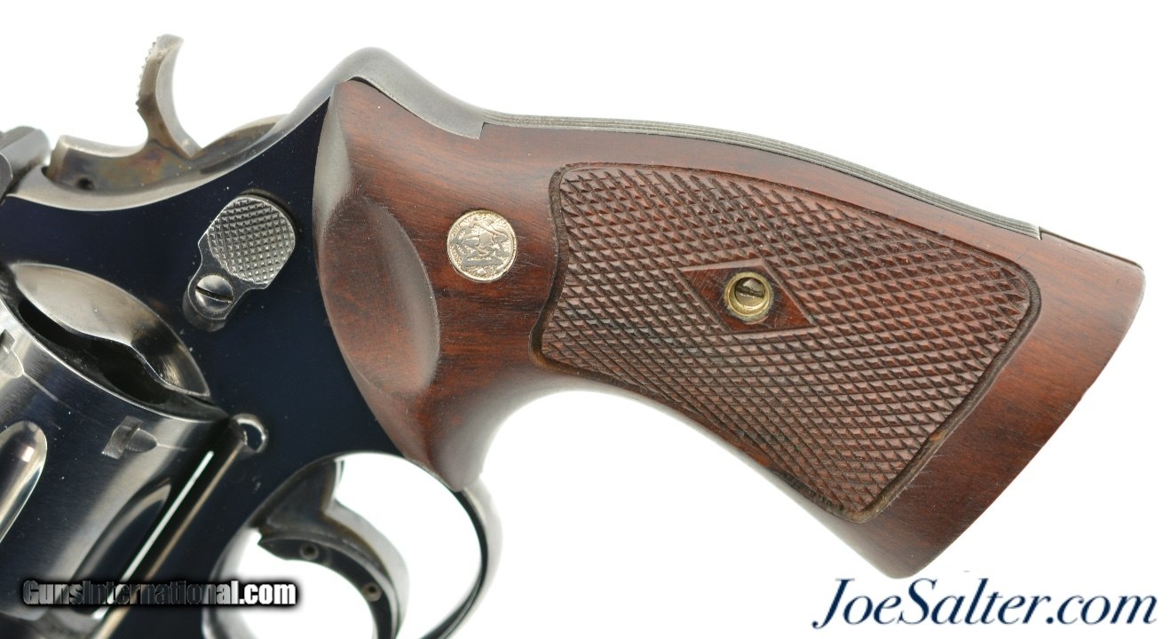 Description: Serial #S142002, .44 Special, 6 1/2" barrel with an excellent, bright bore. This is a handsome, five-screw frame example, made prior to 1956. Matching numbers are present on the frame, barrel, cylinder, yoke, and extractor, with the metal retaining 95-97% of the original blue finish. There is some mild silvering present at the muzzle, along a few of the high edges and projections, as well as a moderate turn-ring at the rear of the cylinder. The target hammer retains a commensurate amount of the original color case-hardening, while the trigger has a period trigger shoe installed. The unnumbered, diamond-center target stocks are in excellent condition with almost no wear or flattening of the points. The lock-up is tight and the action functions smoothly in both single and double-action. This is an excellent N-Frame .44 revolver made in the mid-’50s. FFL or C&R; SOLD Curio/Relic: Yes |