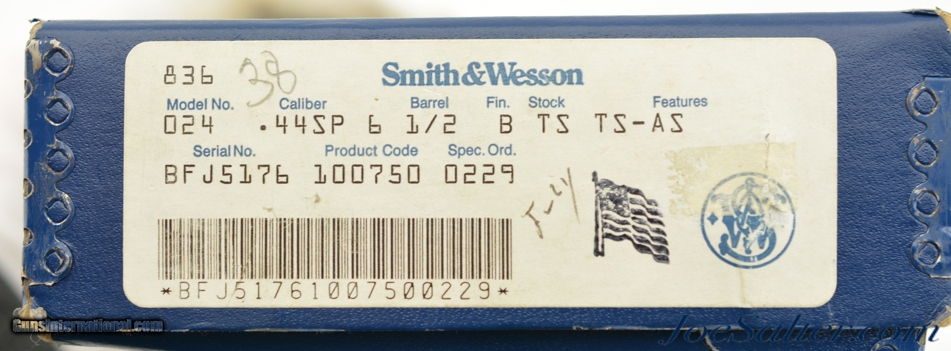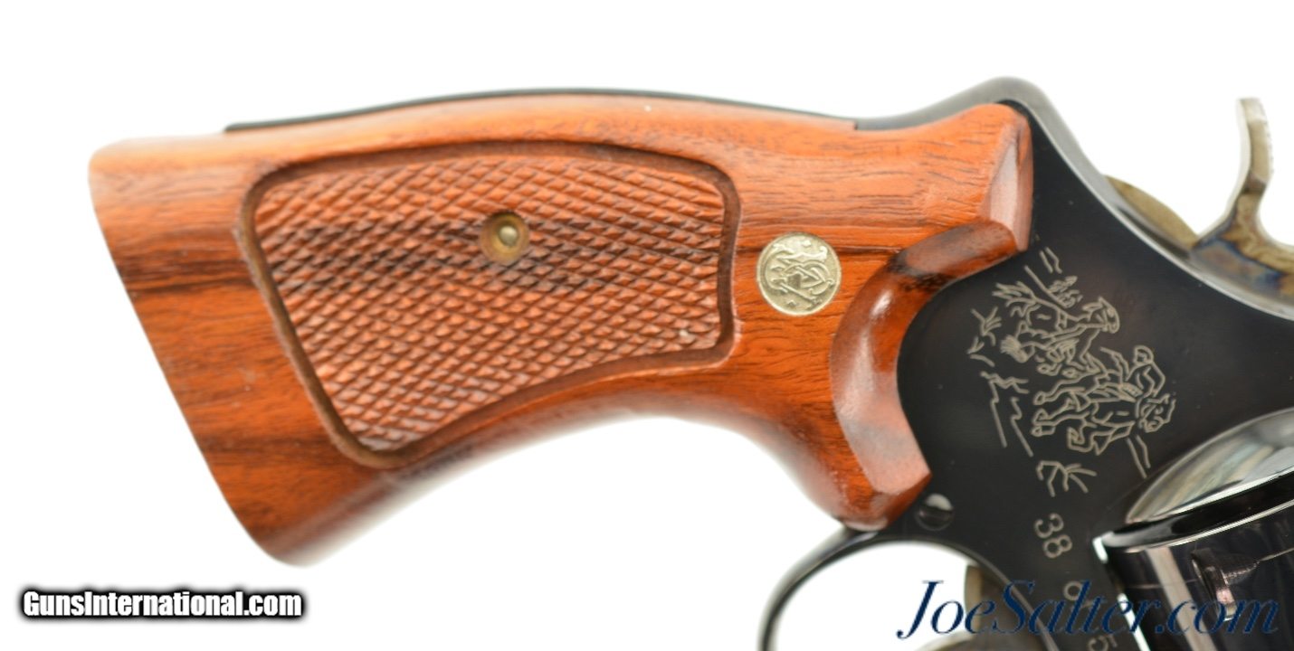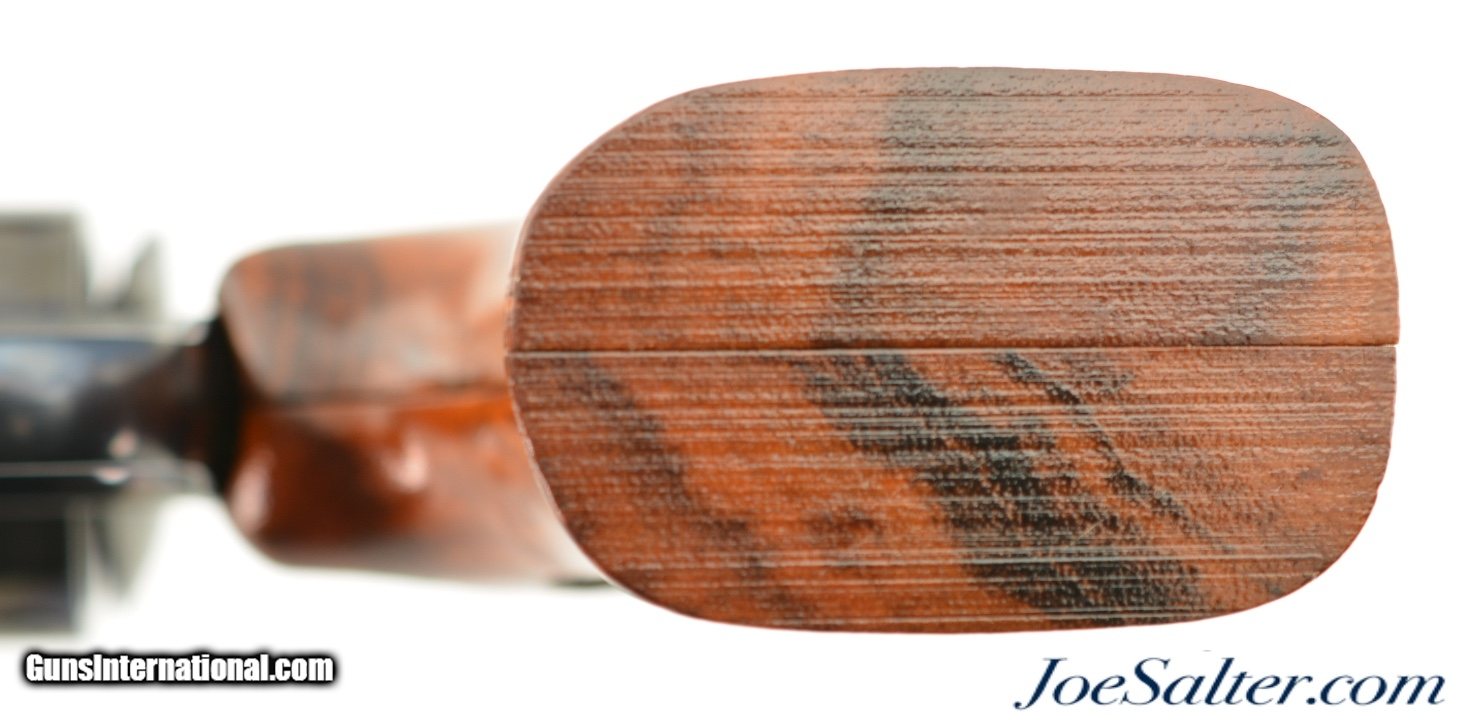 Description: Serial #BFJ5176, .44 Special, 6 ½ inch ribbed barrel with a bright, excellent bore. This is the Model 24-4 revolver manufactured by Smith & Wesson in 1990 as part of the "Twelve Revolvers" limited edition series for Ellett Brothers of Chapin, South Carolina. Each of the firearms featured an action scene engraved on the sideplate based upon early S&W advertising paintings and was numbered and sold as a one a month set. The production run of 500 was never completed and some individual revolvers along with full sets were produced. This revolver is numbered 38 of 500 on the frame next to a horse mounted person shooting a revolver and is entitled on the barrel "THROUGH THE LINE". IN excellent condition the barrel and frame show virtually all, 97-98% of the original blue finish with only a light drag line on the cylinder. The serrated trigger and target hammer show vivid case-colors. The S&W medallion target stocks are excellent. It comes in the original two piece blue box numbered to the gun and includes the manual, cleaning tools, and paperwork. A rare 24-4 revolver only produced for this series in excellent condition. FFL Price: $1,595.00 Contact Seller |