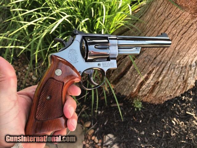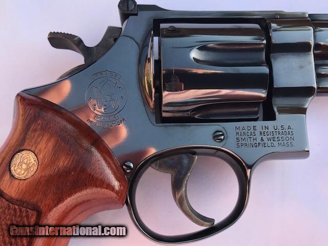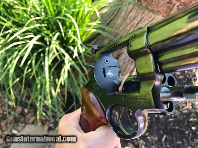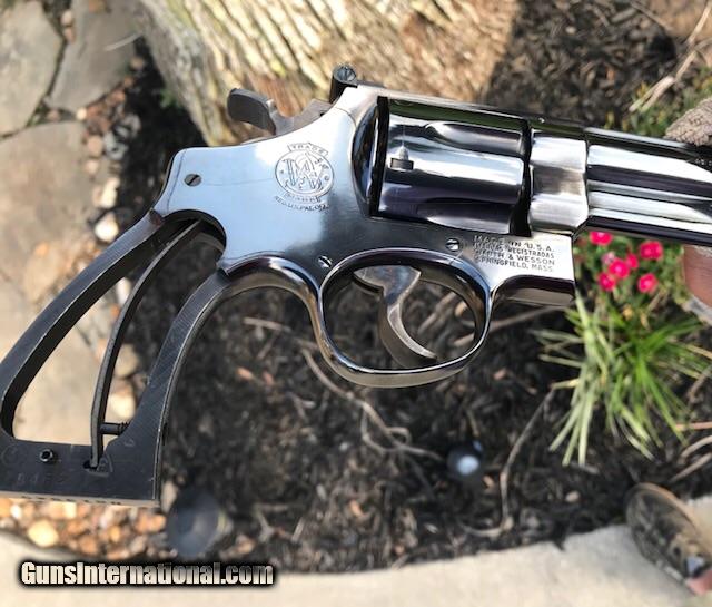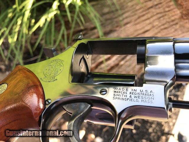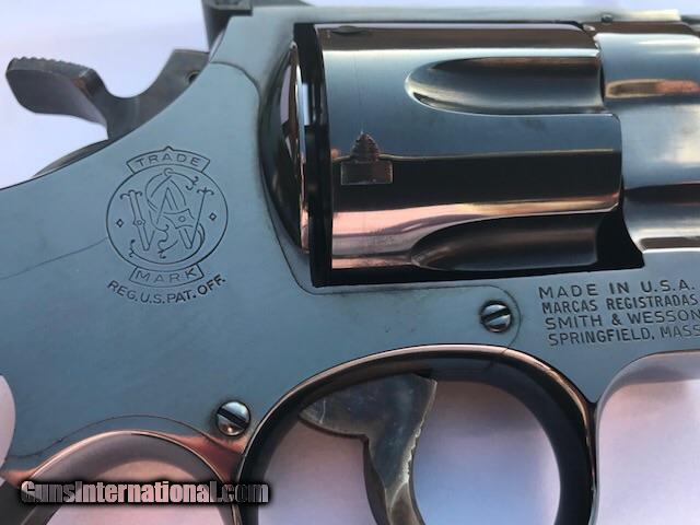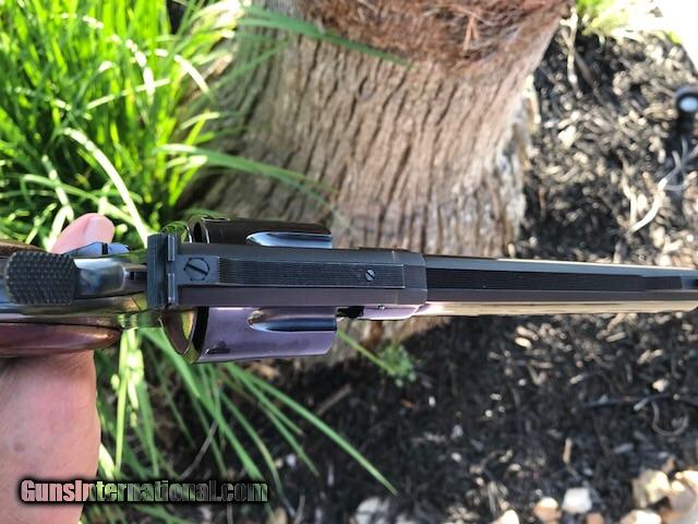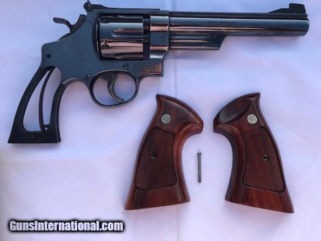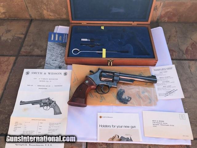 Description: Factory fired only, this absolutely beautiful Smith and Wesson Model 25-2 of 1955 is basically new old stock that has been sitting in a safe since 1979. It has the rarer and more desirable 6.5 inch barrel which adds a premium to its value. Chambered for 45 ACP or 45 Auto Rim this beauty has all the target features to include target grips, hammer and trigger. These guns are known for their accuracy and I have no doubt this one should perform well if the new owner chooses to fire it. The action and trigger pull is amazing and lockup is tight.it comes as pictured with all the factory paperwork, tools, moon clips, and Mohogany Presentation Case as pictured. The bluing is spectacular with only one handling mark on the right side of the receiver which does not penetrate the bluing and is mostly covered by the right grip panel. It ha the usual light turn ring on the cylinder. This is a real gem that would enhance any collection. There is a three day non firing and non disassembly inspection period from the day received by your FFL. Payment by US Postal Money Order only please. SOLD Manufacturer: S&W Model: 25-2 Serial Number: N613645 Caliber Info: 45 ACP Condition: Like New Metal Condition: Excellent Wood Condition: Excellent Bore Condition: Excellent Triggers: Target Stock: Wood Targets Finish: Blue Manufacture Date: 1979
