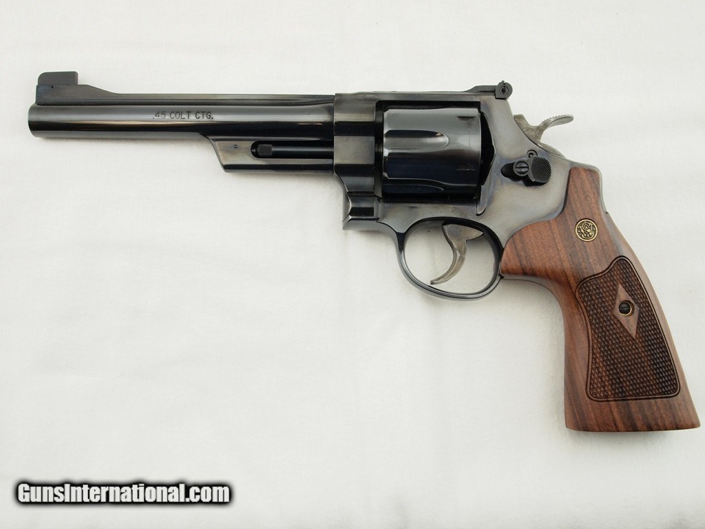 Description: S&W 25-15 .45 Colt WBox, 6 1/2" serrated rib bbl, bright shiny bore, good rifling, blued finish, adjustable square notch rear sight, blade front sight, color case hardened target trigger - target hammer, extremely light handling marks, and very nice diamond checkered grips with inset S&W medallions. Super clean! Add 3% for Credit Card Shipping $25.00 SOLD |