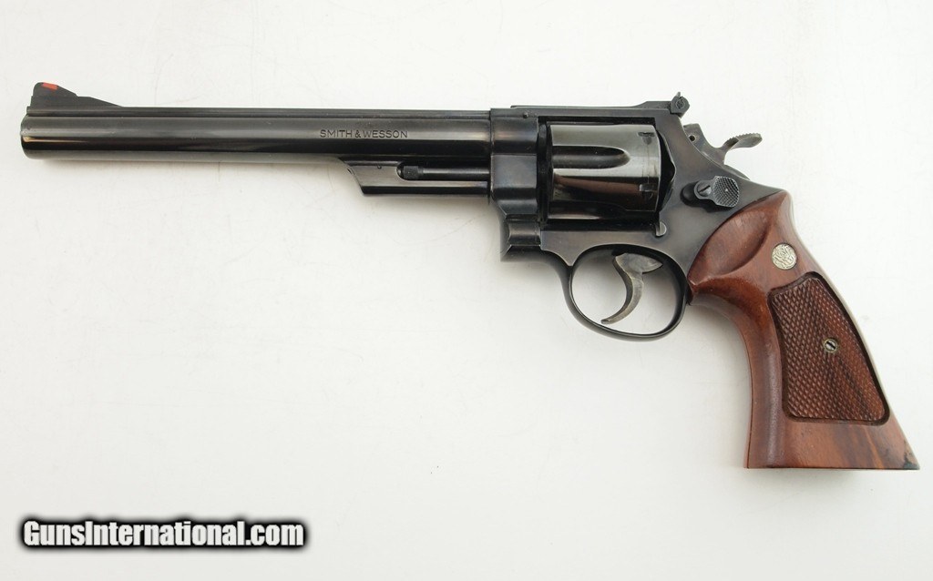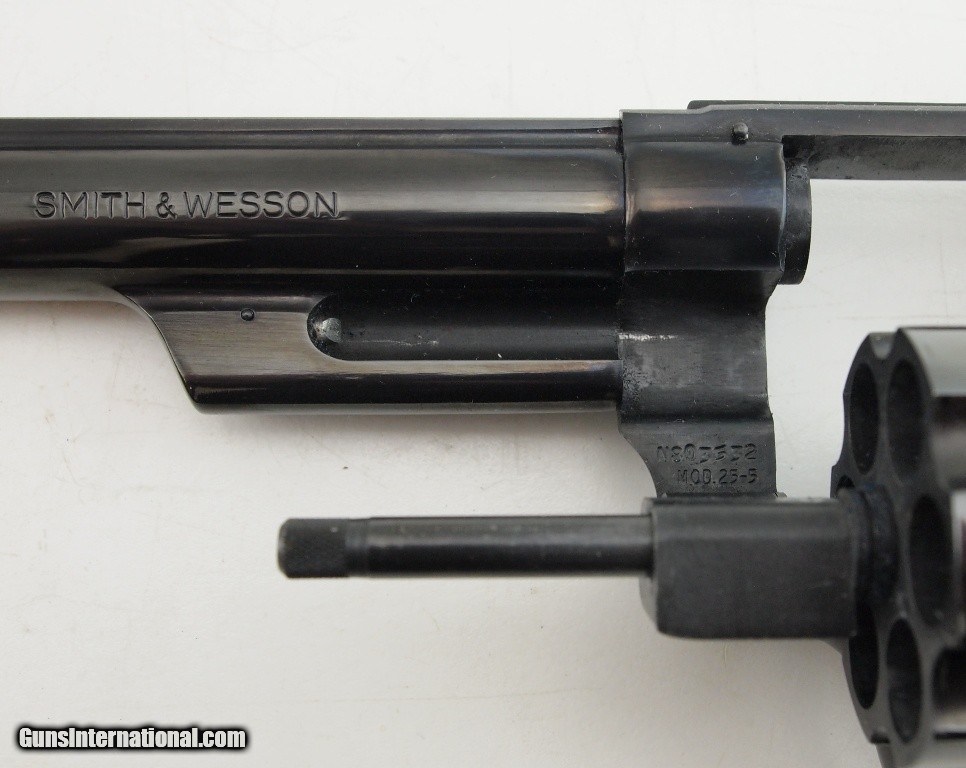 Description: Very nice S&W 25-5 .45 Colt, 8 3/8" serrated rib bbl, bright shiny bore, good rifling, blued finish, white outline horseshoe rear sight, red ramp front sight, color case hardened target trigger - hammer, very light handling marks, and checkered grips with inset S&W medallions. Great revolver for your collection. Add 3% for Credit Card Shipping $25.00 SOLD |