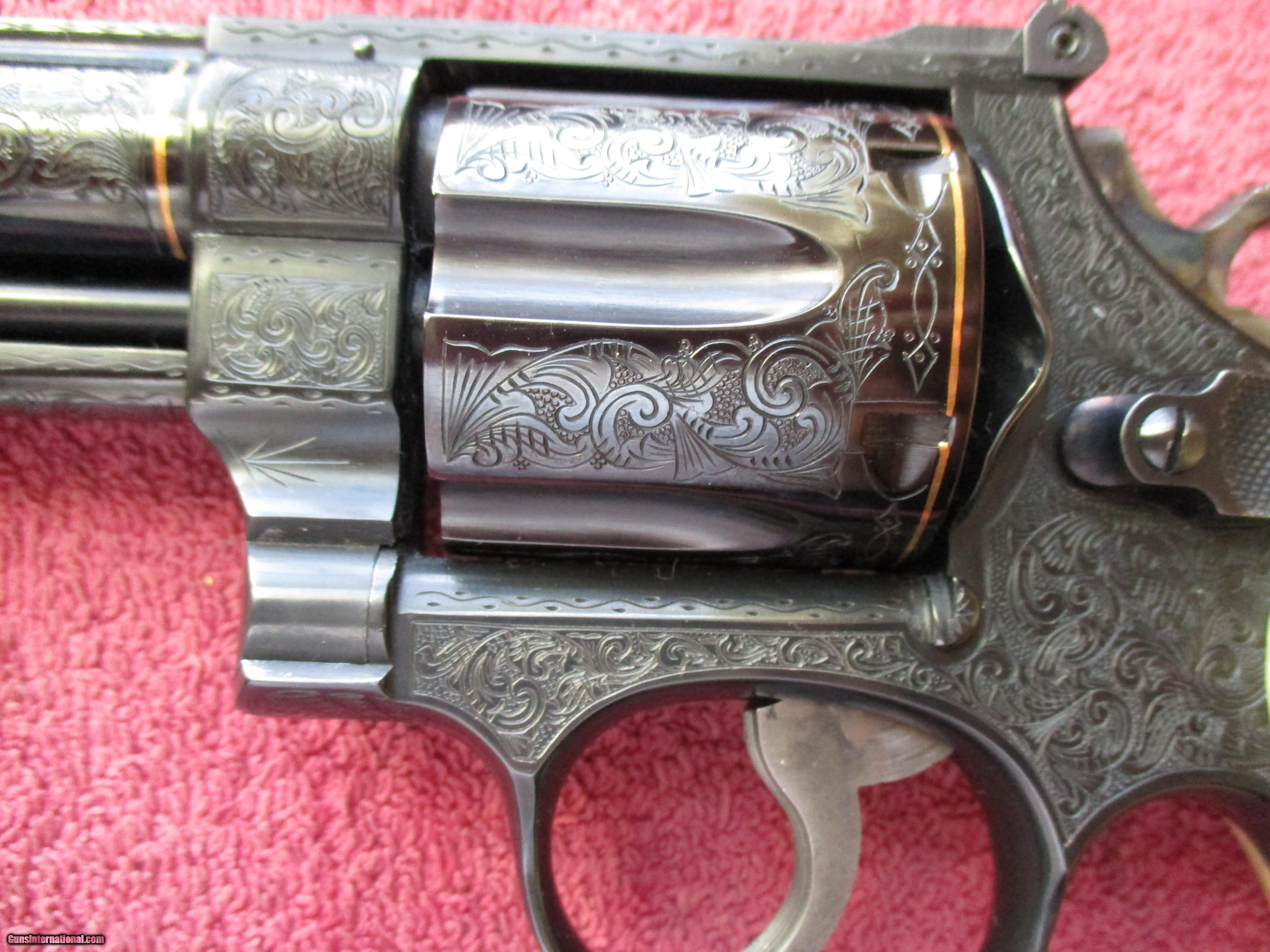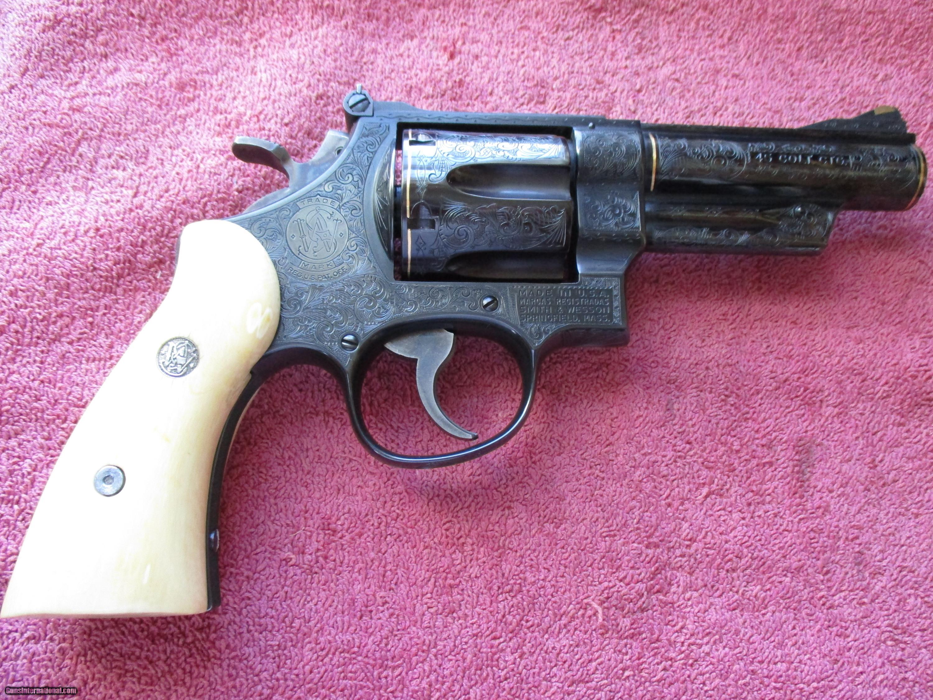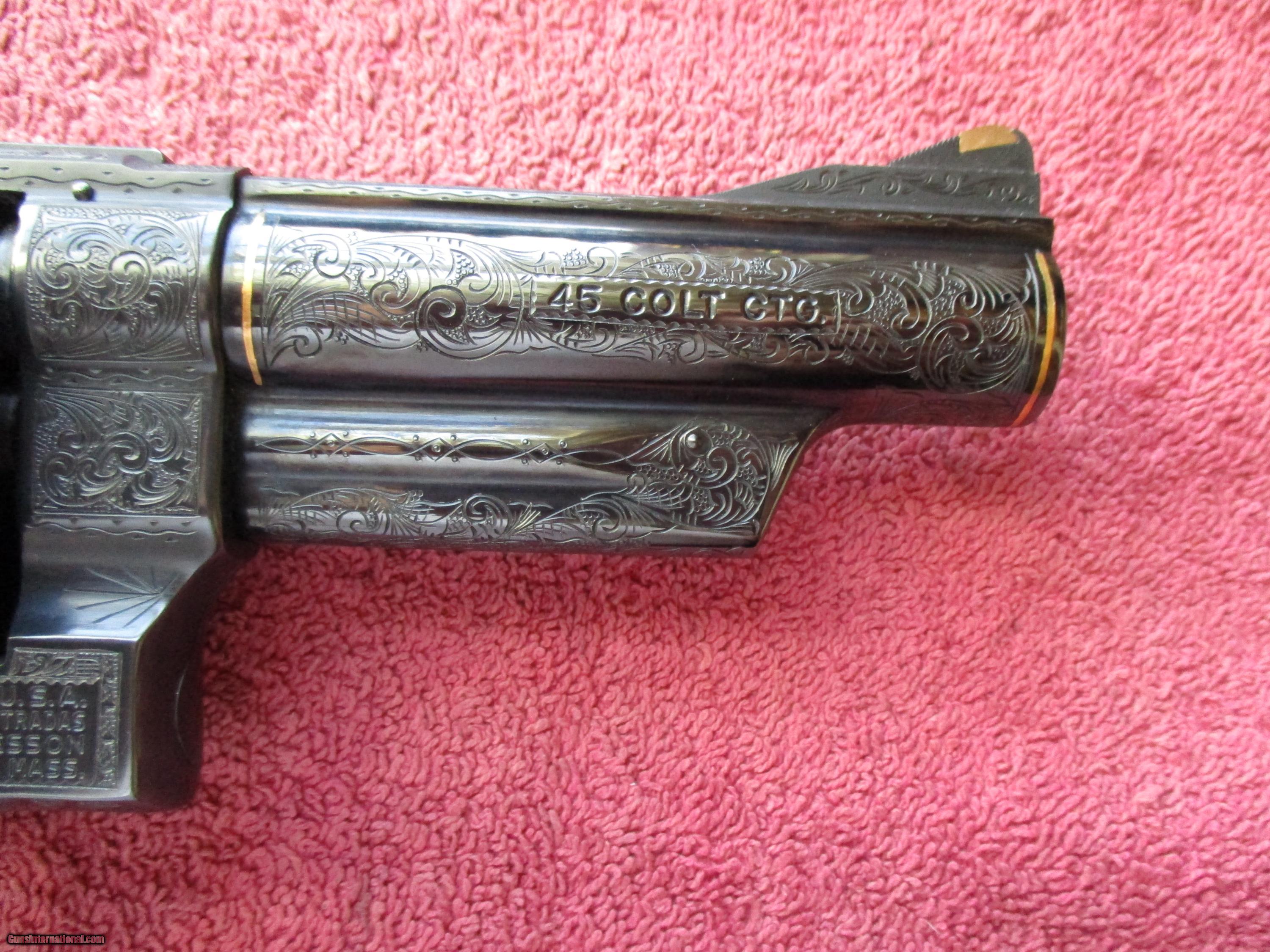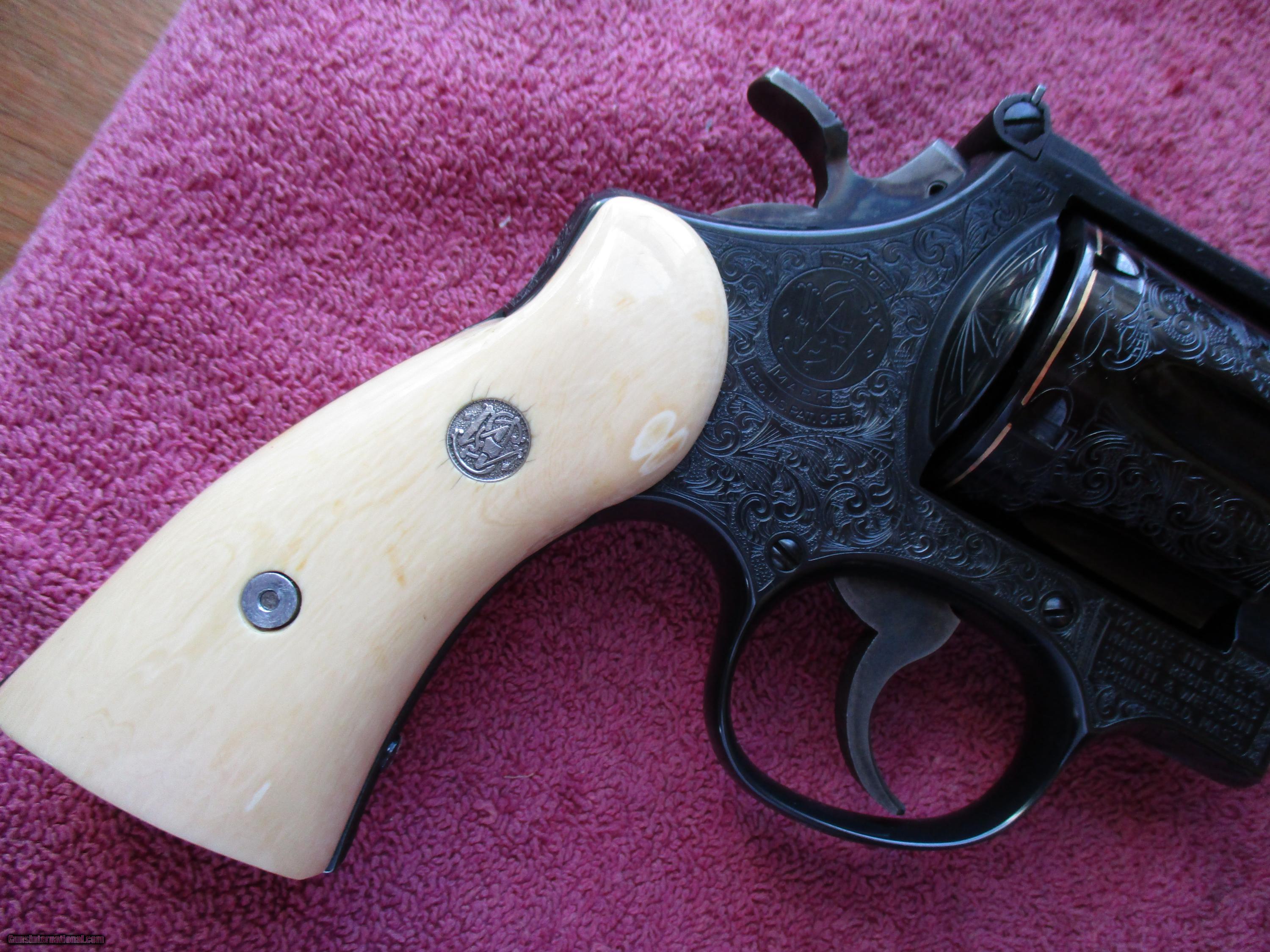 Description: I have for sale a Wonderful Smith & Wesson Model 25-5 Model of 1955 .45 Target Revolver. Blue 4" BBl. .45 Colt Caliber MFG in 1978 and was Engraved in 2005 by Master Engraver Michael Gouse of Montana, with full coverage fancy scroll engraving with Gold Inlays and 2-piece Real Ivory Stocks with Silver S&W Medallions. This Beautiful N-frame Revolver was Engraved in 2005. Beautiful Blue Finish with Fire Blued screws. Wonderful Ivory Stocks. Mint Over all Condition Mirror Bore, tight lock up appears to be unfired since it was Engraved. Perfect for your collection or to use and enjoy. Great Price! $35.00 Shipping & insuirance to your FFL. Ask about our Free Layaways! SOLD |