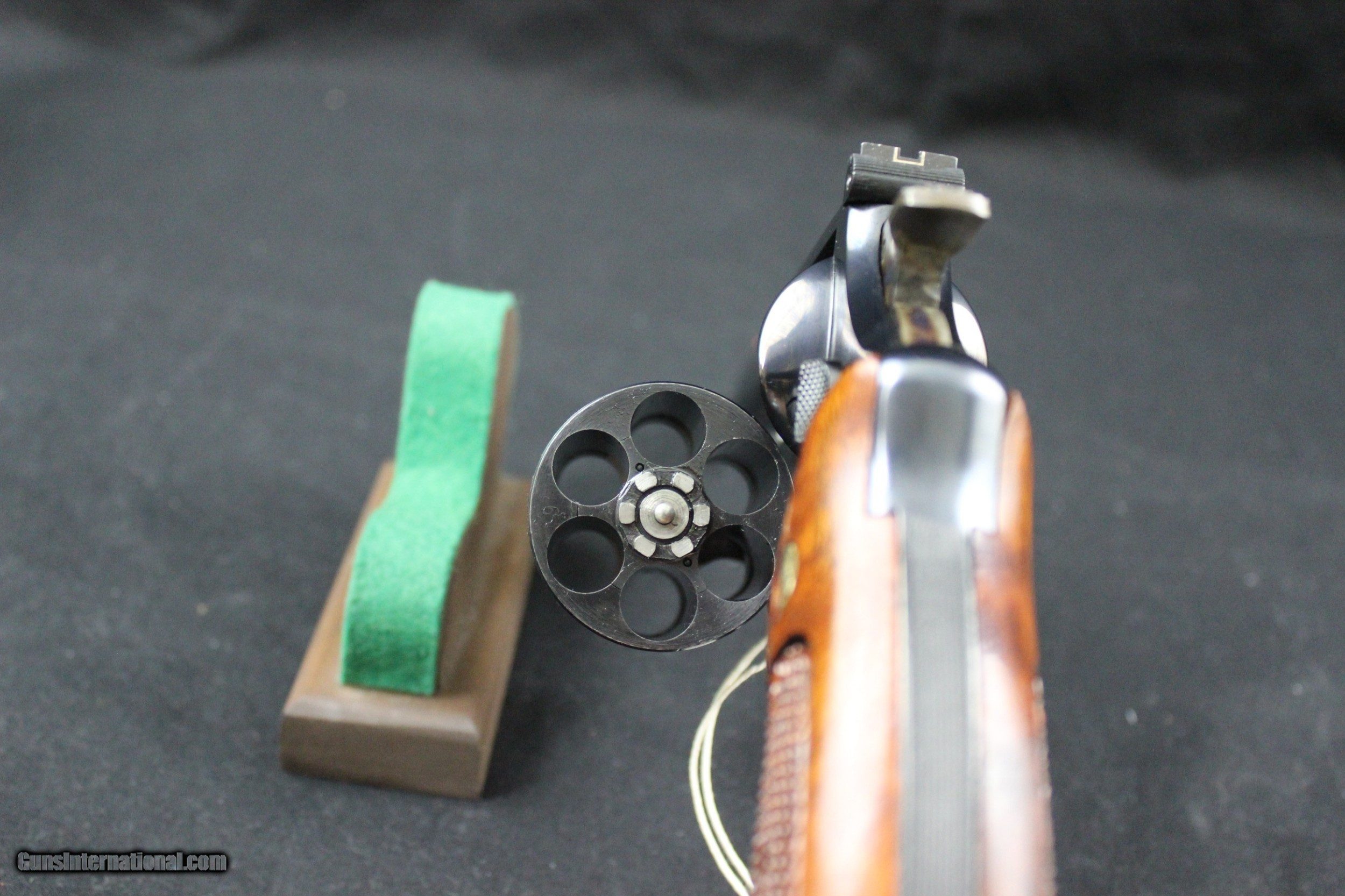 Description: 45 Colt, 6" pinned heavy barrel with an excellent bore. This lovely 1980 made revolver remains in wonderful condition. The metal surfaces retain about 99% plus original blue finish with a light turn ring on the cylinder and a few stray thin scratches. The checkered goncalo alves factory target grips with silver S&W medallions rate excellent. The .500" target hammer and .500" target trigger retain bold case-hardened colors with light operational wear. This big "N" frame features a red ramp front sight, white outline micro adjustable factory rear sight and excellent mechanical operation. The 45 Colt heavy targets were made in lesser quantities compared to its 45 ACP counterparts and have garnered strong interest from collectors and "wheel gun" aficionados. SOLD |