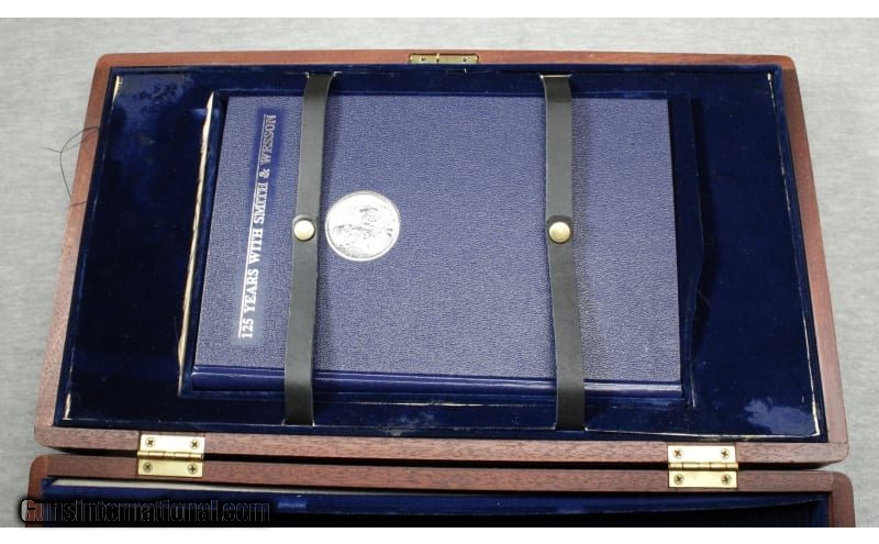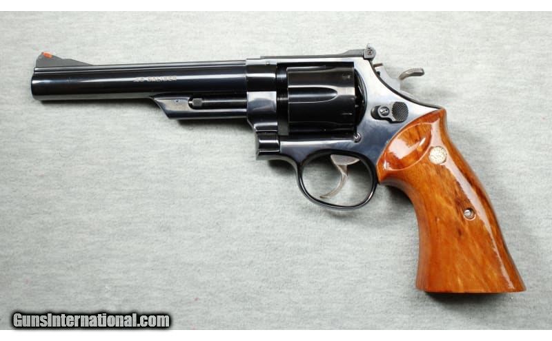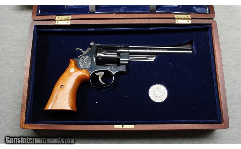 Description: Appears as new, comes with display case. S&W large frame revolver, 6 1/2" barrel with shrouded ejector, polished blue finish, double and single action trigger, 6 shot fluted cylinder, wide target trigger & hammer, adjustable sights and factory smooth wood grips. None SOLD Chambers: Revolver Metal Condition: As new Bore Condition: Bright Barrels: 6 1/2 Triggers: Double and single action Butt Pad: Wood grips Sights: "Adjustable rear, red ramp front sights Item Location: La Vista, NE |